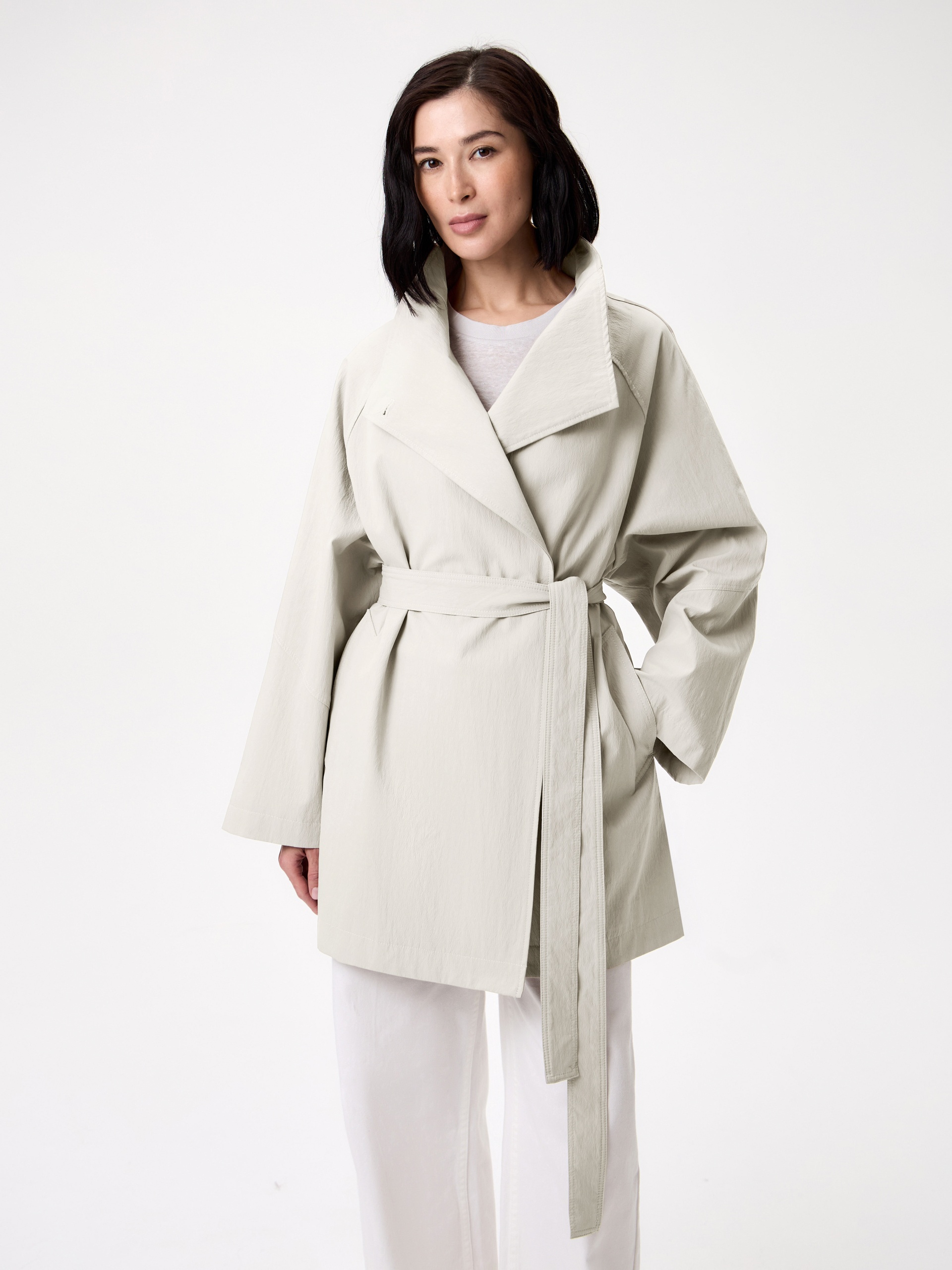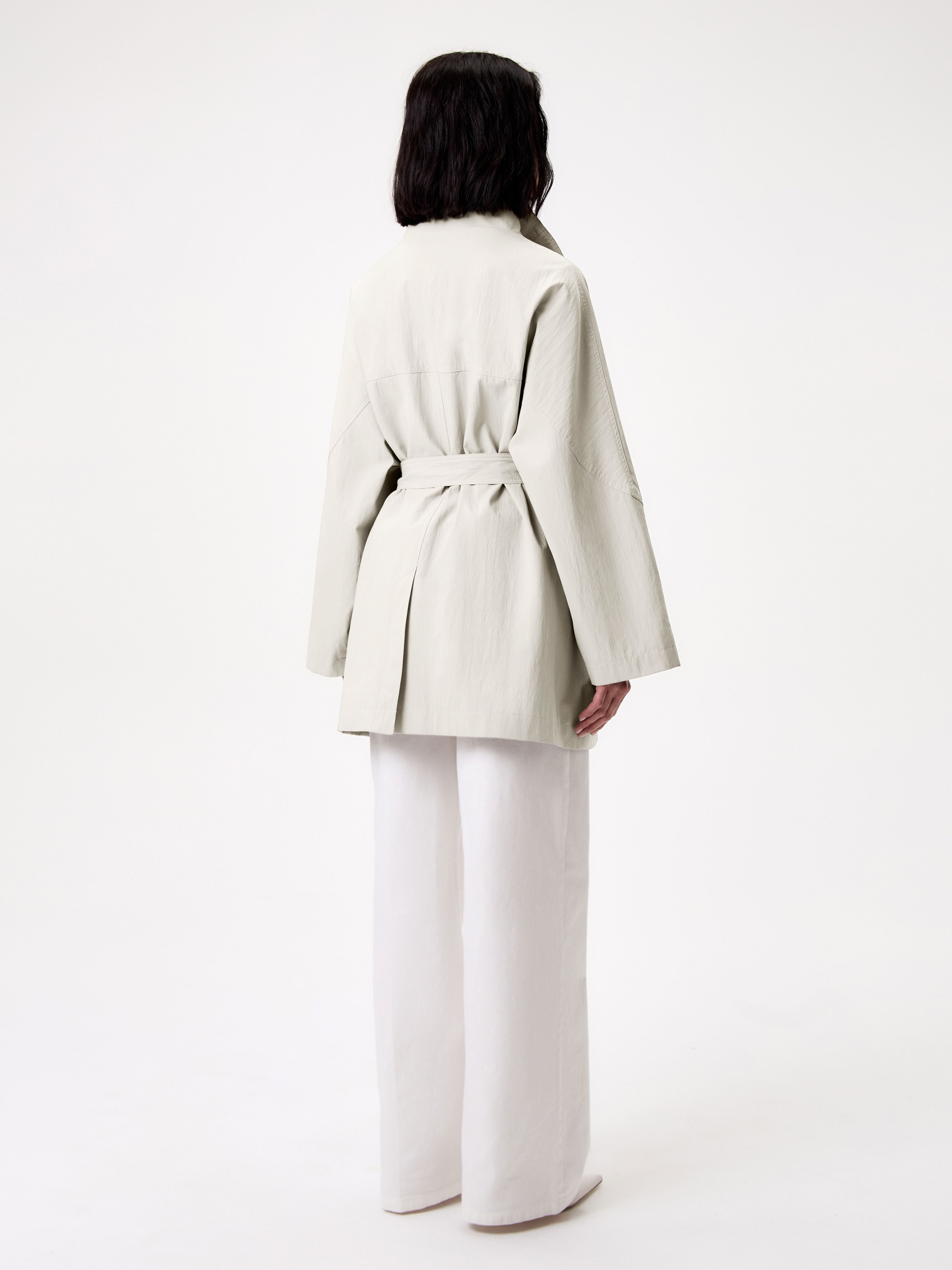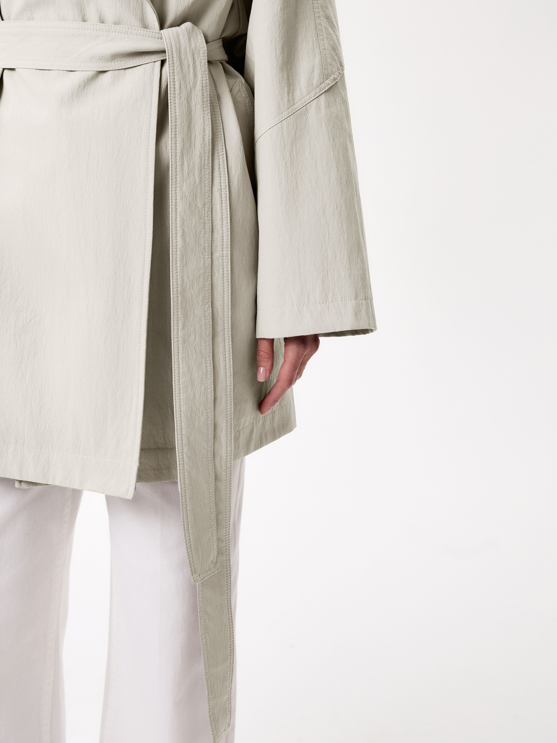 Must have сезона - укороченный плащ в светло-сером цвете с асимметричным воротником-стойкой. Плащ выполнен из премиальной хлопковой плащевой ткани с водоотталкивающим покрытием. Уникальный покрой рукава-реглан на спинке переходит в широкую кокетку. Спереди на рукавах декоративные швы, имитирующие широкие манжеты. По бокам расположены глубокие карманы с листочками. Завершают изделие двойные отделочные строчки, а также пояс из основной ткани. В комплект к плащу предлагается удобная и вместительная сумка-хобо из основной ткани, идеально подходящая к любому весеннему образу.