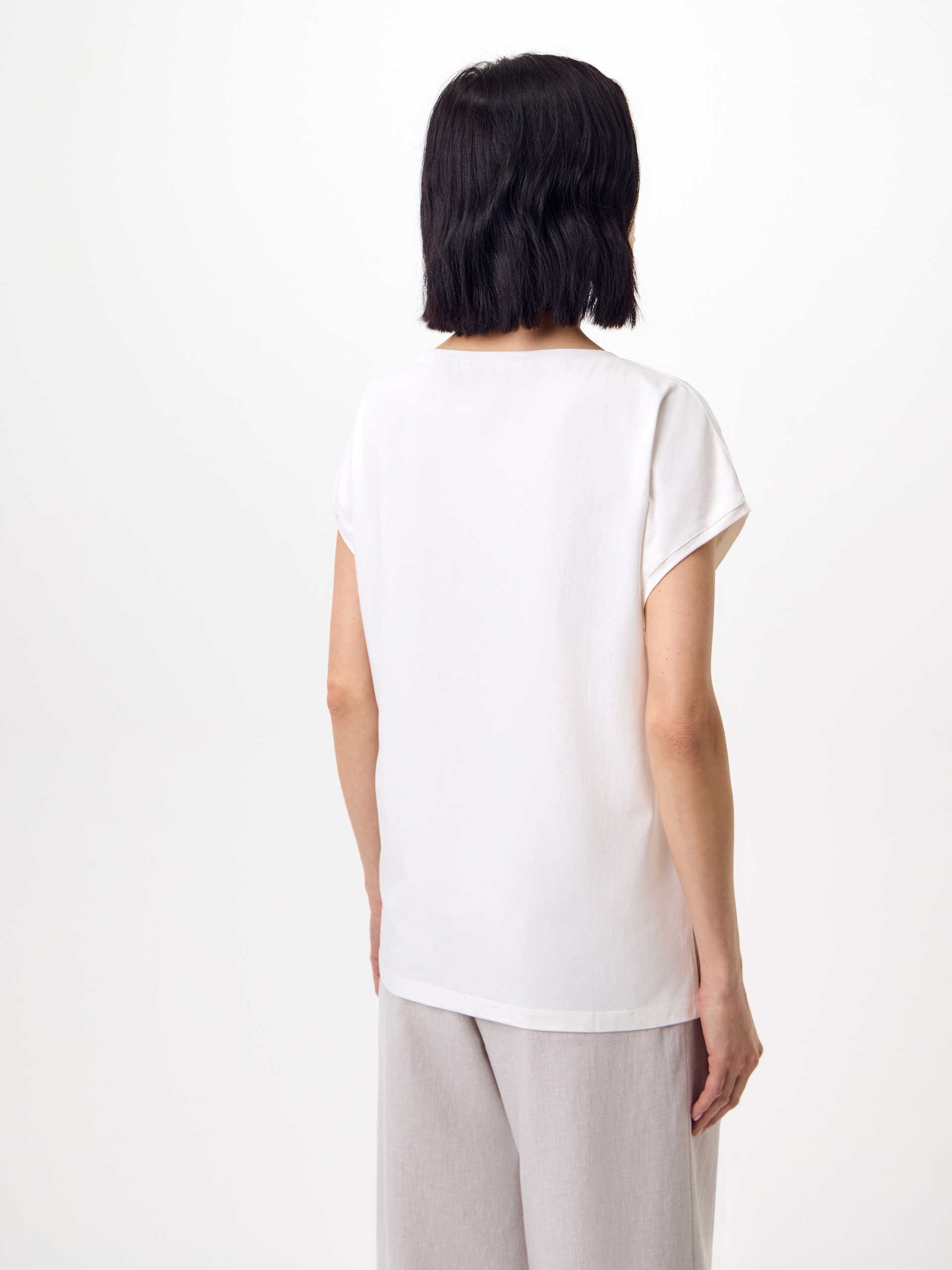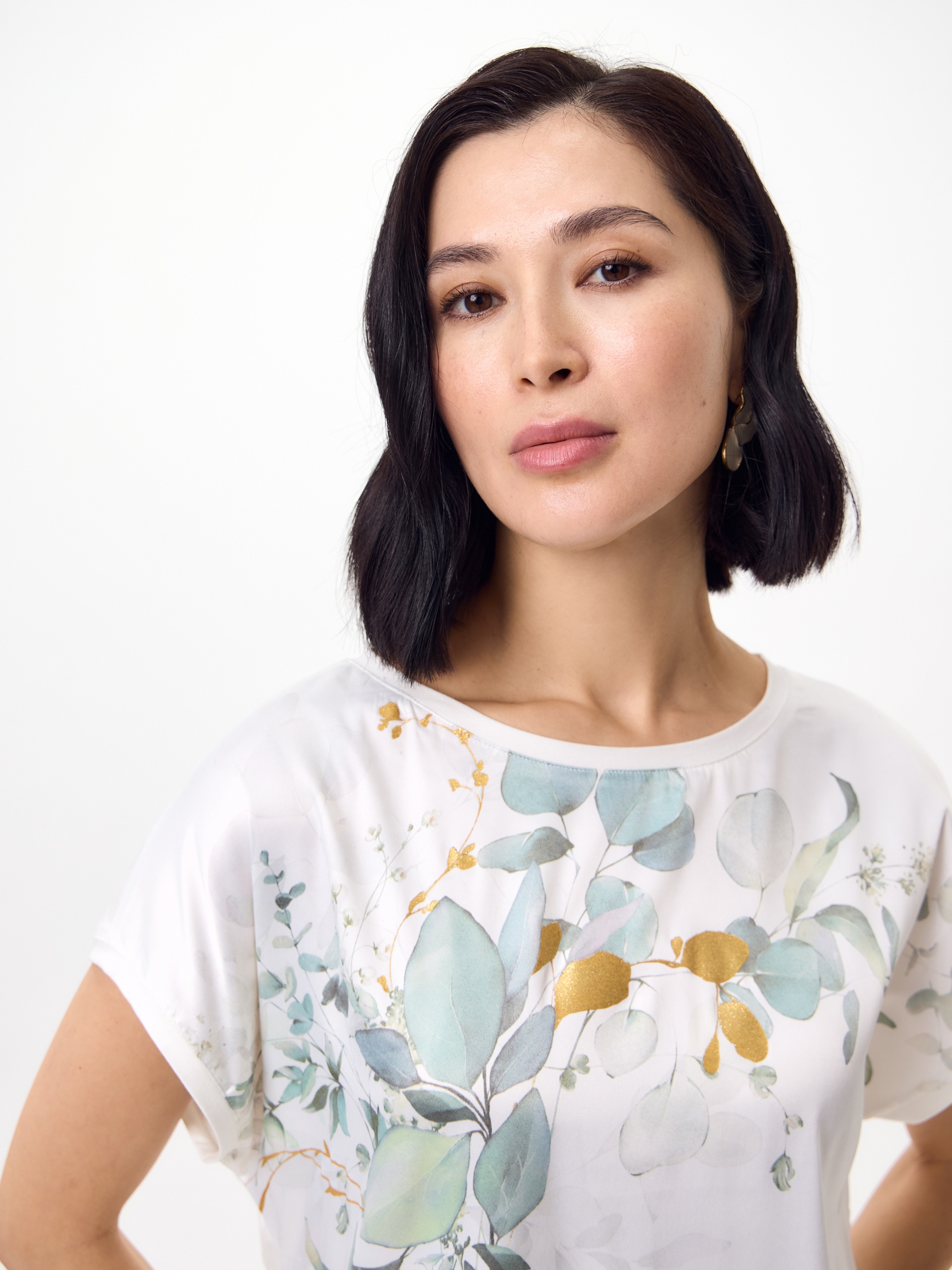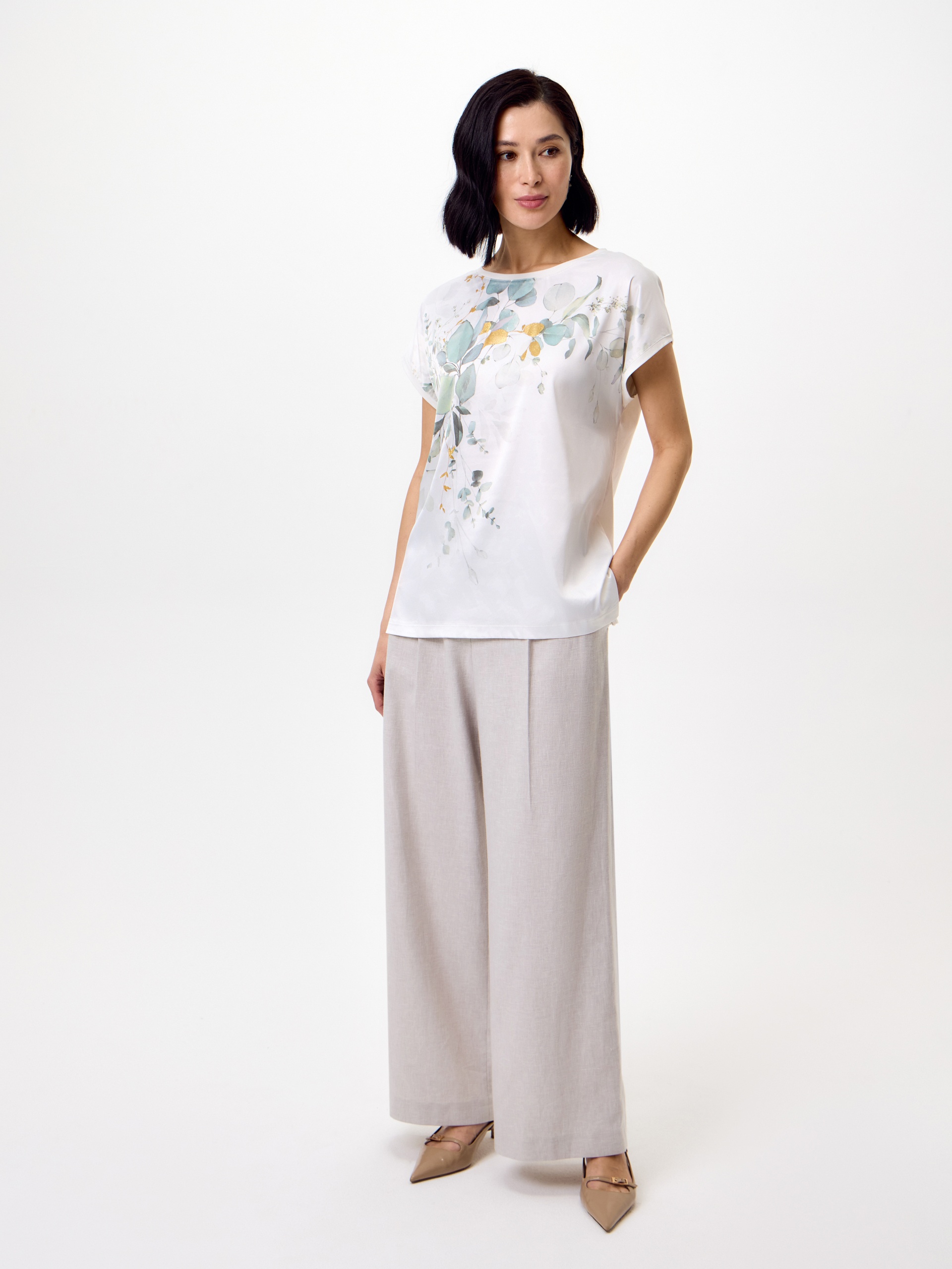 Блуза в стиле смарт-кэжуал, прямого силуэта. Вырез горловины — лодочка. Рукав кимоно. Полочка из атласной белой ткани с растительным принтом с золотыми вставками фольги. Спинка из трикотажного полотна.