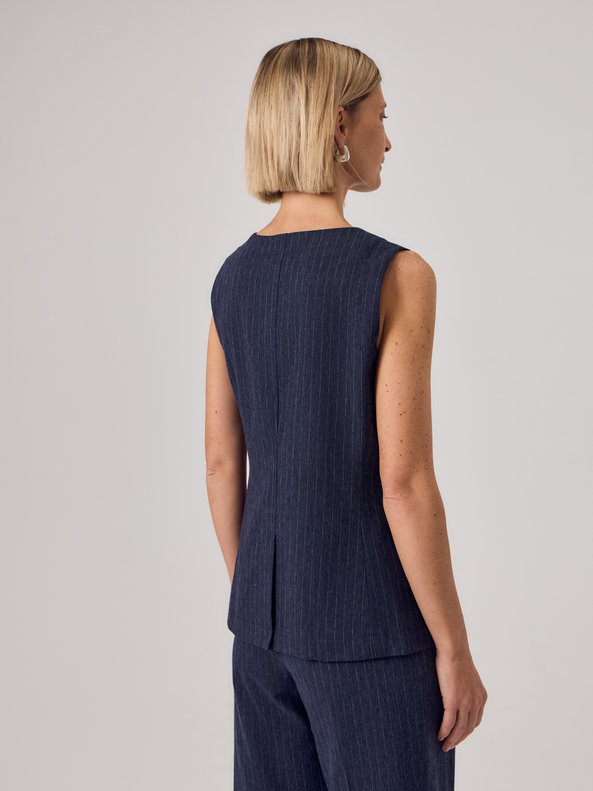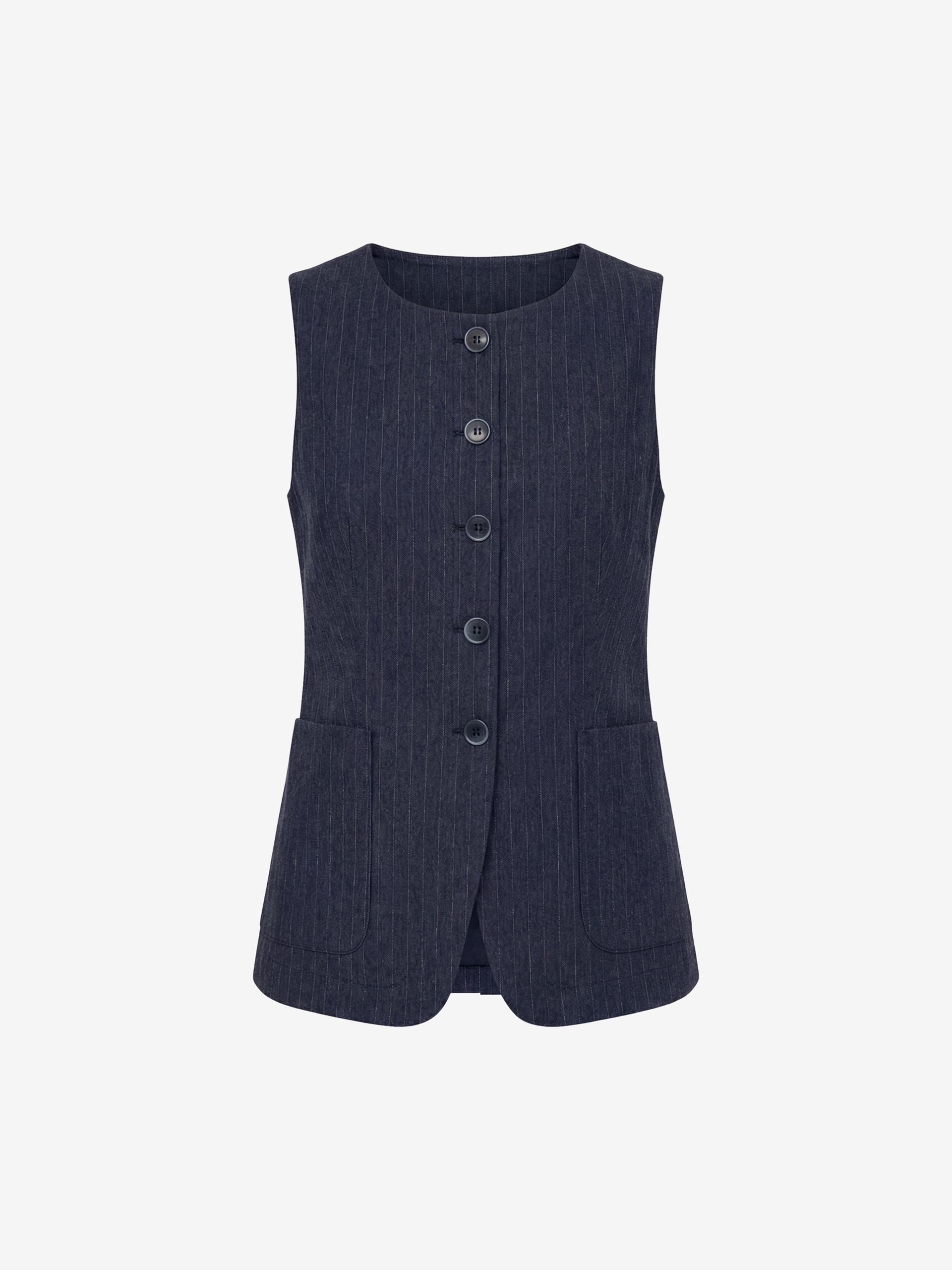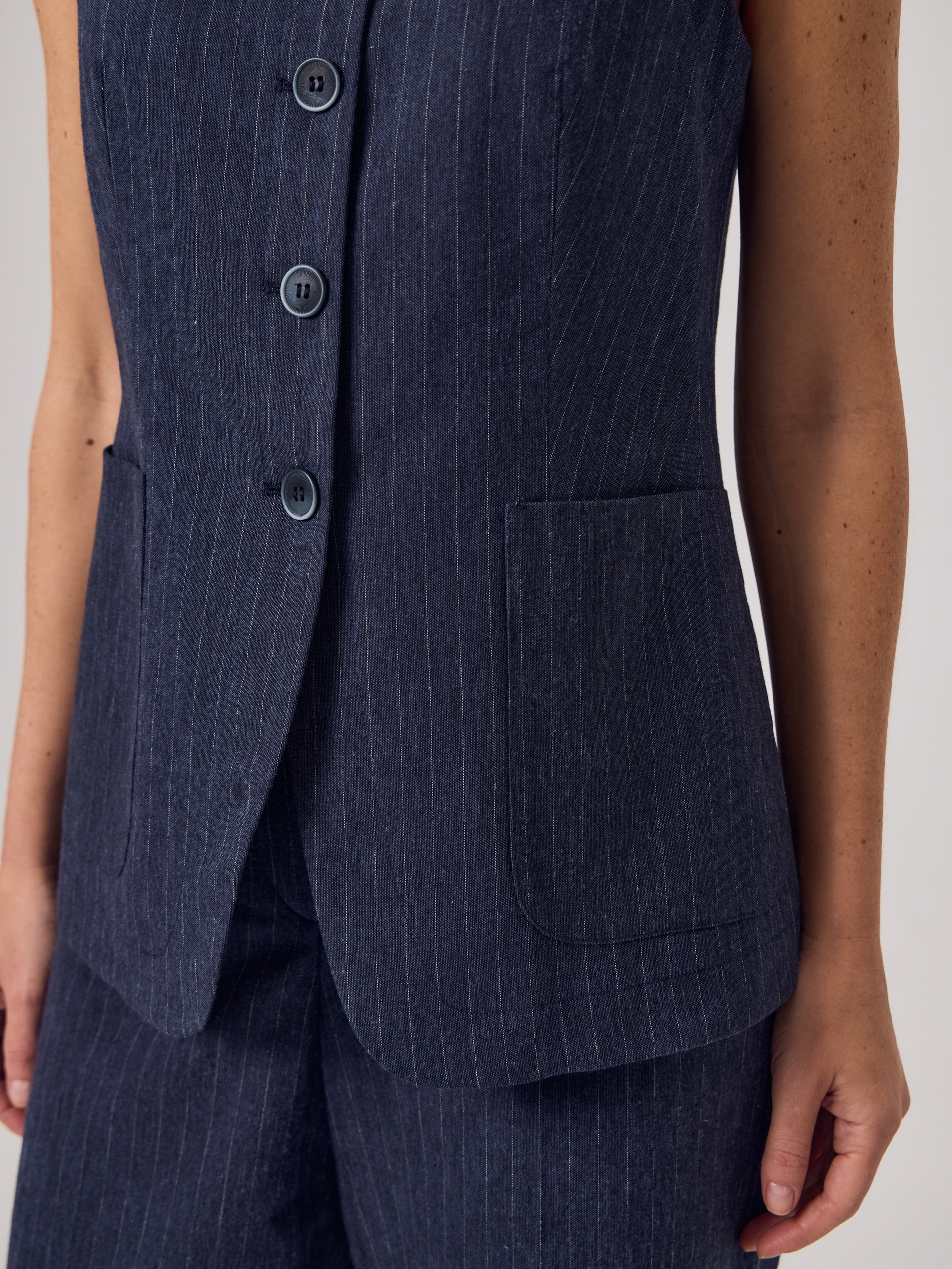 Полуприлегающий удлиненный жилет с круглой горловиной из 100% хлопка темно-синего цвета с серой полоской. На полочке накладные карманы. Составит идеальную пару с брюками из одной ткани для вашего летнего гардероба в офис.