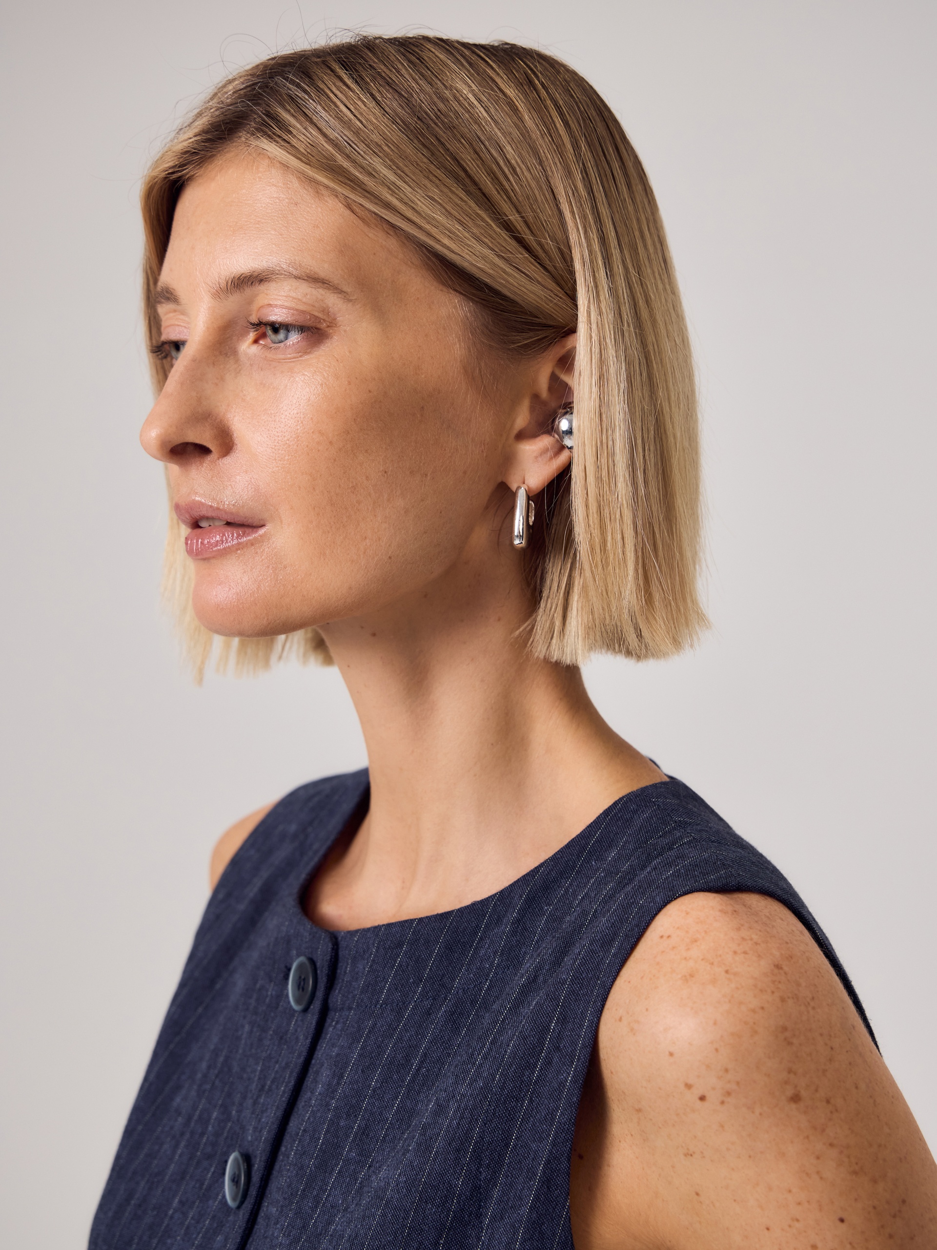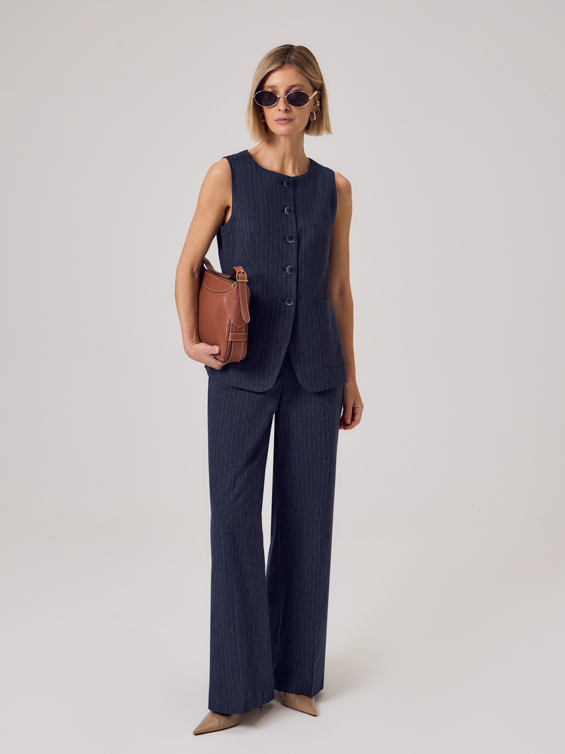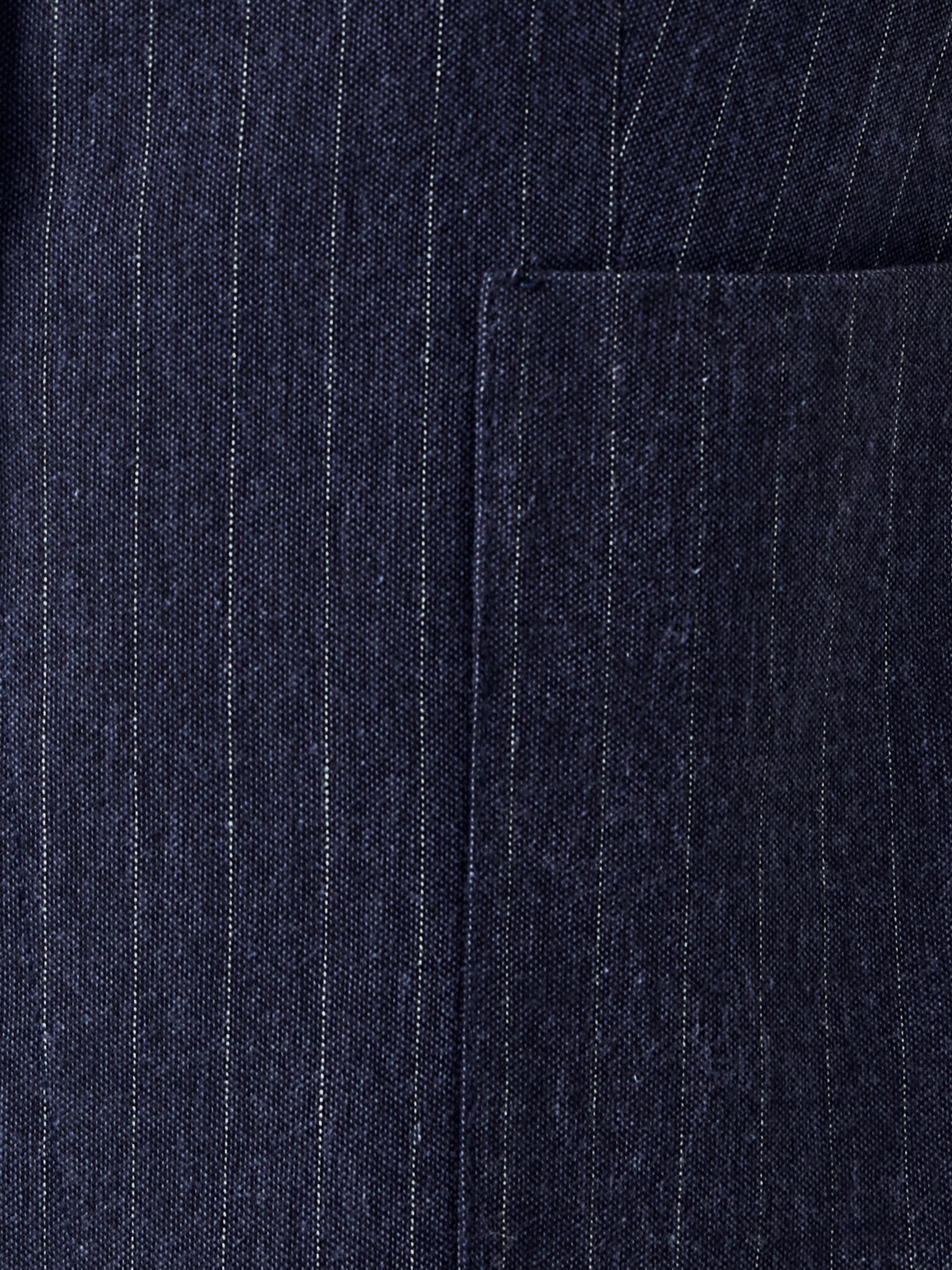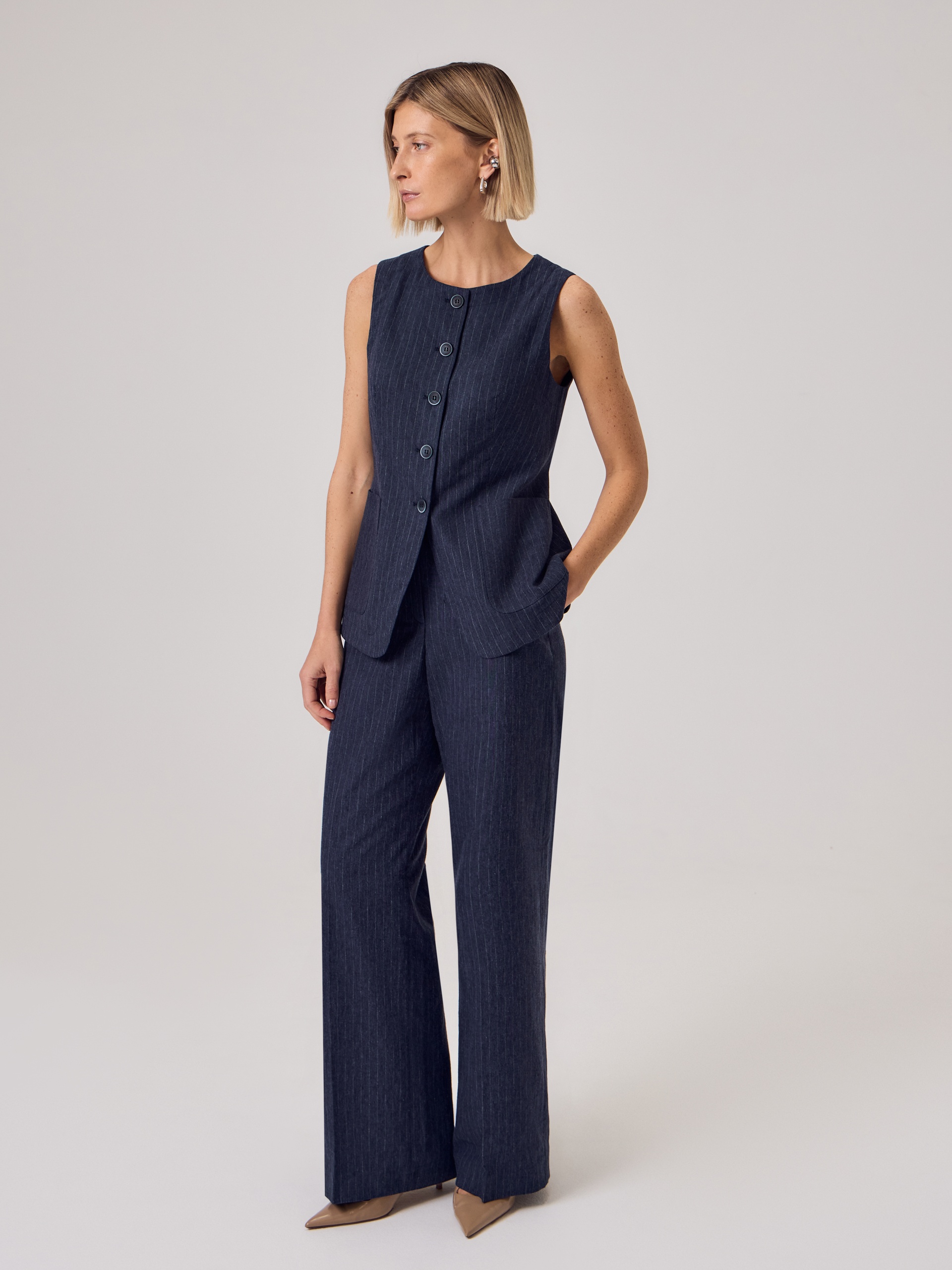 Полуприлегающий удлиненный жилет с круглой горловиной из 100% хлопка темно-синего цвета с серой полоской. На полочке накладные карманы. Составит идеальную пару с брюками из одной ткани для вашего летнего гардероба в офис.