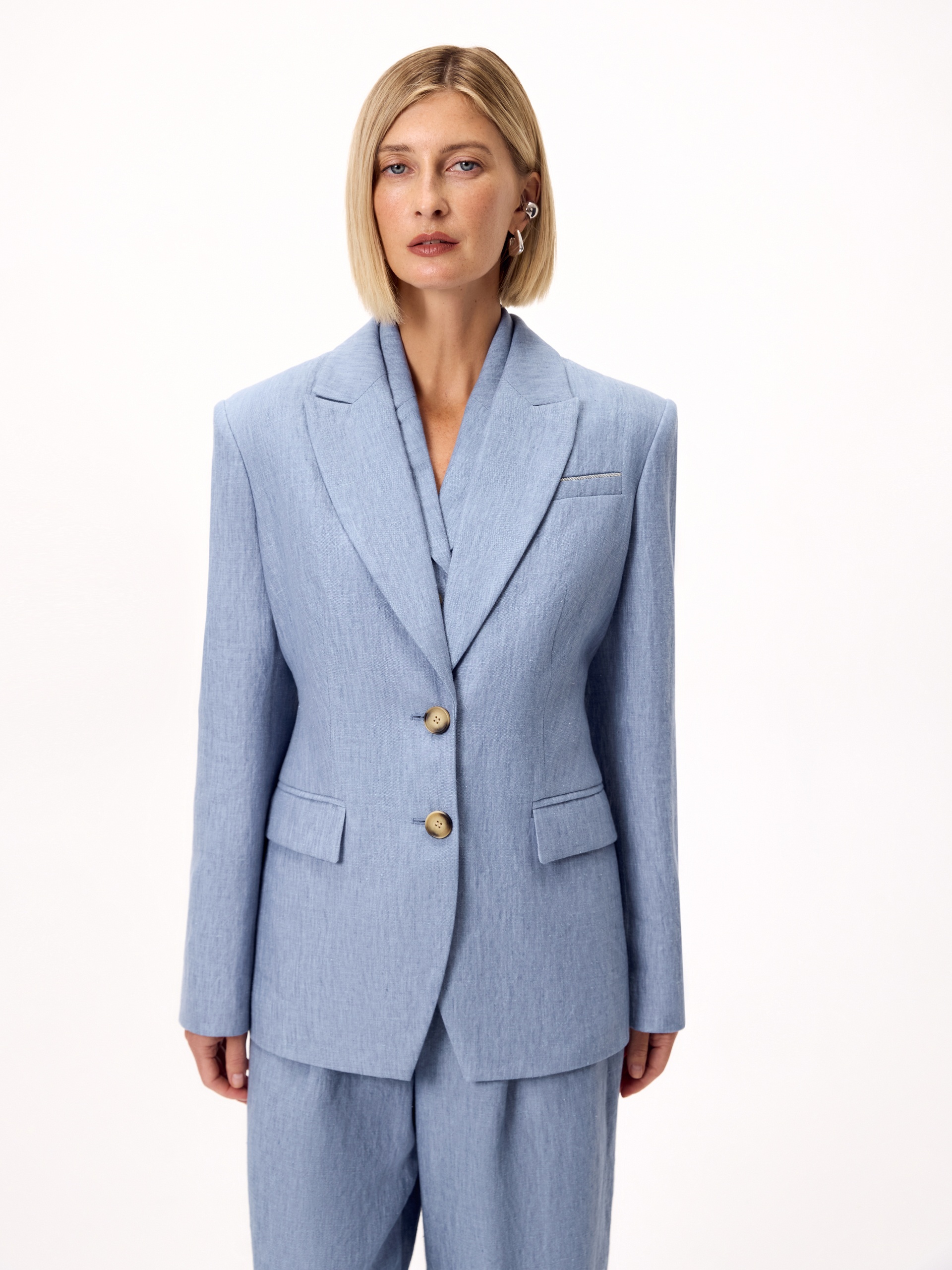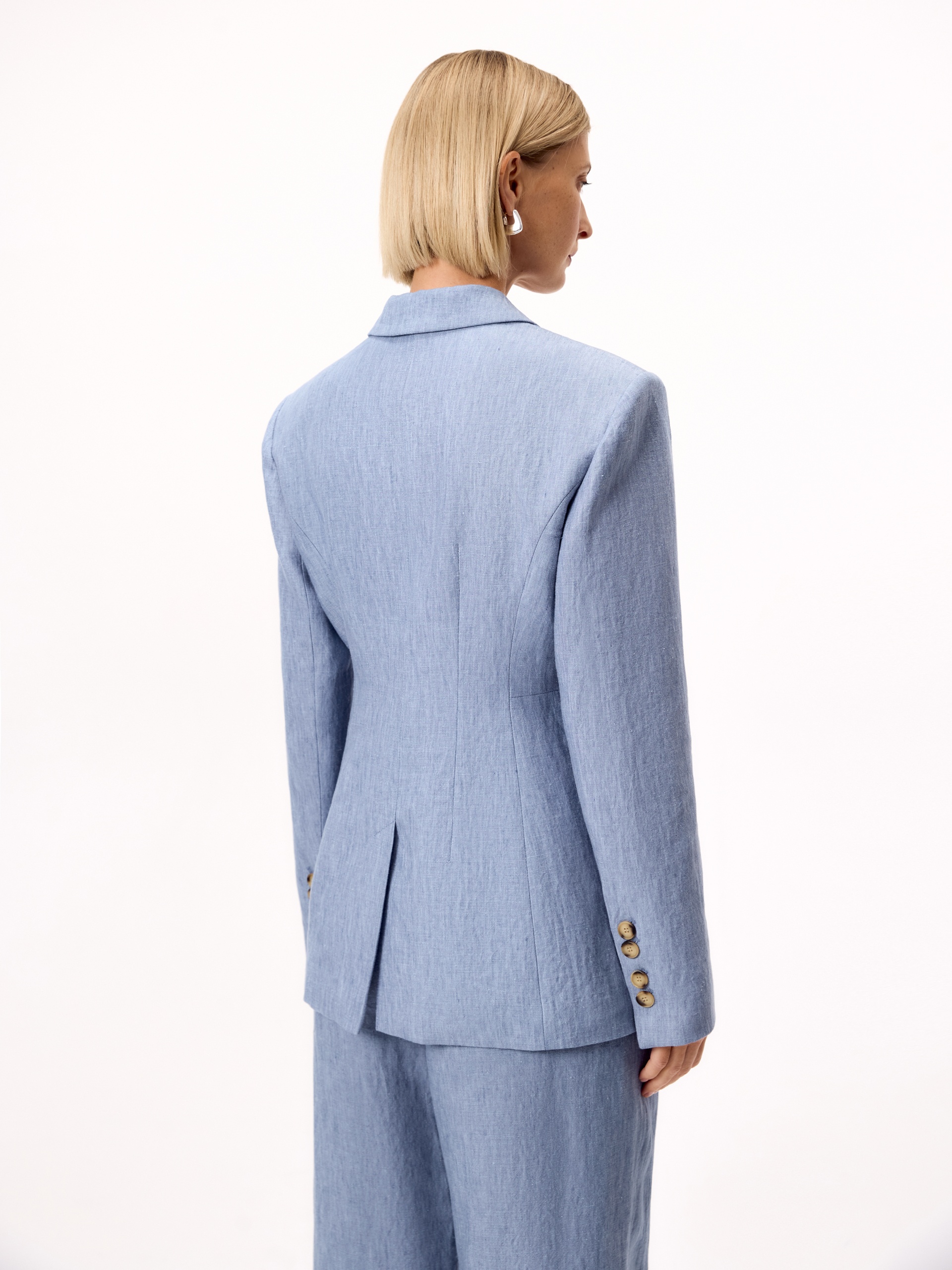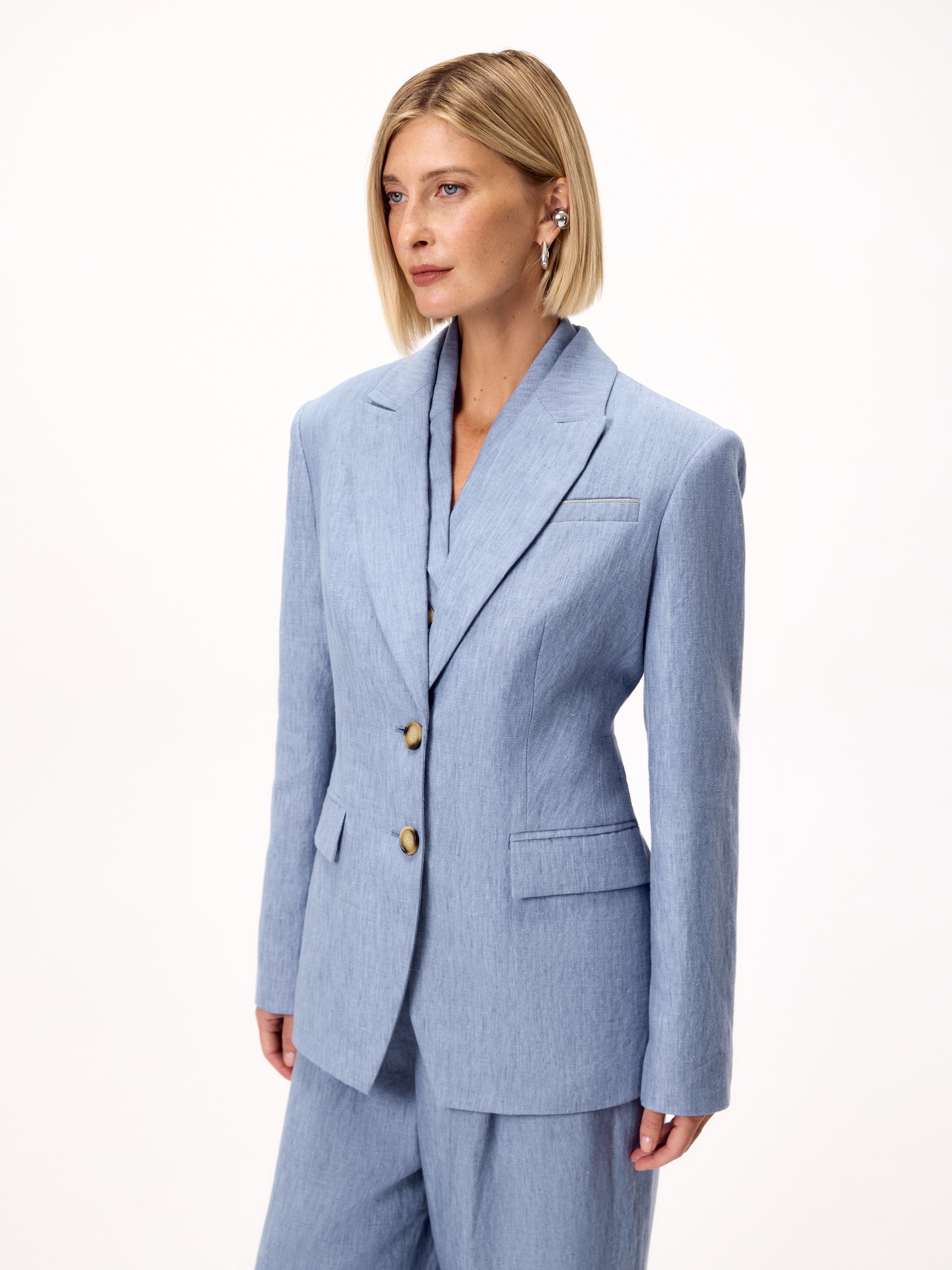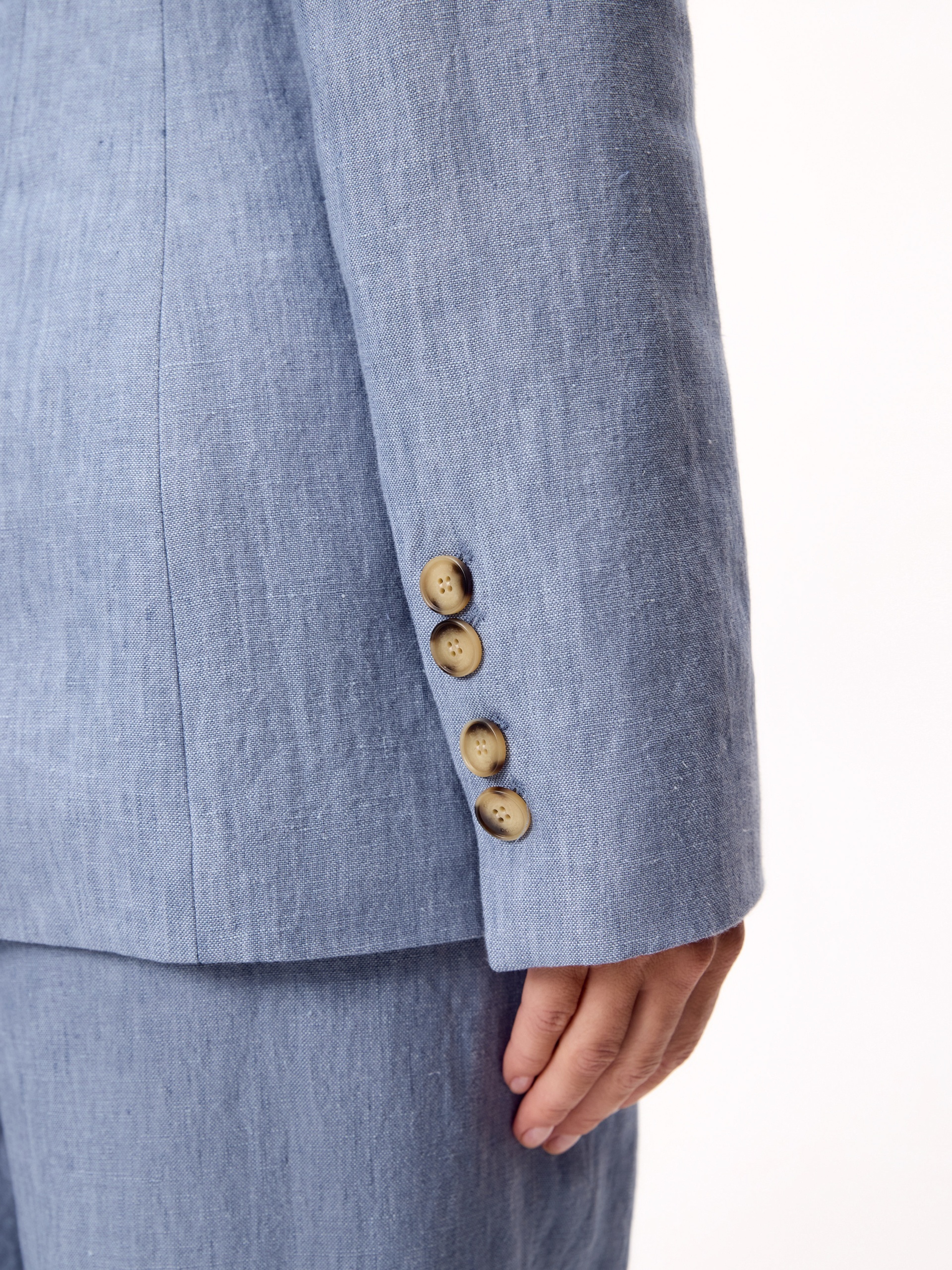 Приталенный однобортный жакет из премиального 100% льна гоулубого цвета. Жакет полностью на подкладке, с классическим английским воротником, застежкой на ряд пуговиц, есть прорезные карманы с клапаном и листочка. Жакет прекрасно сочетается с брюками из той же ткани.