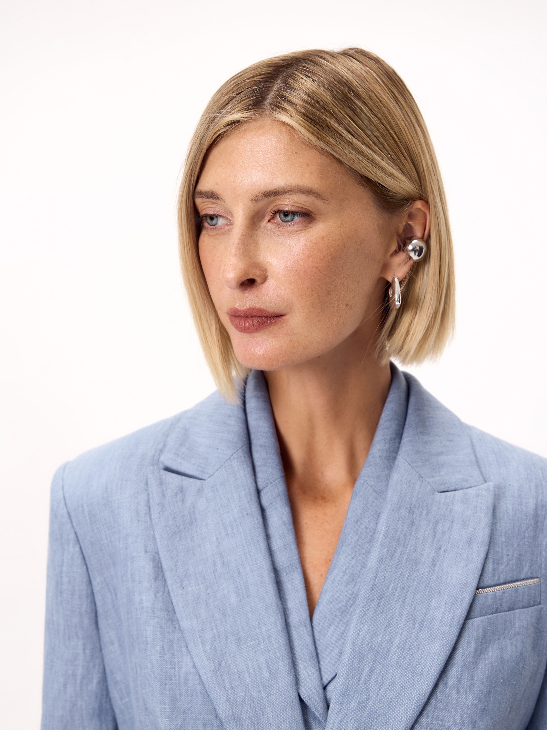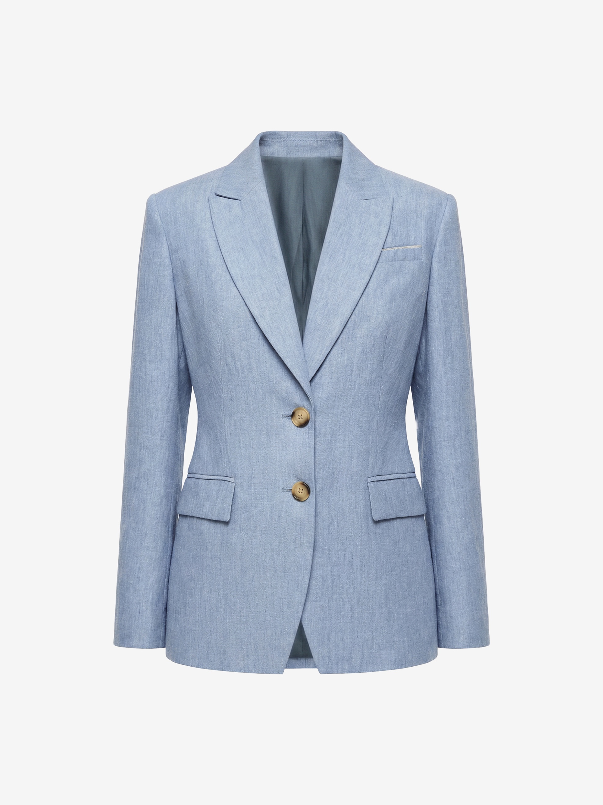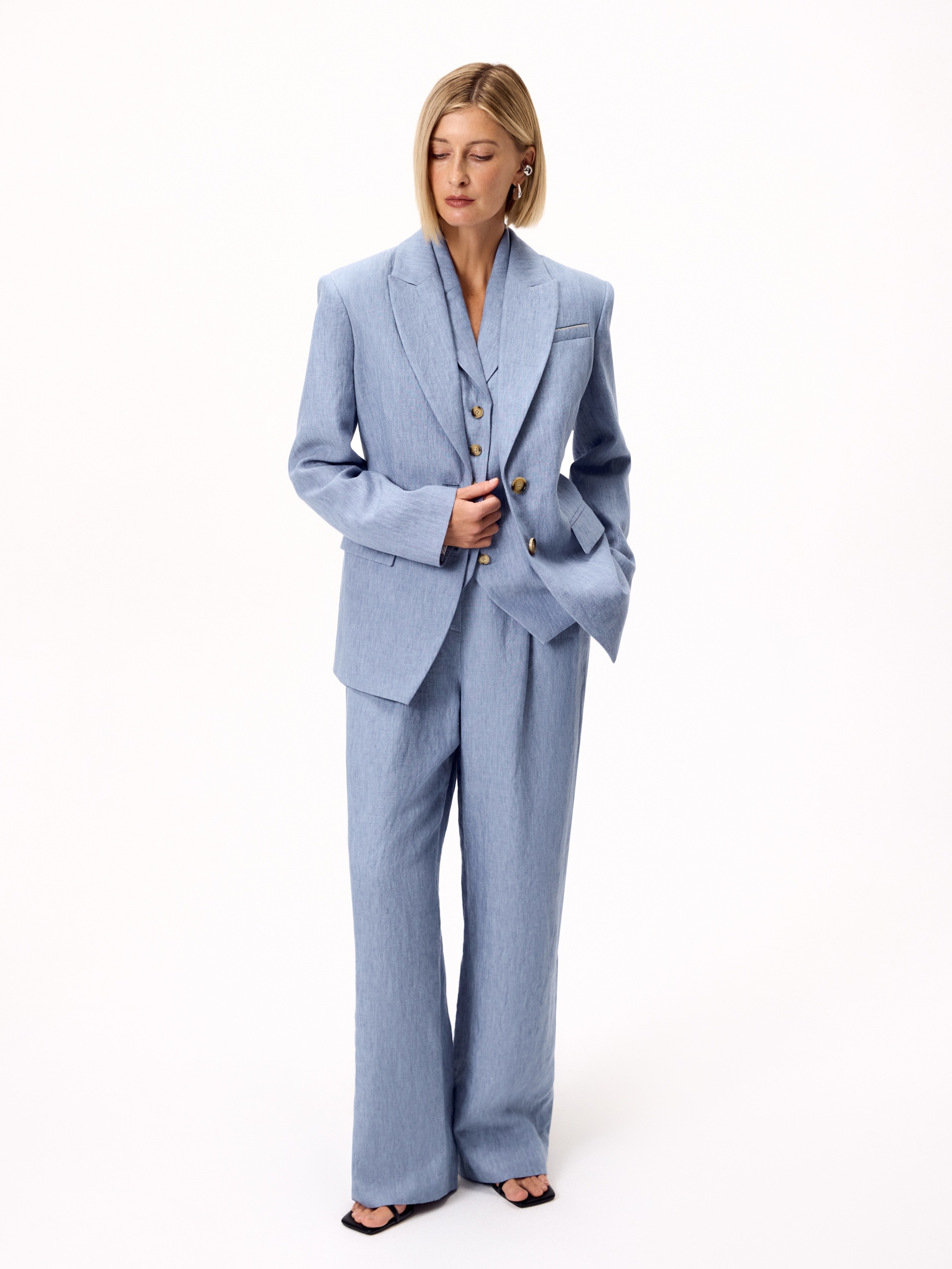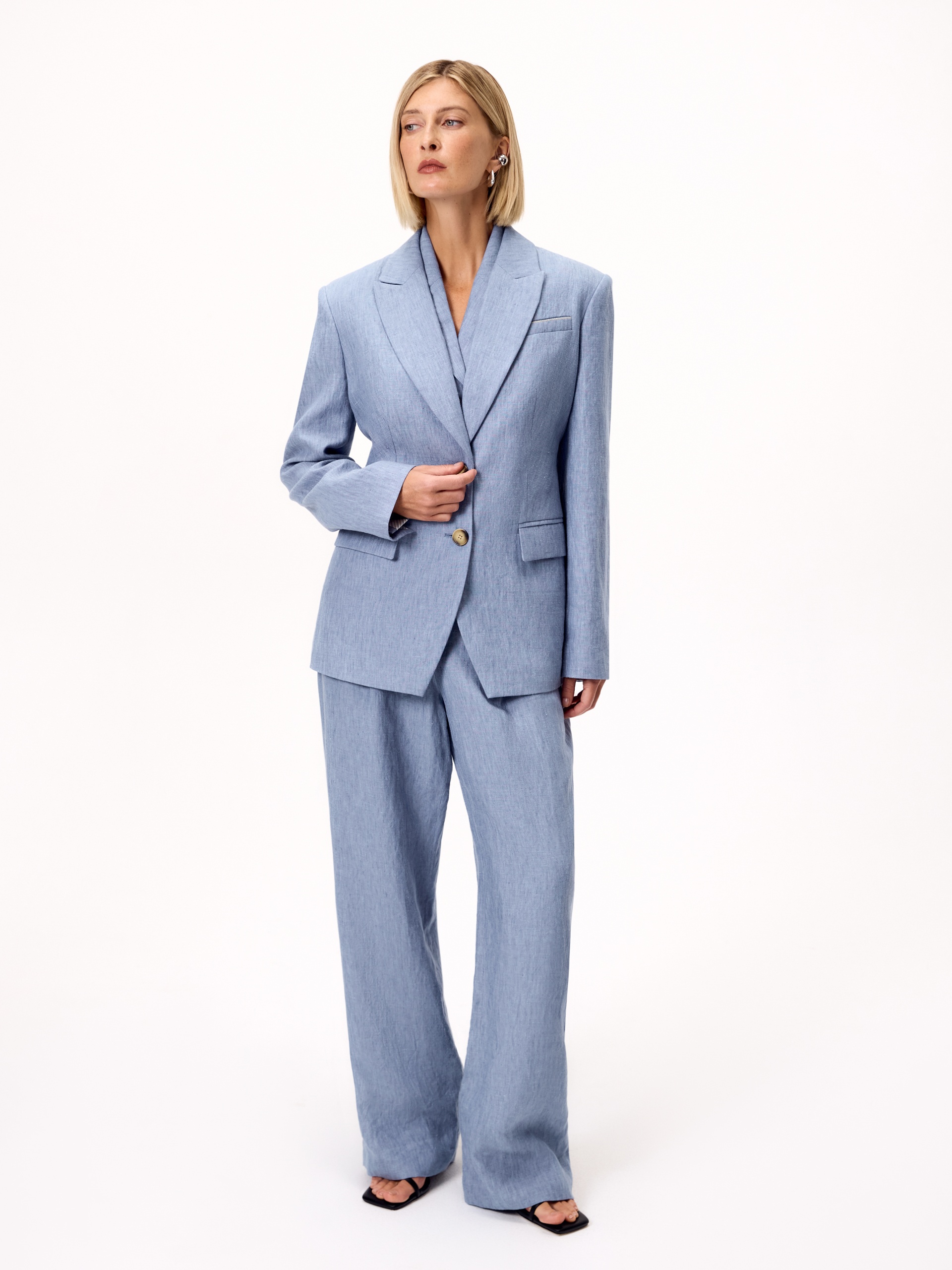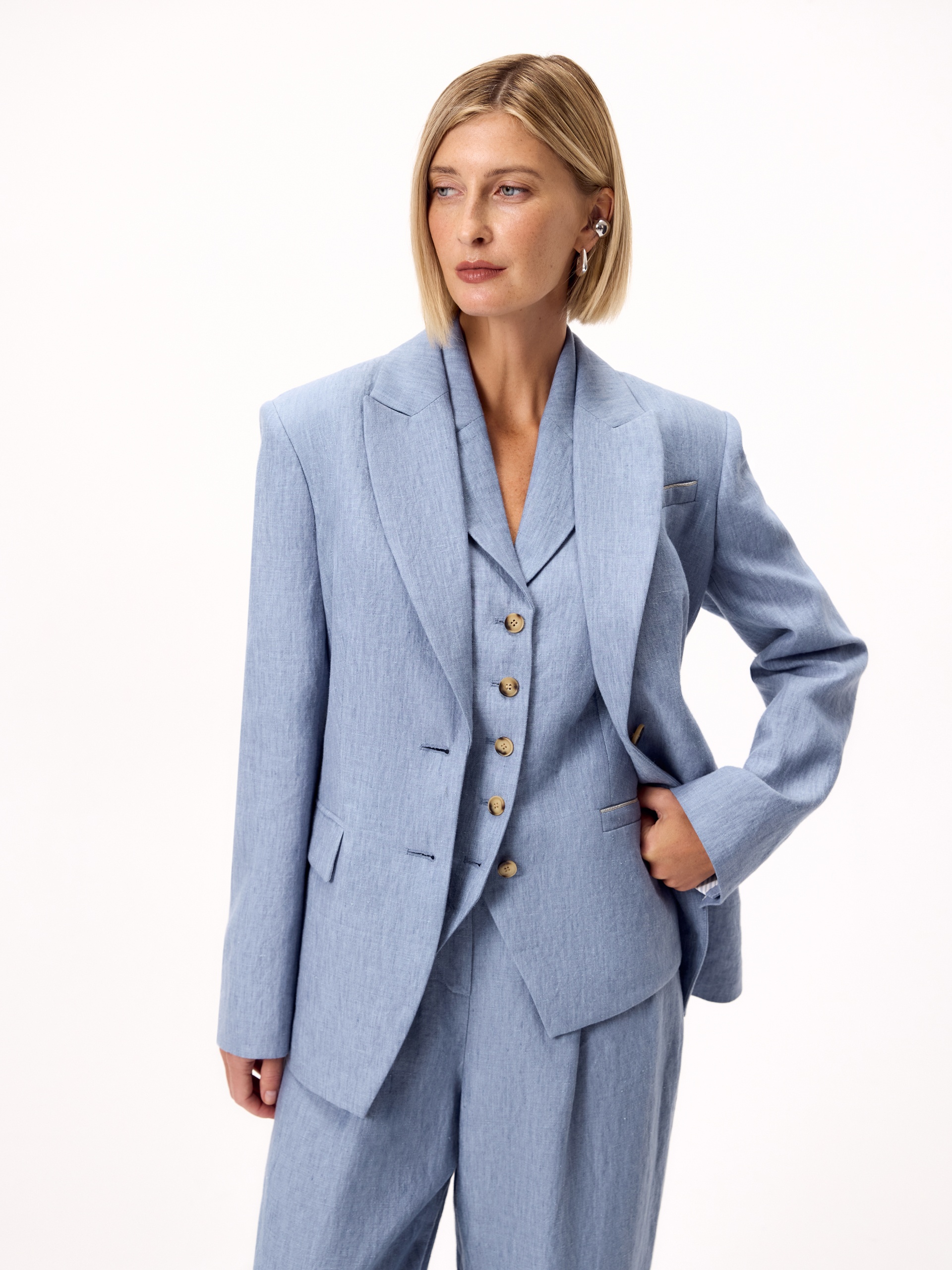 Приталенный однобортный жакет из премиального 100% льна гоулубого цвета. Жакет полностью на подкладке, с классическим английским воротником, застежкой на ряд пуговиц, есть прорезные карманы с клапаном и листочка. Жакет прекрасно сочетается с брюками из той же ткани.