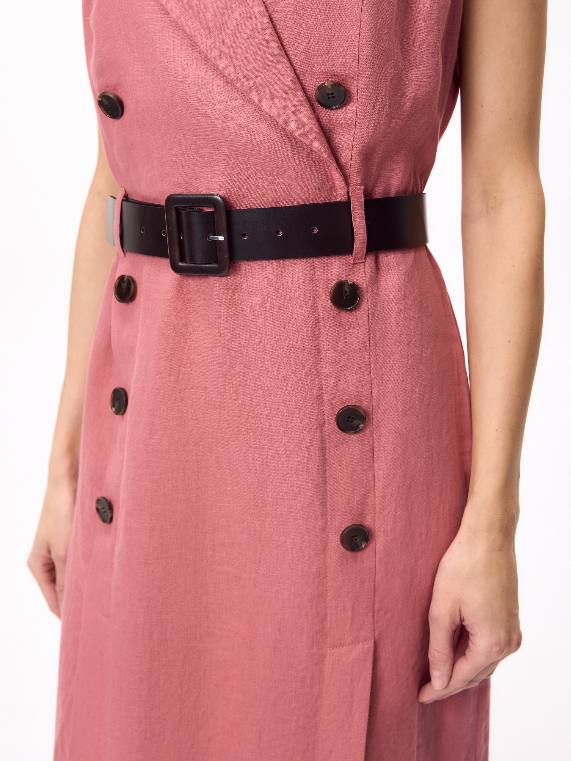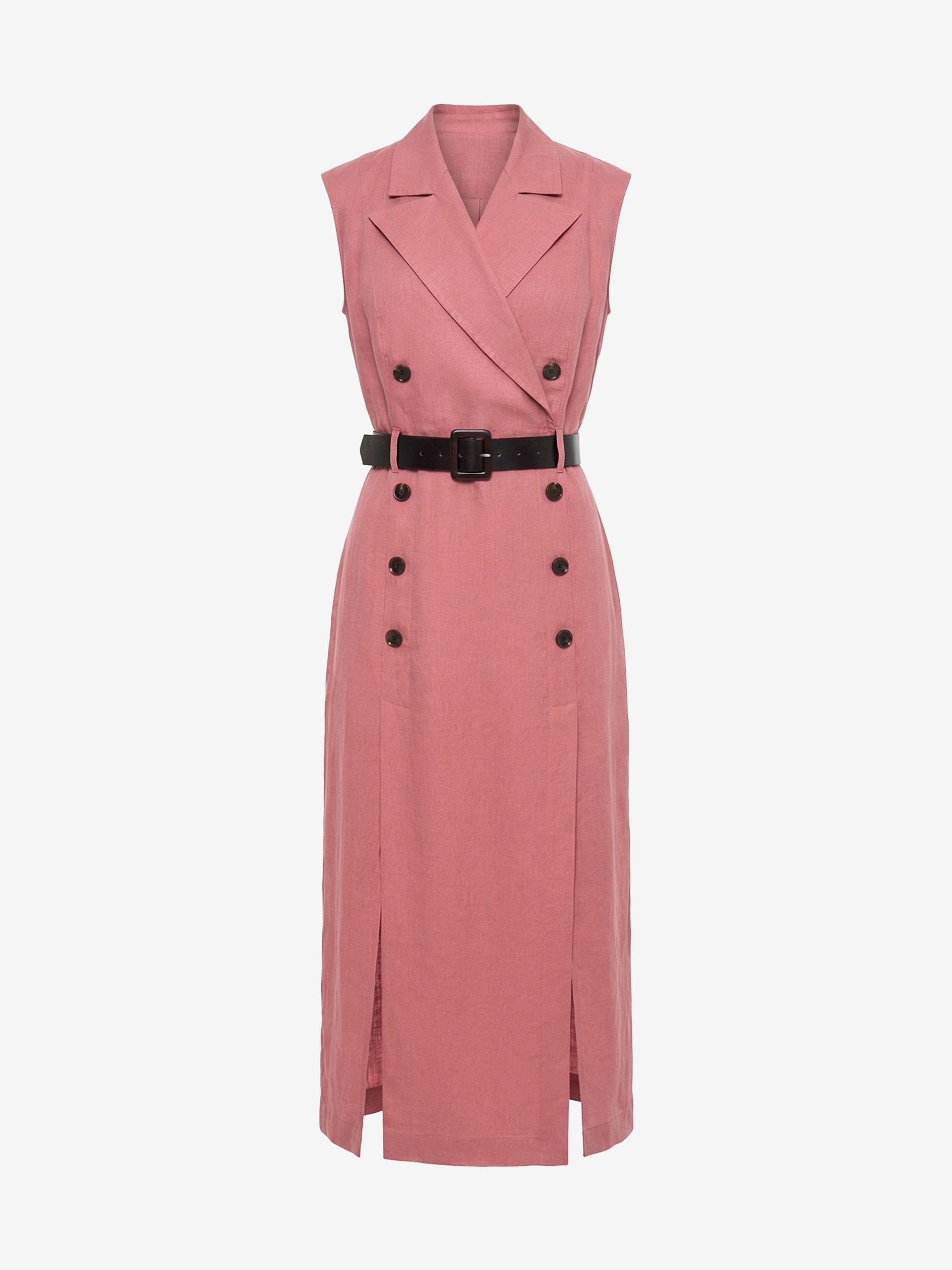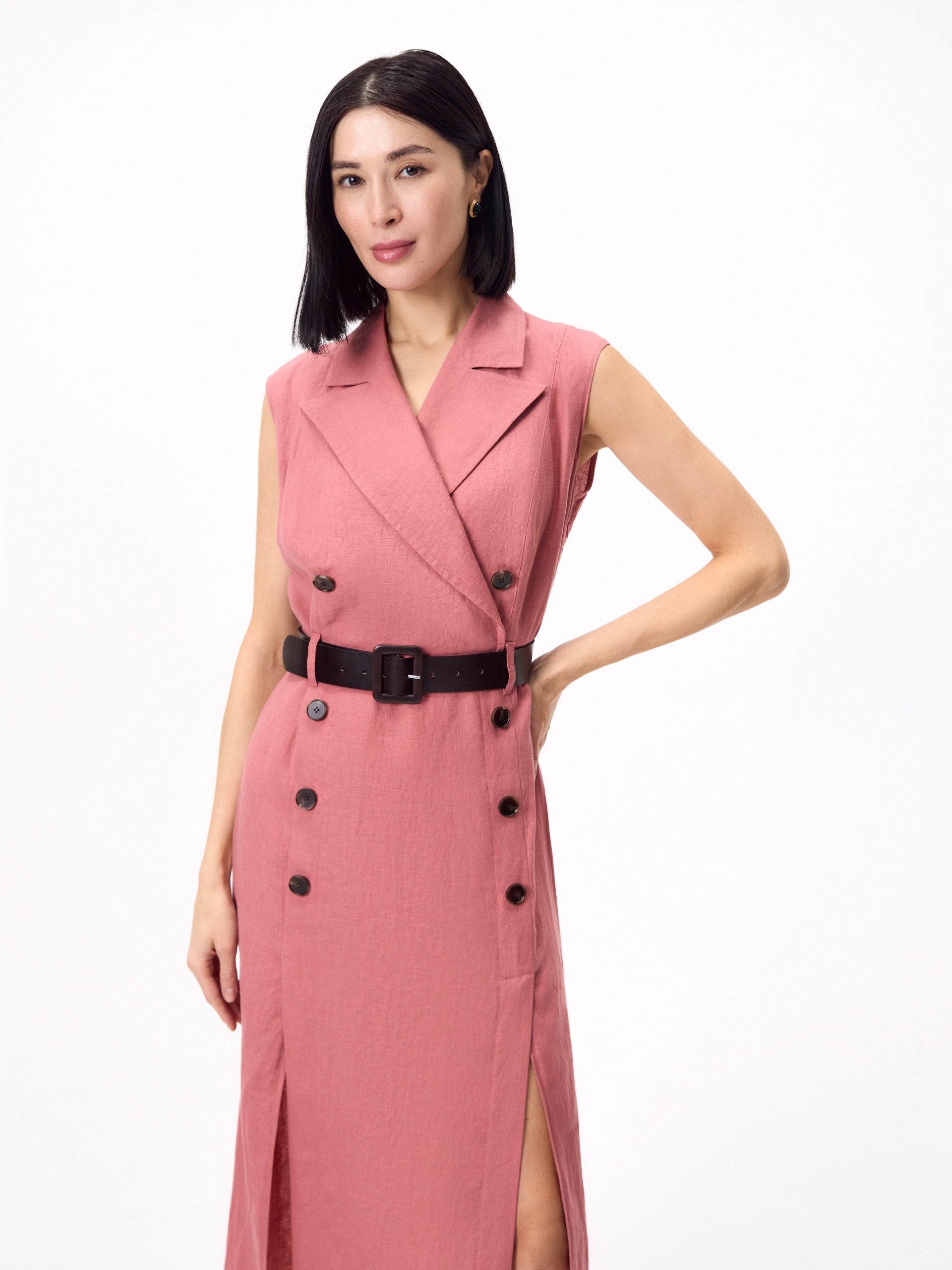 Платье из премиального 100% льна пыльно-розового цвета. Платье полуприлегающего силуэта без рукавов, английским воротником и V-образным вырезом горловины. Застежка двубортная на пуговицы. На талии широкий сьемный пояс с пряжкой. Спереди две высокие шлицы.