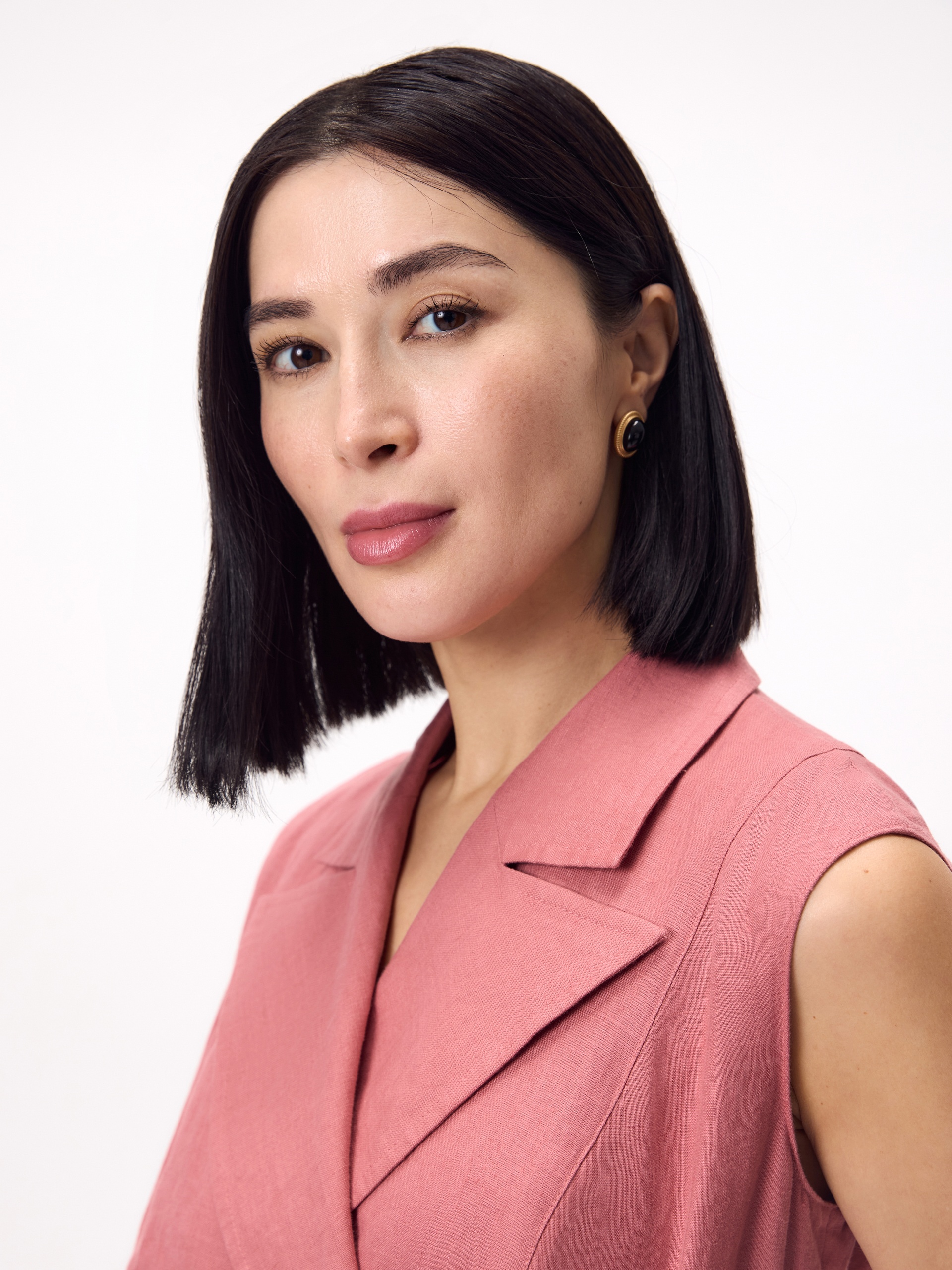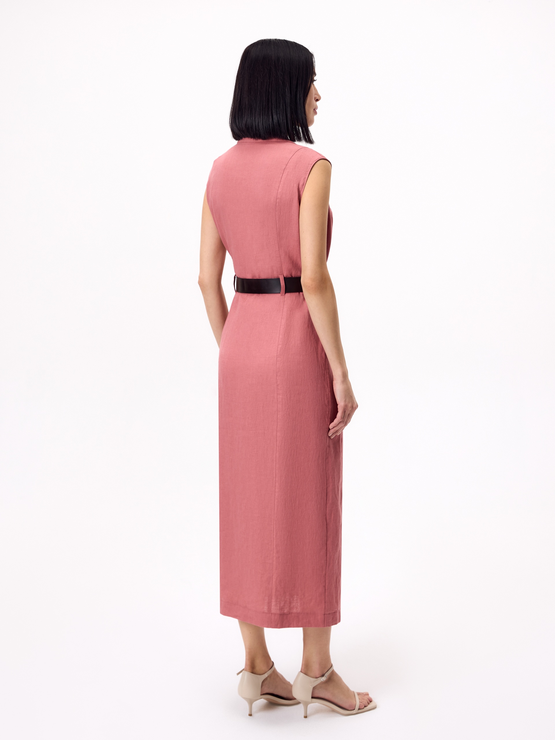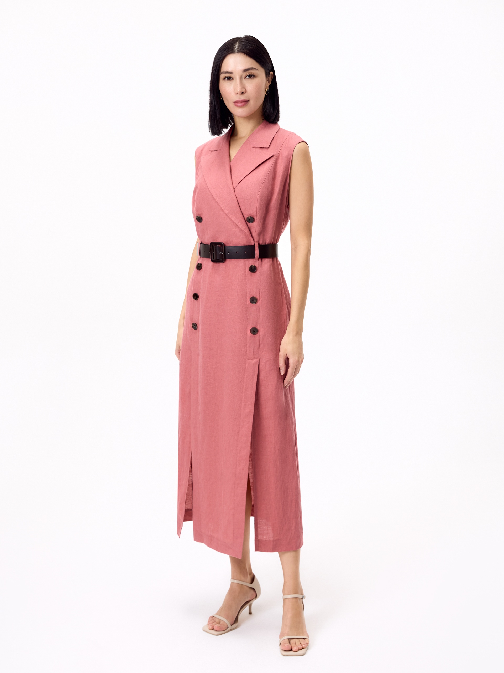 Платье из премиального 100% льна пыльно-розового цвета. Платье полуприлегающего силуэта без рукавов, английским воротником и V-образным вырезом горловины. Застежка двубортная на пуговицы. На талии широкий сьемный пояс с пряжкой. Спереди две высокие шлицы.