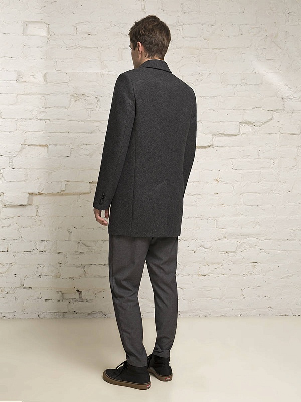 Пальто классического кроя с отложным воротником. Застежка на 5 пуговиц. Полочка с декоративными рамками и прорезными карманами с клапанами. Спинка со шлицей. Рукав втачной. Внутренние детали: карманы для документов и бумажника.