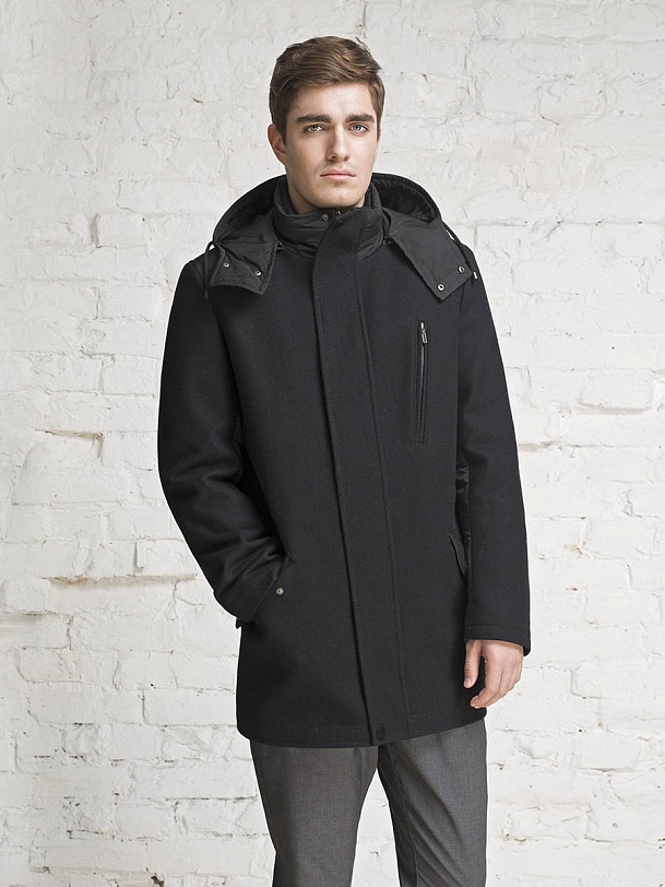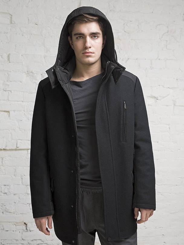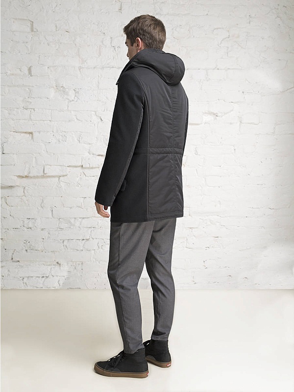 Утепленное пальто из двух видов ткани: плащевки и ворсовой шерстяной ткани черного цвета.
