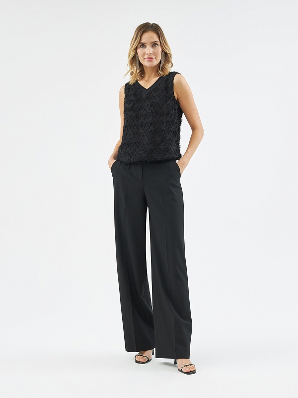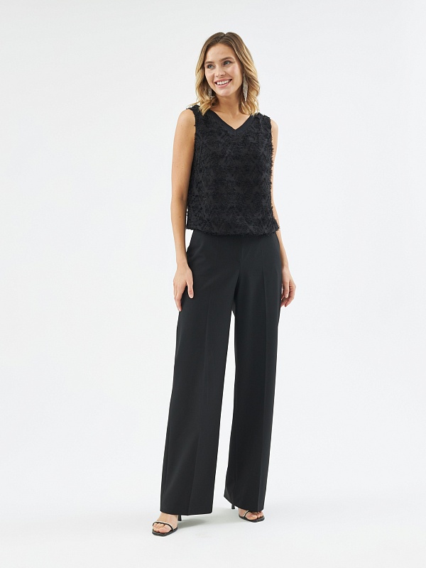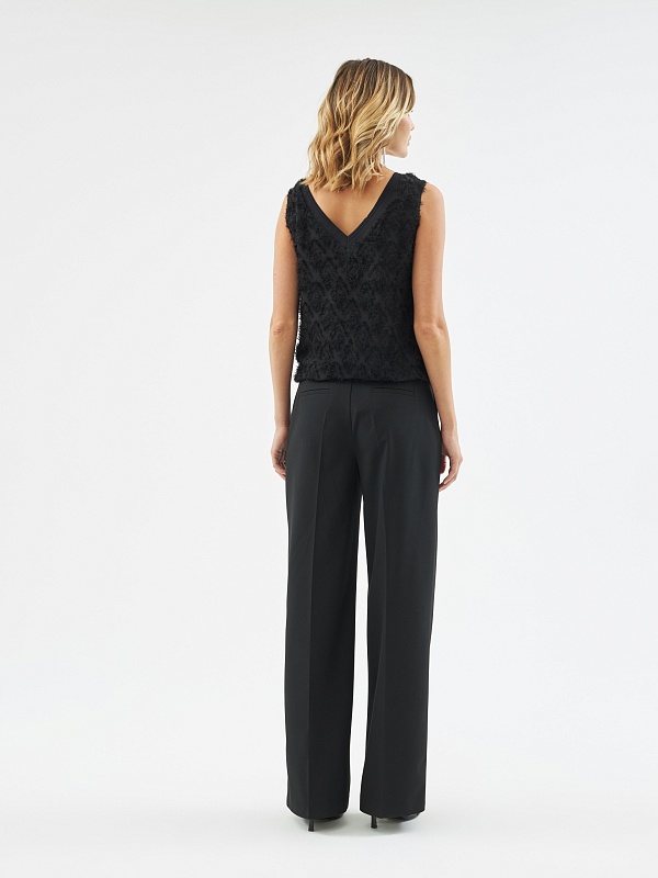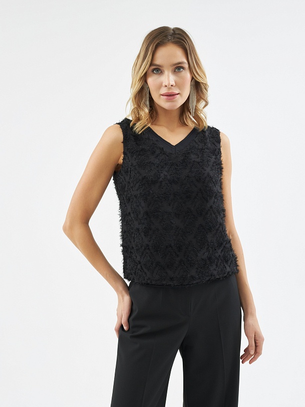 Блуза из фактурной ткани полуприлегающего силуэта без рукавов и с v-образным вырезом горловины.