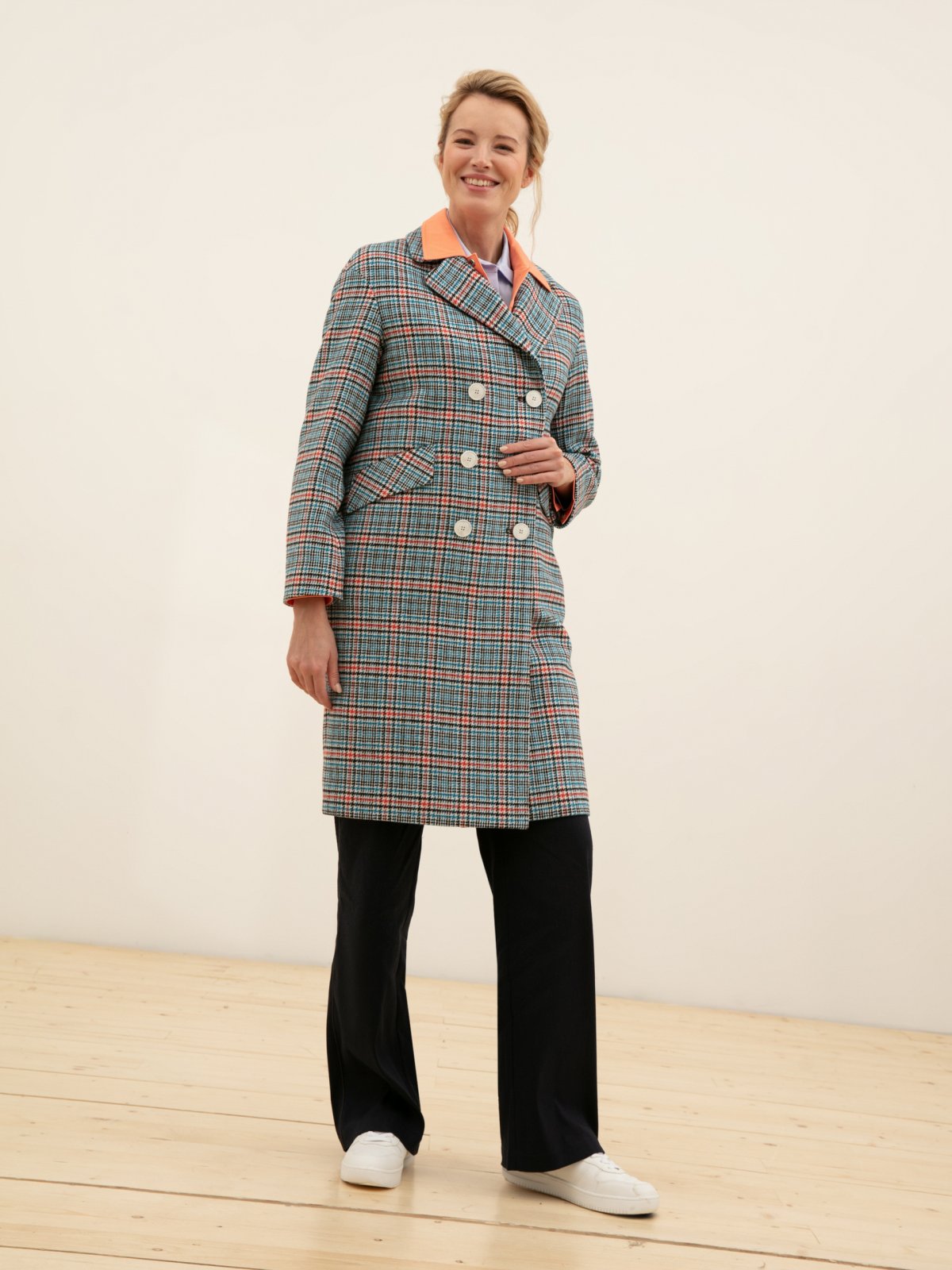 Двубортное пальто-кокон из шерстяной сине-оранжевой клетки.