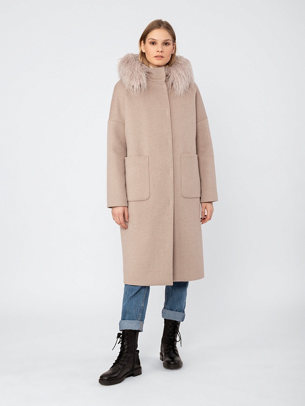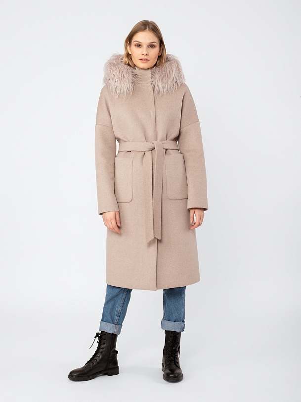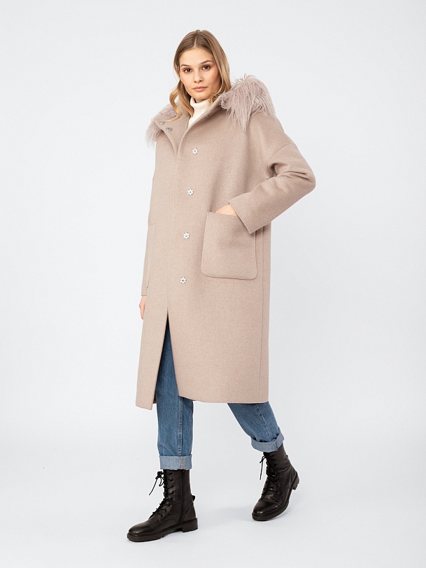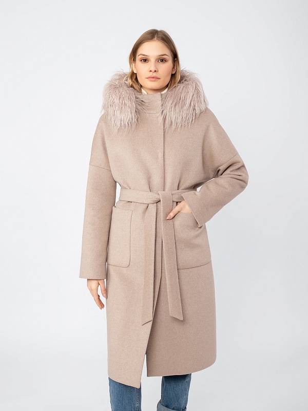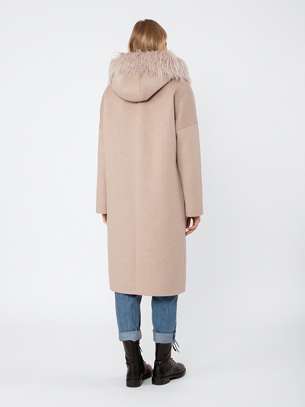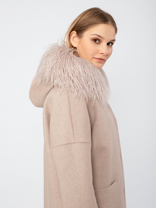 Минималистичное пальто нежно-розового оттенка с опушкой из искусственного меха под ламу имеет все шансы стать жемчужиной вашего гардероба! Универсальное, но не скучное: оно уместно в городе и на природе.