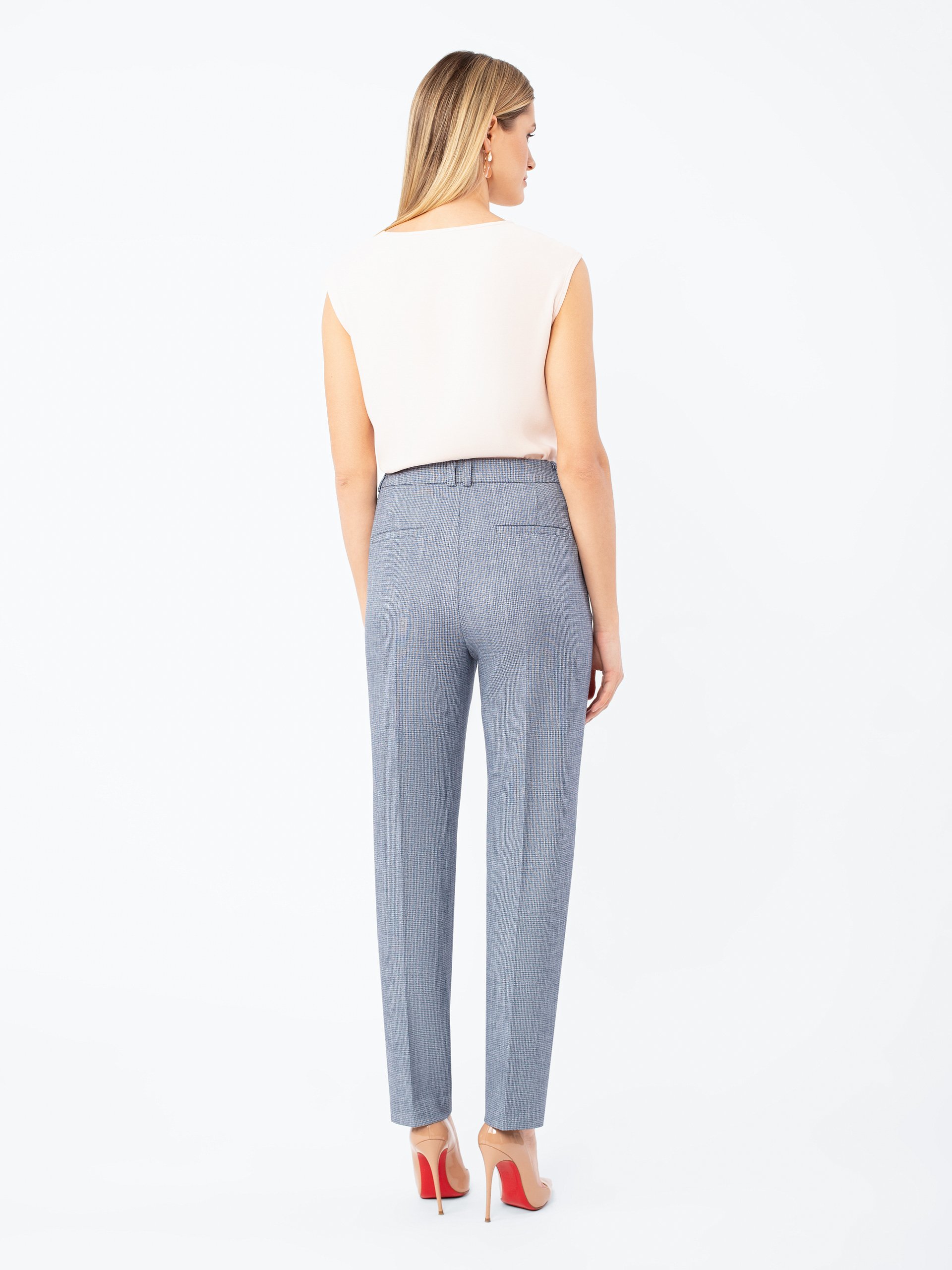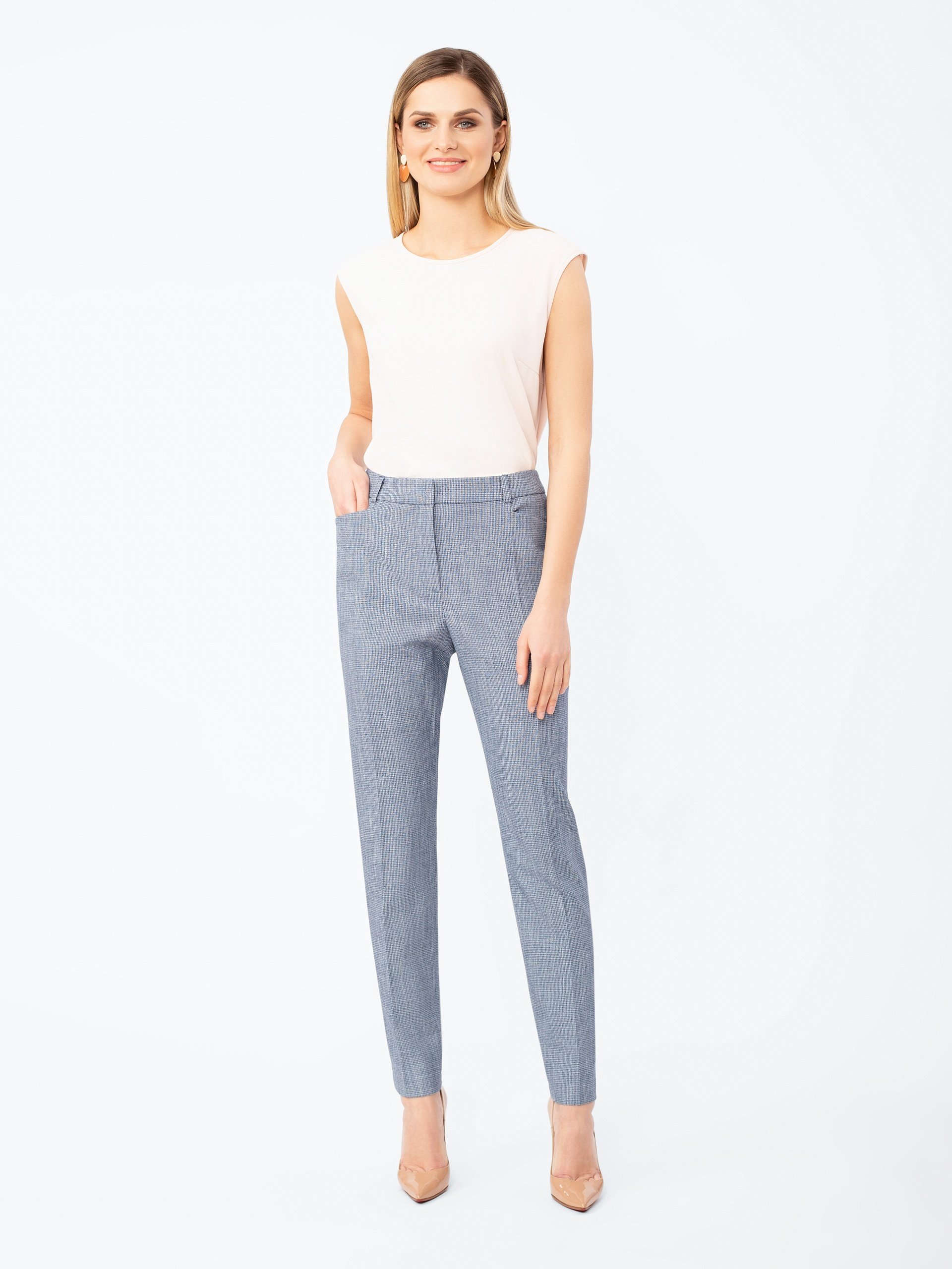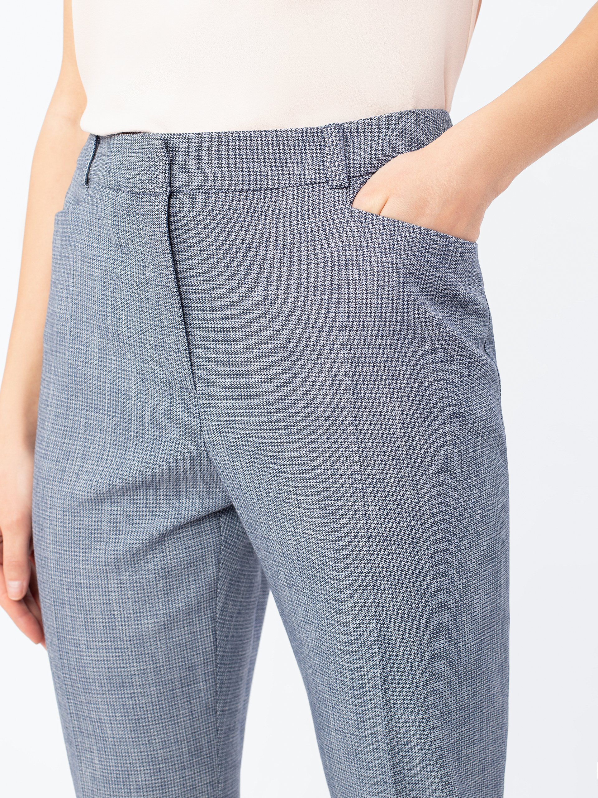 Классические брюки из костюмной ткани голубого оттенка с мелким принтом.