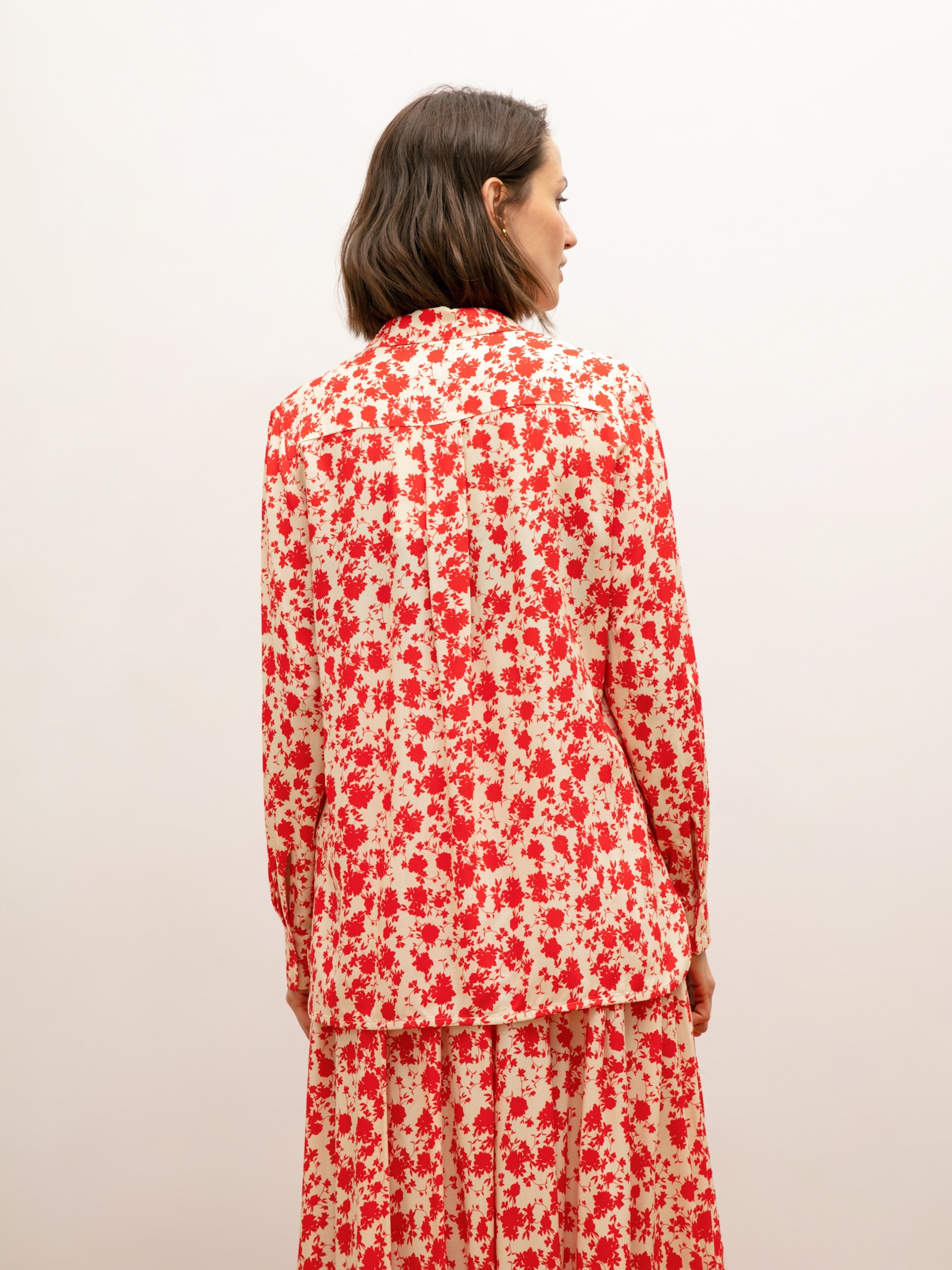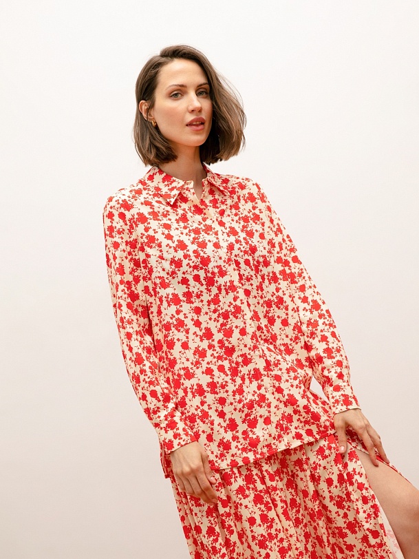 Блуза в городском стиле, прямого силуэта. Рукав втачной, длинный, на манжете. Воротник отложной на стойке. Застежка на пуговицах.
