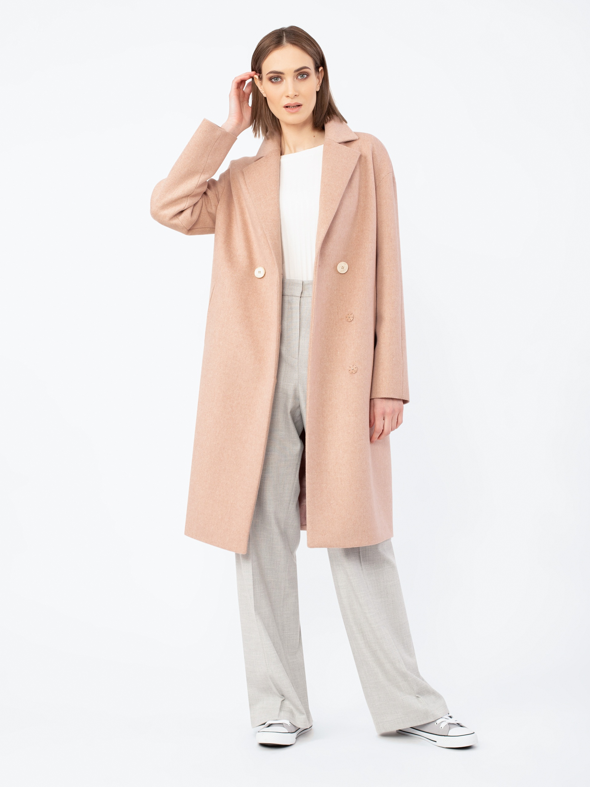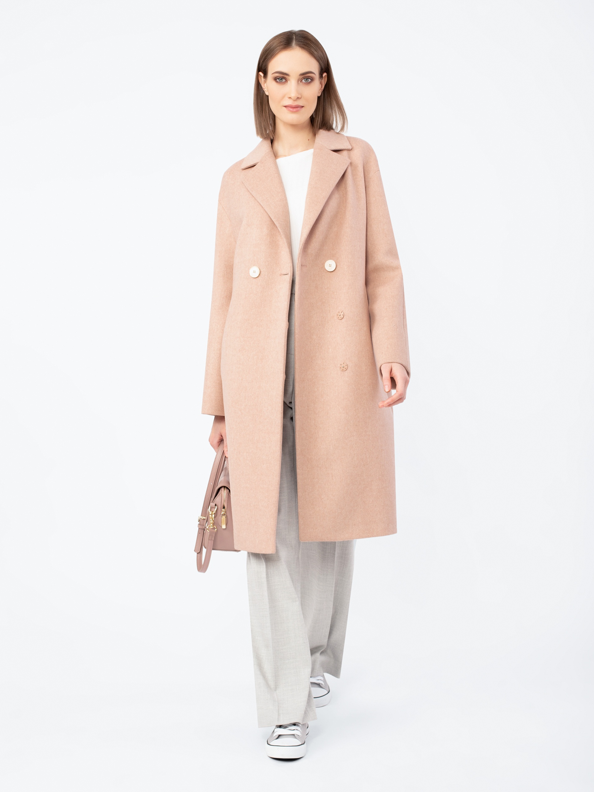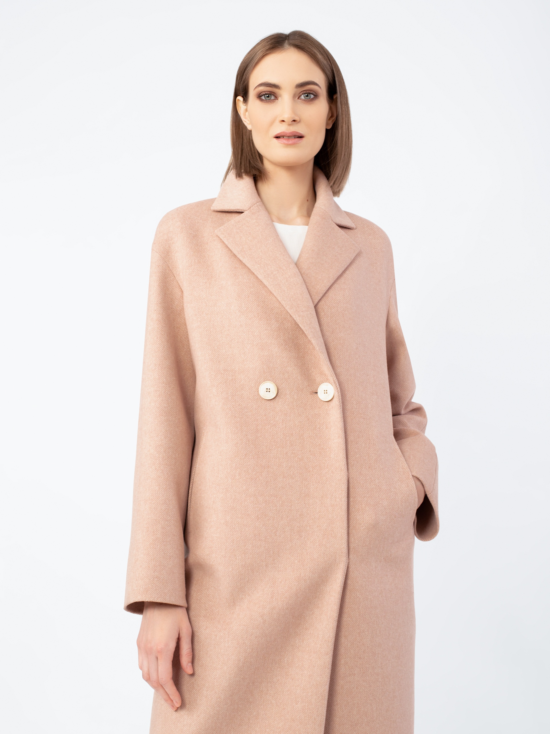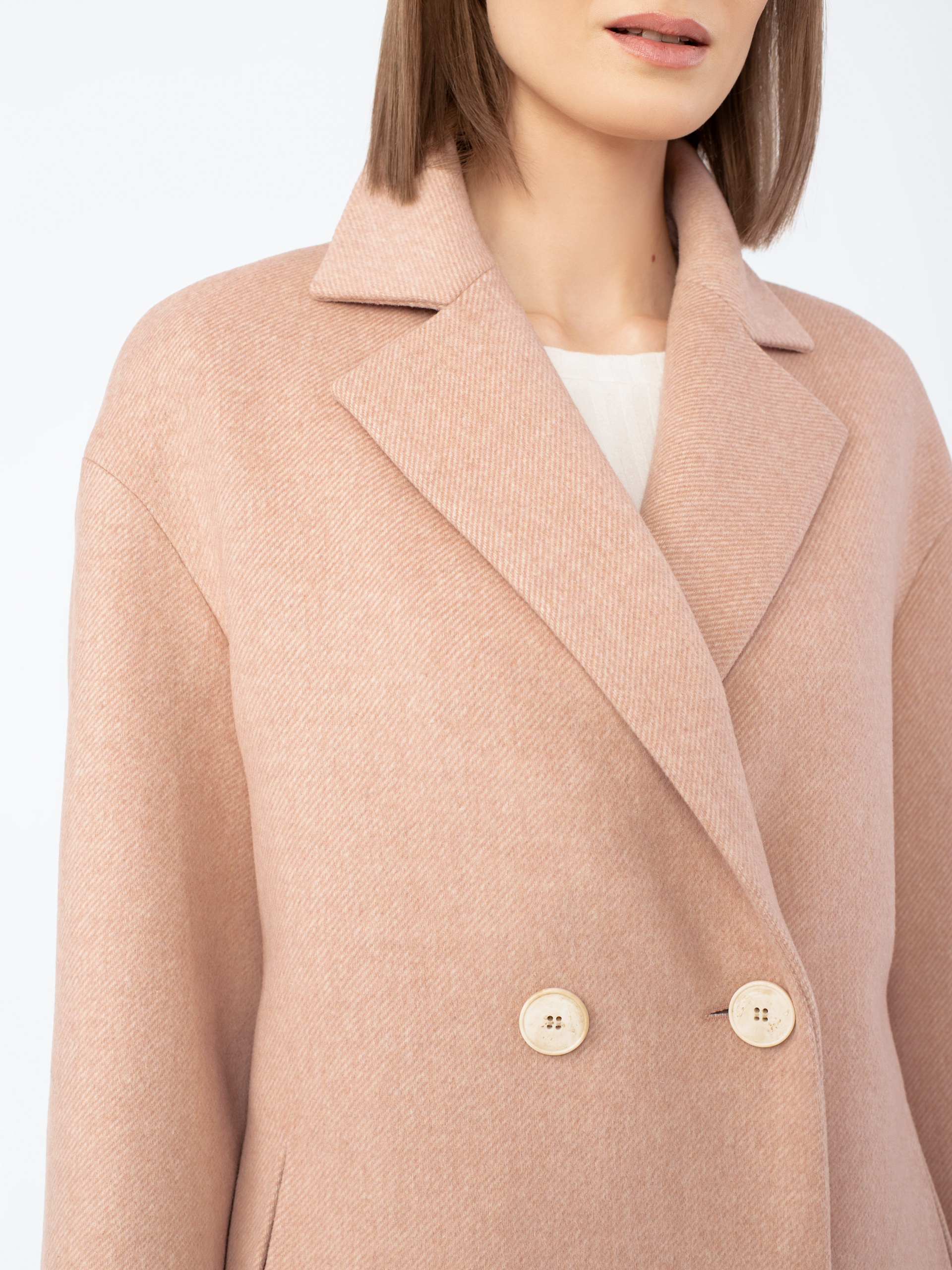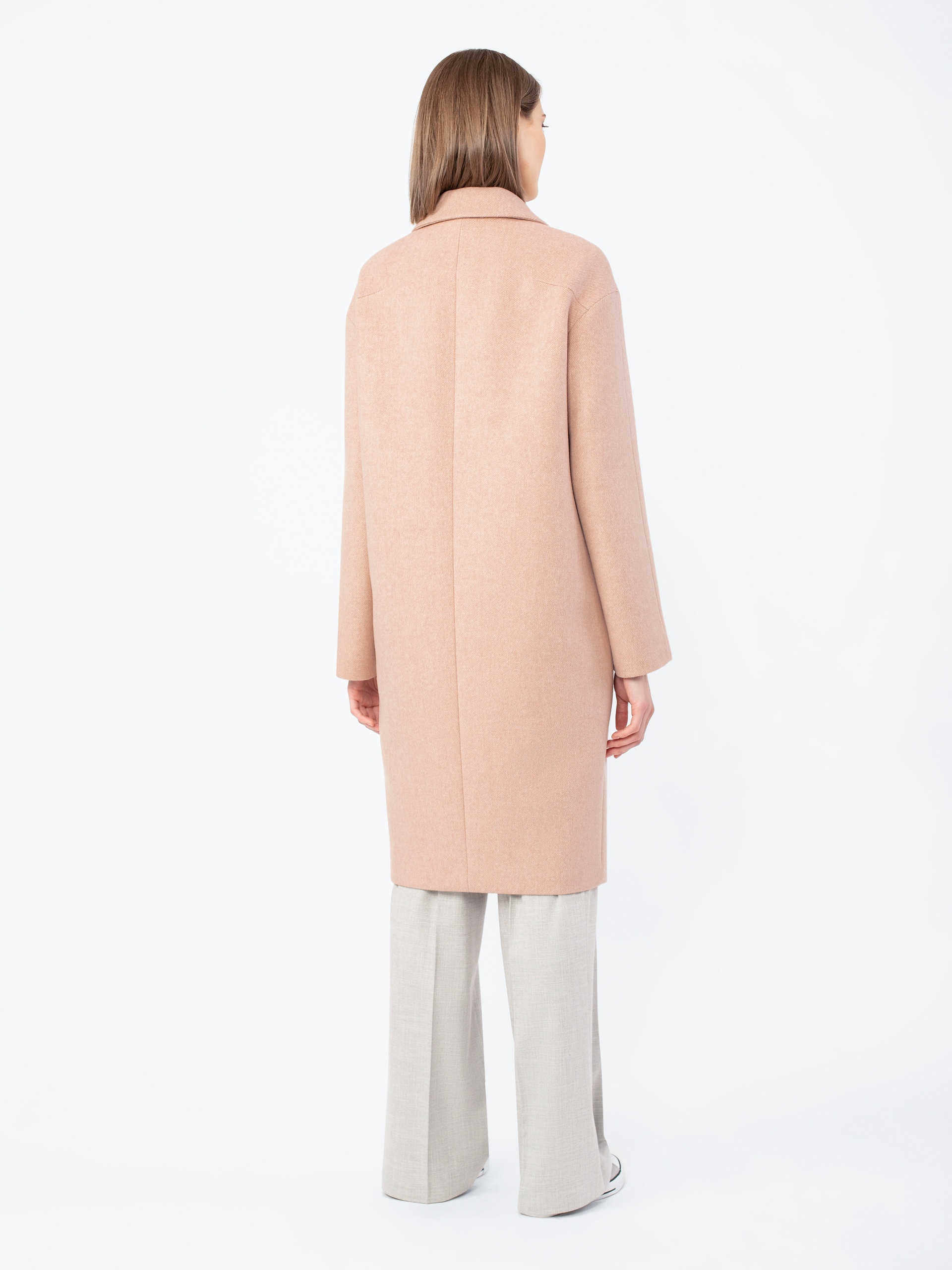 Пальто-кокон длиной чуть ниже колена из шерстяной ткани теплого розово-бежевого оттенка.