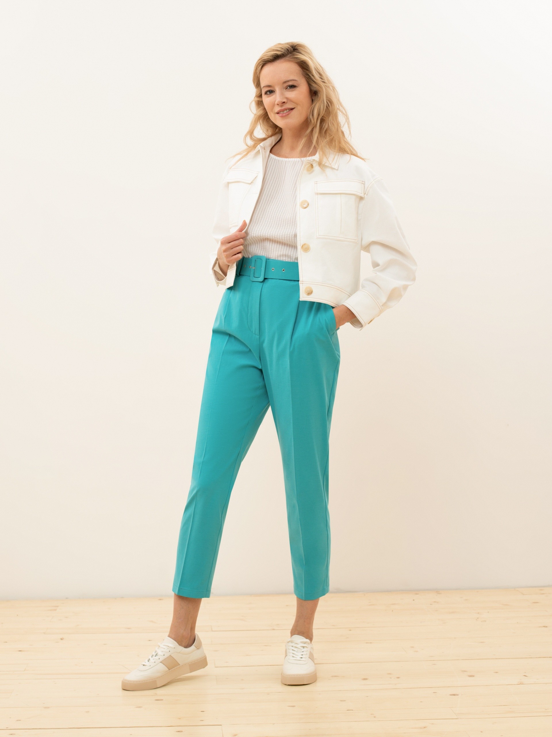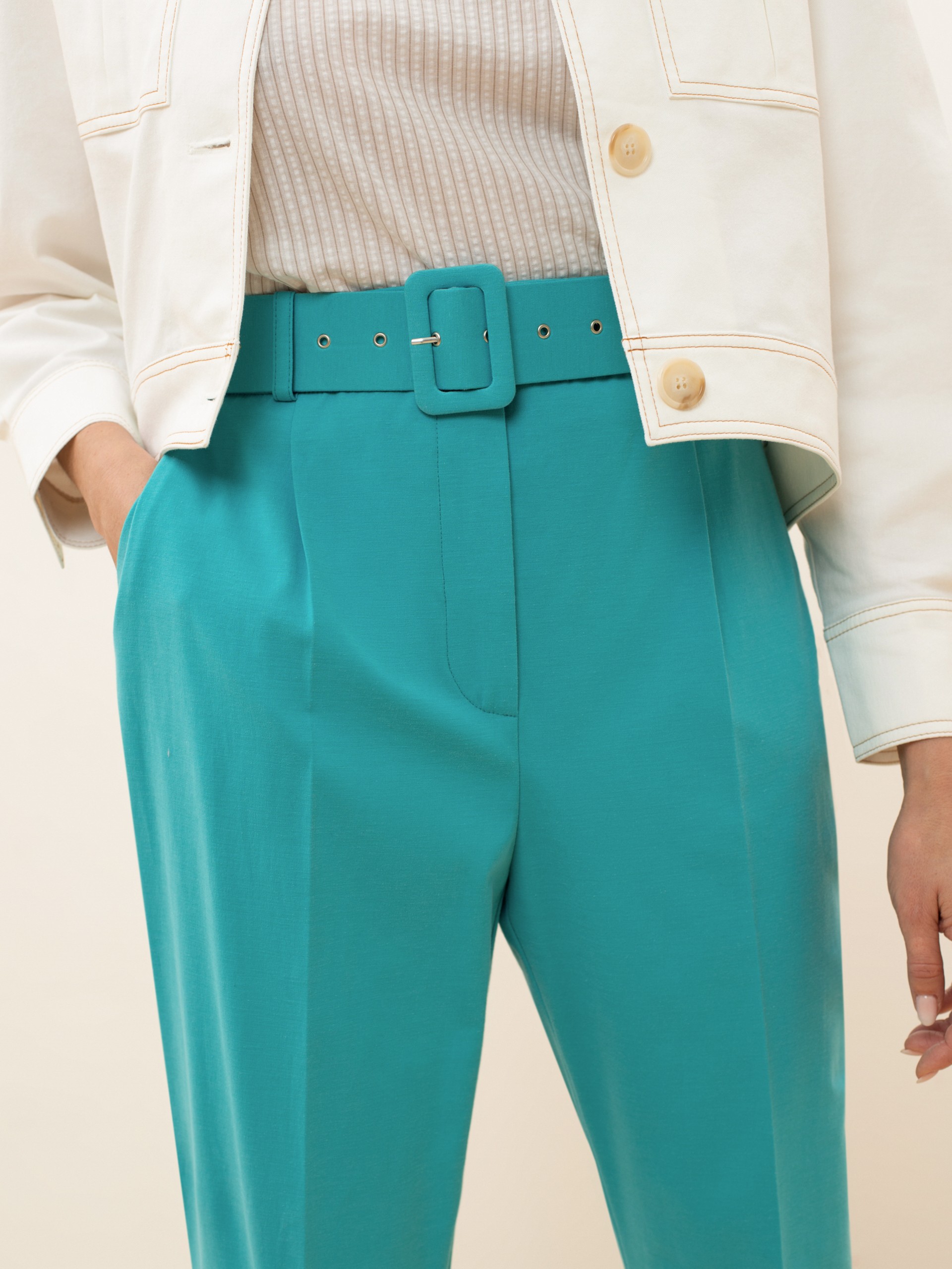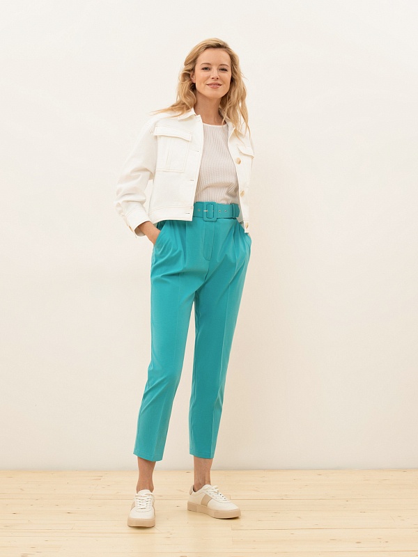 Женские прямые брюки полной длины. Высокая посадка. На широком притачном поясе со шлевками. Спереди складки. Ремень и пряжка обтяжные основной тканью. Боковые карманы рабочие.
