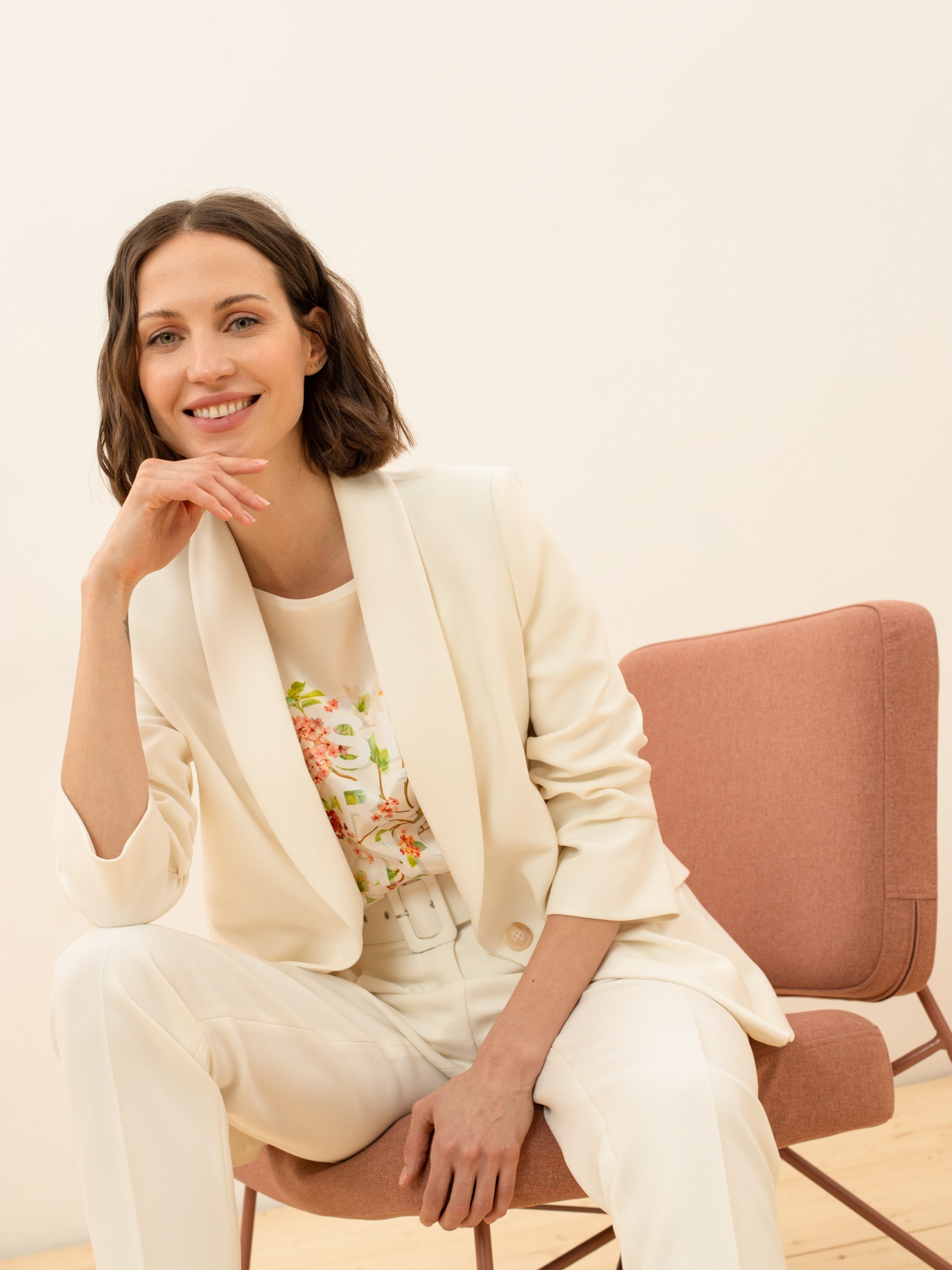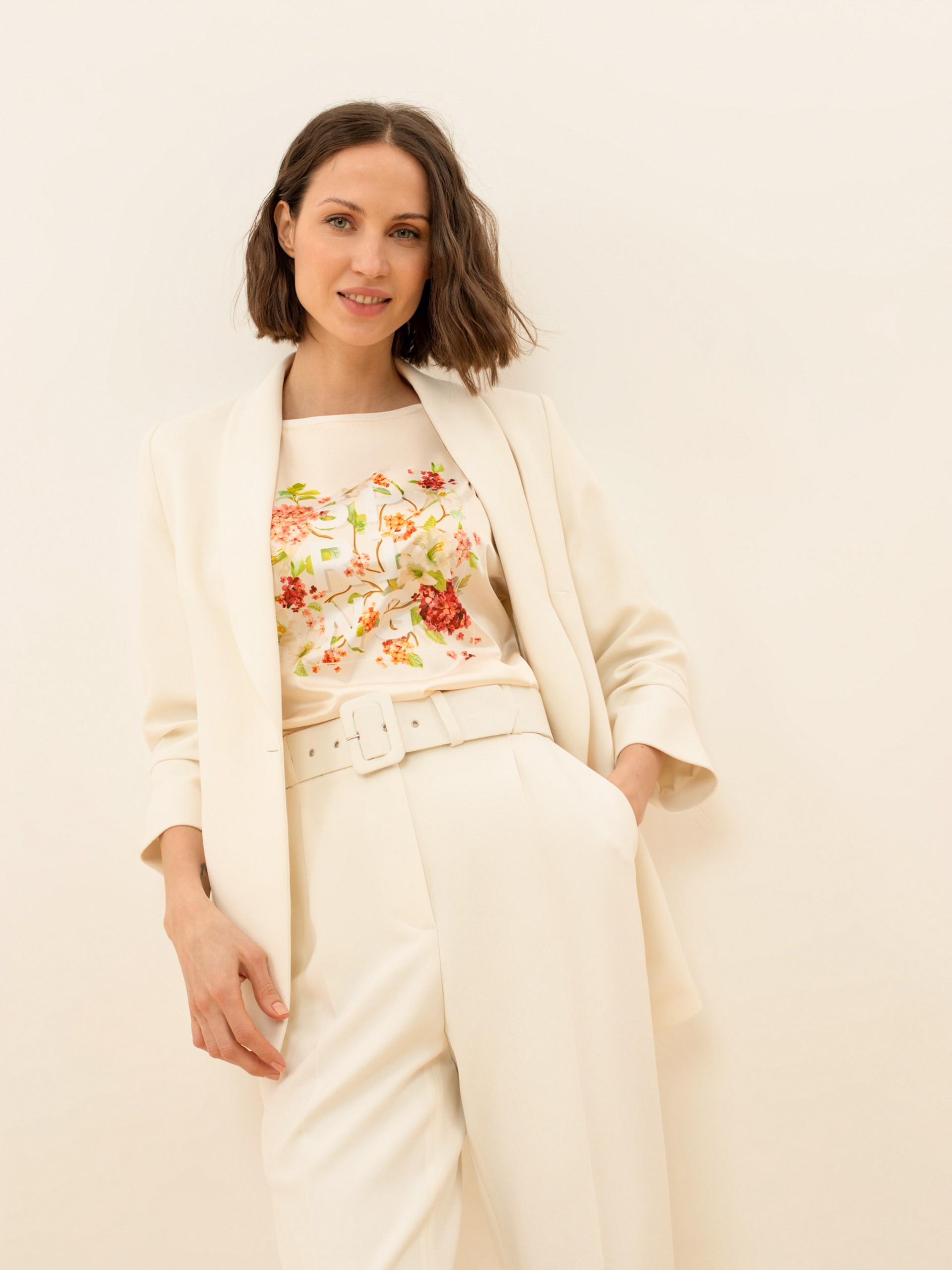 Блуза в стиле смарт-кэжуал, прямого силуэта. Вырез головины-лодочка. Рукав кимоно. Полочка из атласно белой ткани с монопринтом. Полочка из трикотажного полотна.