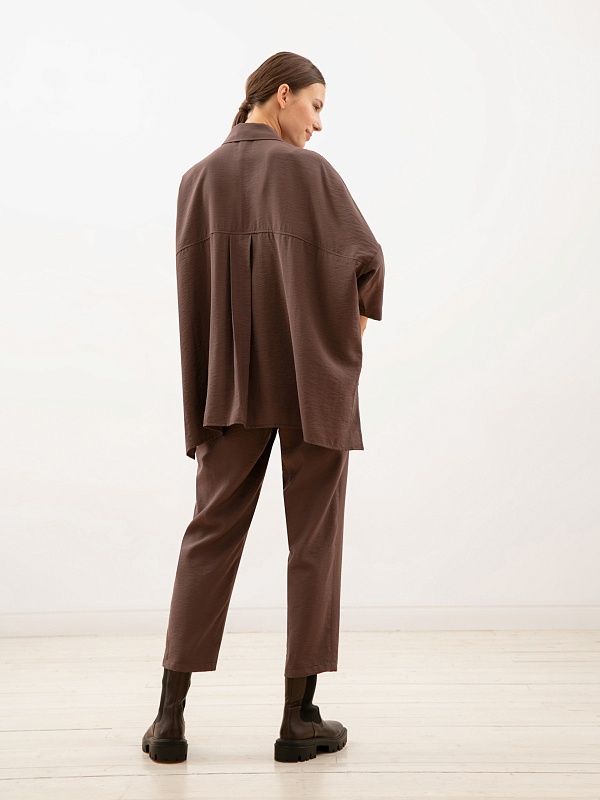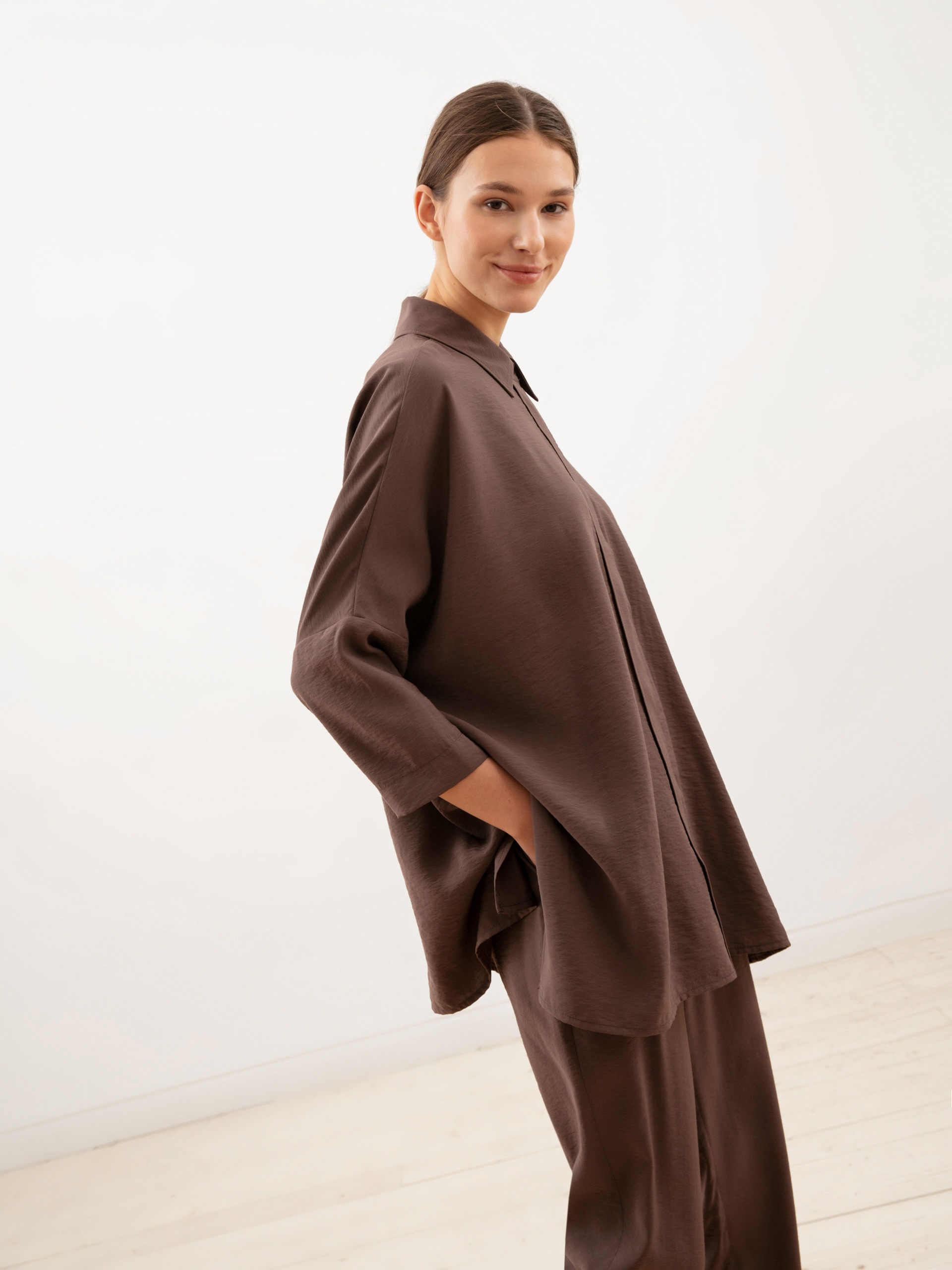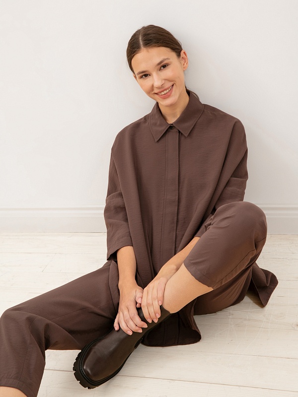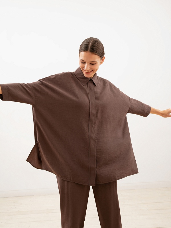 Трендовая блуза свободного кроя с рубашечным воротником и супатной застежкой. Рукав-кимоно 3/4 . По спинке кокетка, переходящая в рукав.