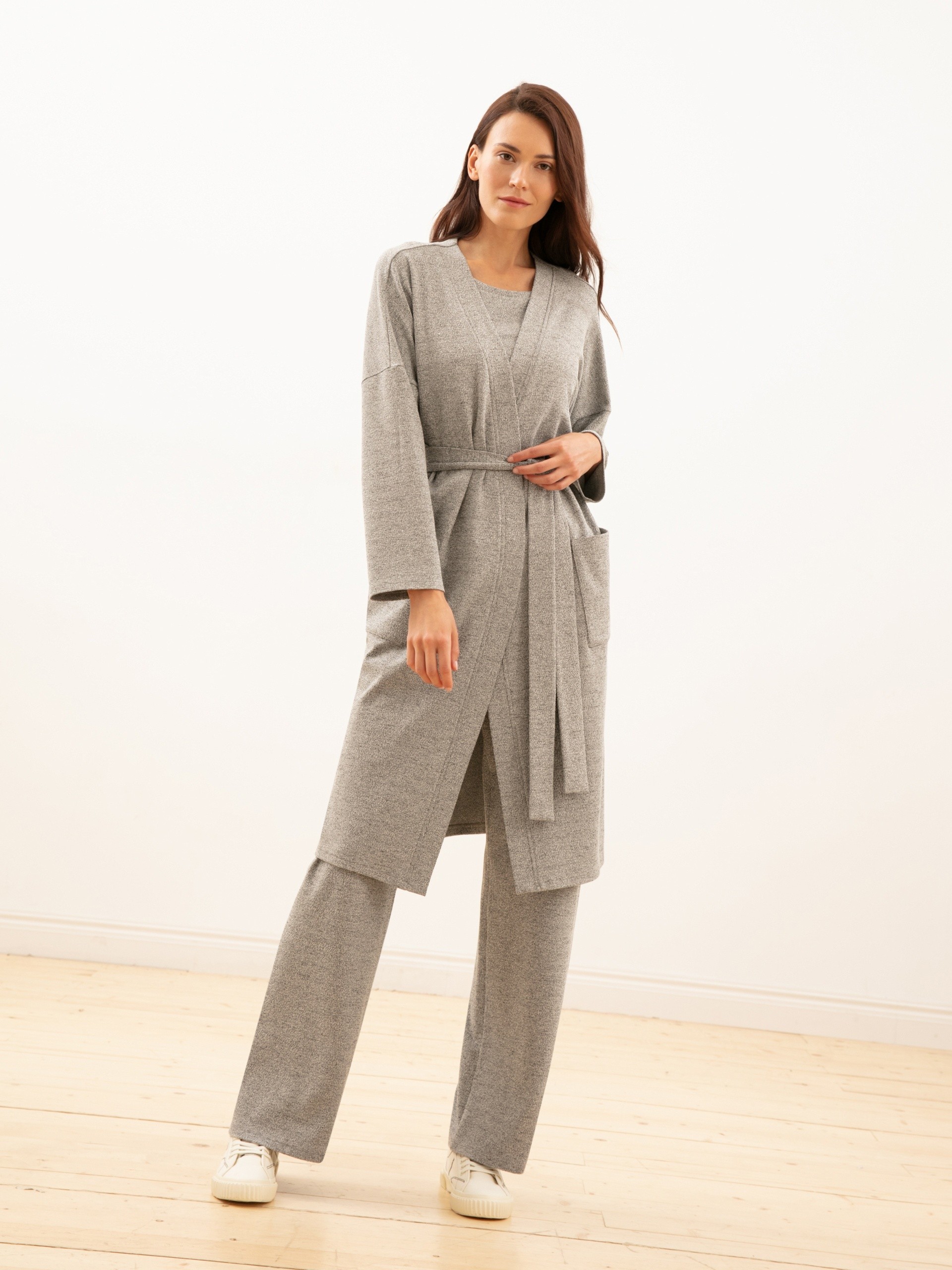 Кардиган из трикотажного полотна прямого силуэта с V-образным вырезом горловины, спущенным плечом и рукавом полной длины. Спереди крупные накладные карманы. Вдоль борта декоративная планка. Без застежки. С поясом из основного материала.
