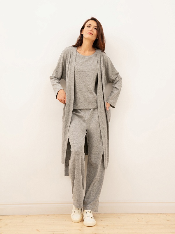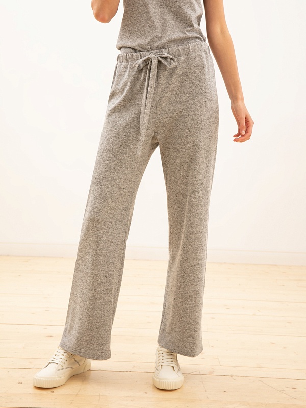 Комфортные и свободные брюки из трикотажа серого оттенка «меланж». Подходят для дома, спорта и отдыха.