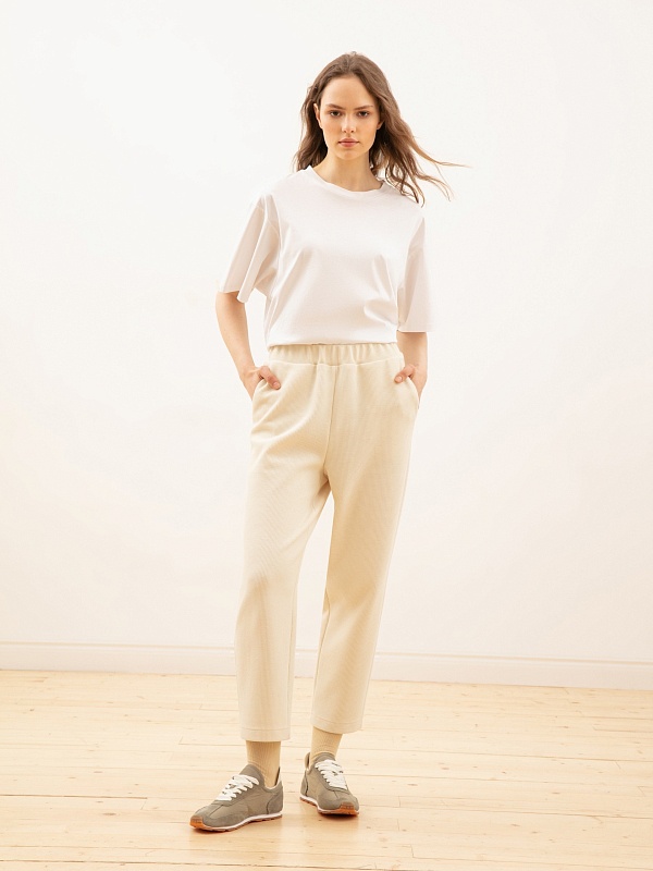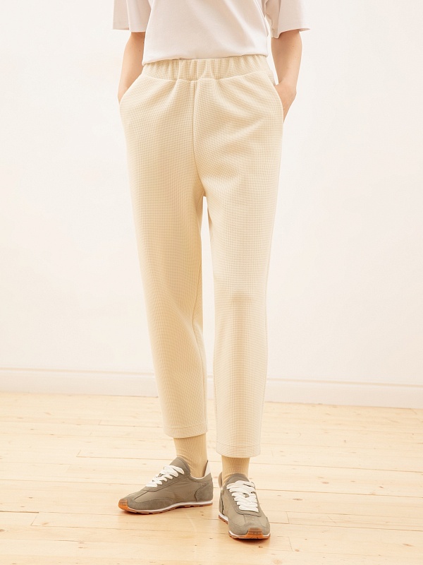 Комфортные брюки из фактурного трикотажа теплого молочного оттенка. Дополните образ толстовкой или худи из той же ткани.