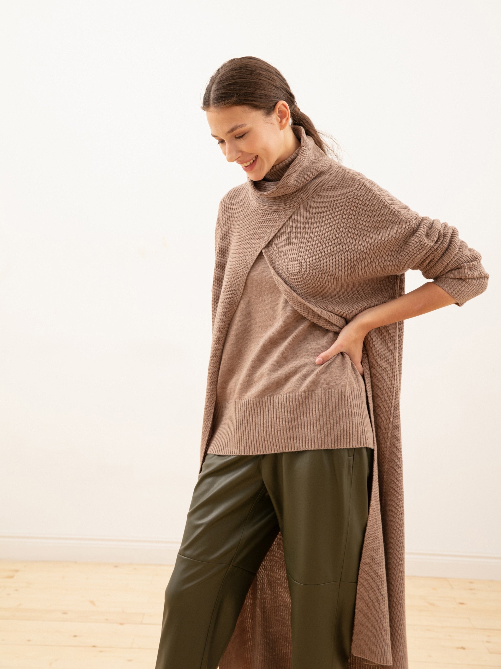 Жакет из фактурного вязаного трикотажа прямого силуэта с воротником стойка, спущенным плечом и рукавом полной длины. Спереди треугольный вырез с запахом.