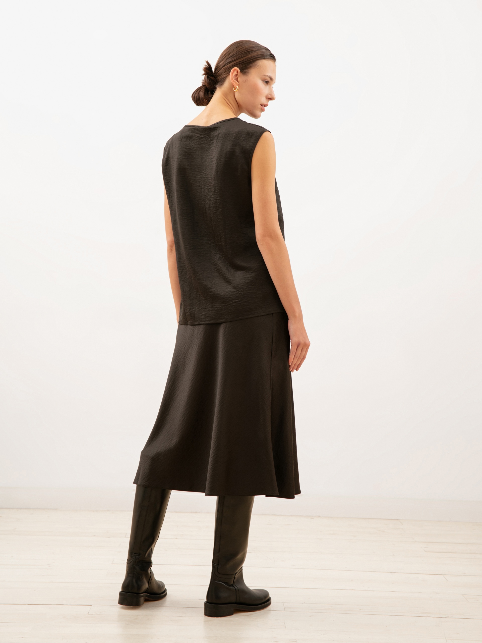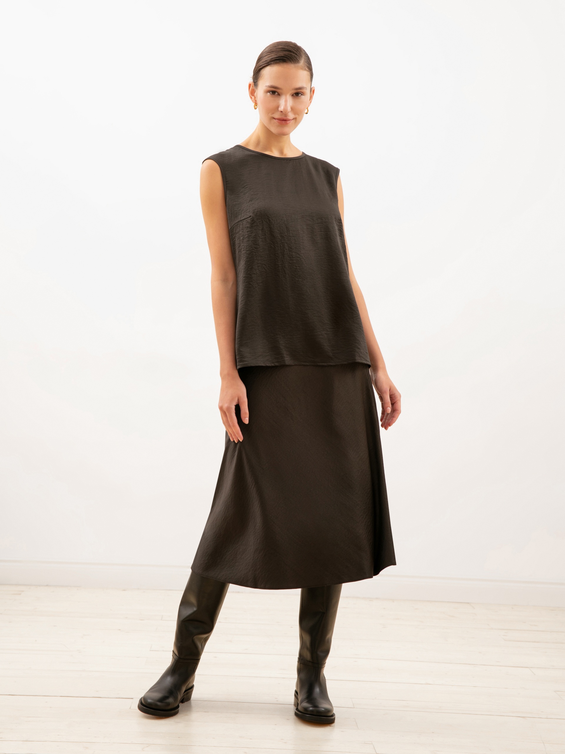 Минималистичный топ из жатого атласа тёмно-зелёного оттенка.