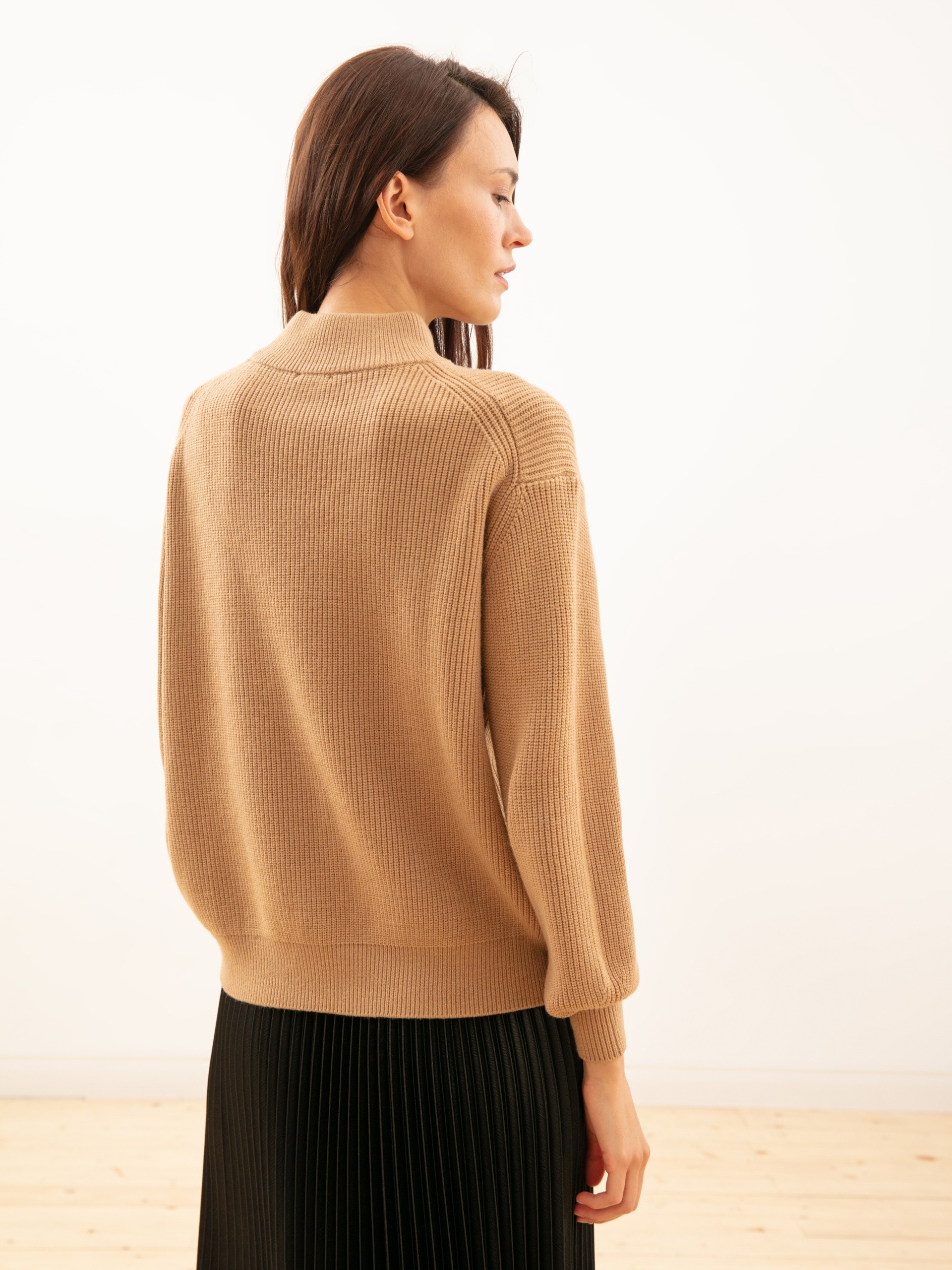 Свитер в стиле кэжуал прямого силуэта. Воротник стойка-резинка. Рукав рубашечный полной длины, на манжете с резинкой.