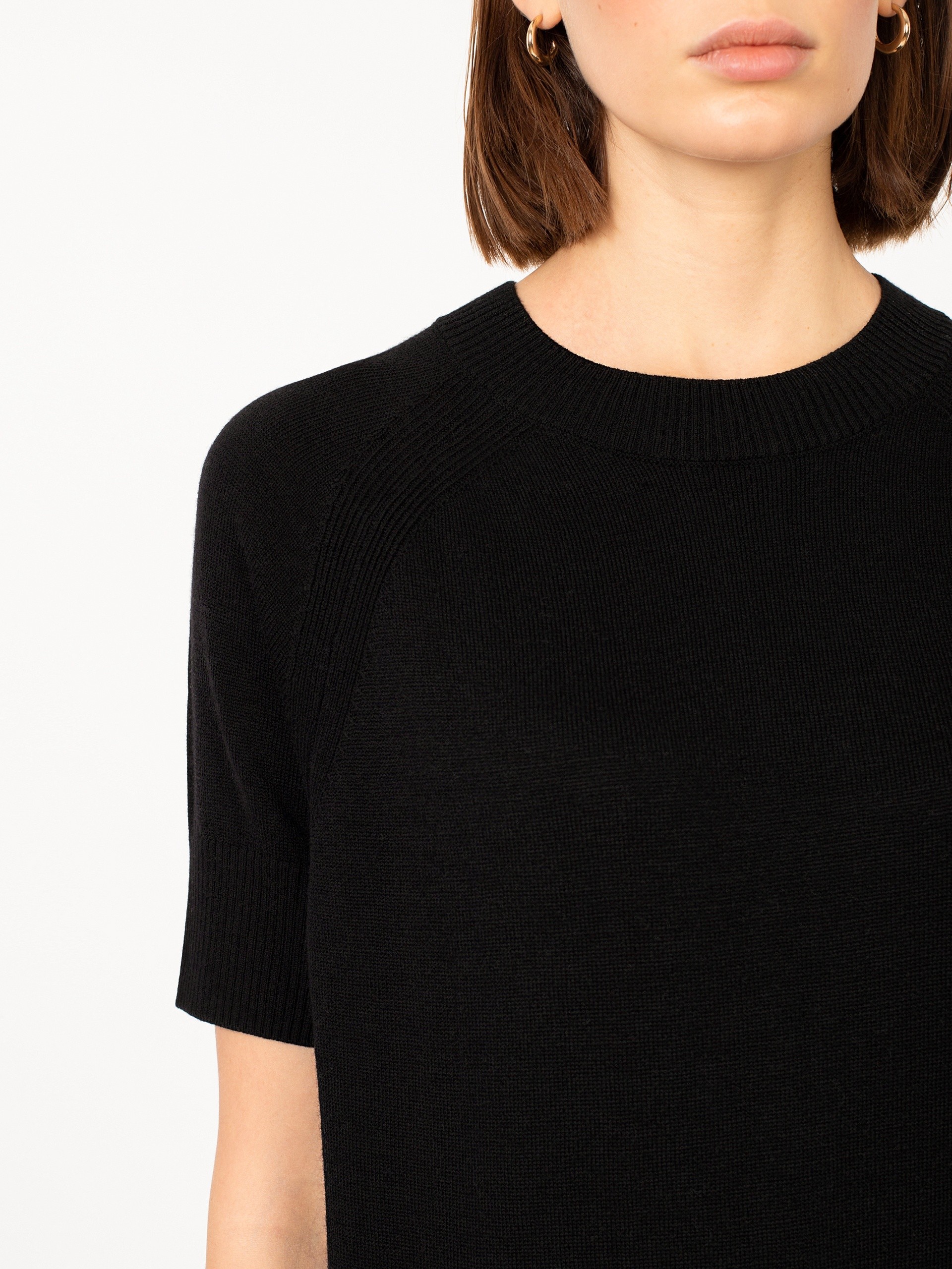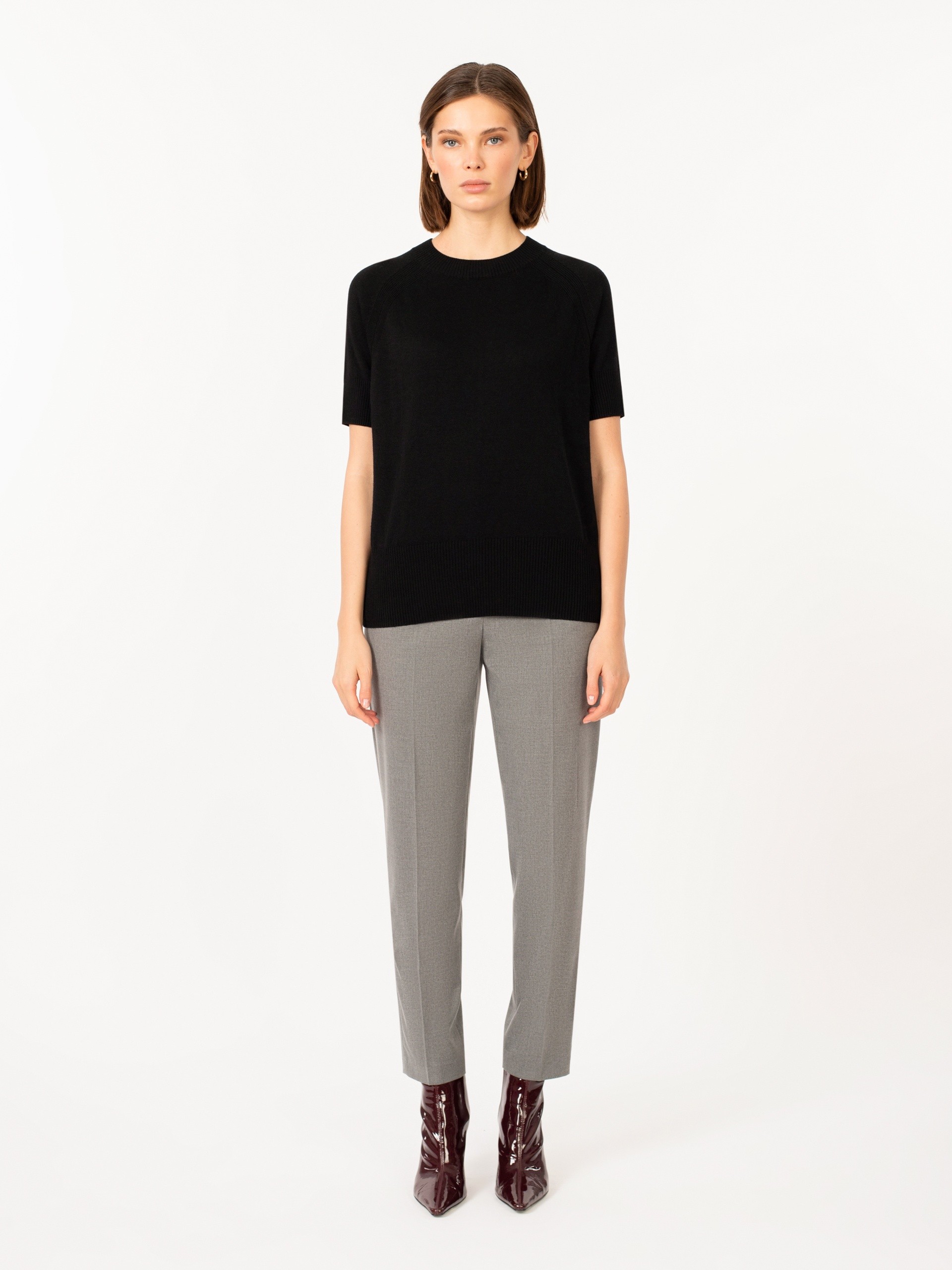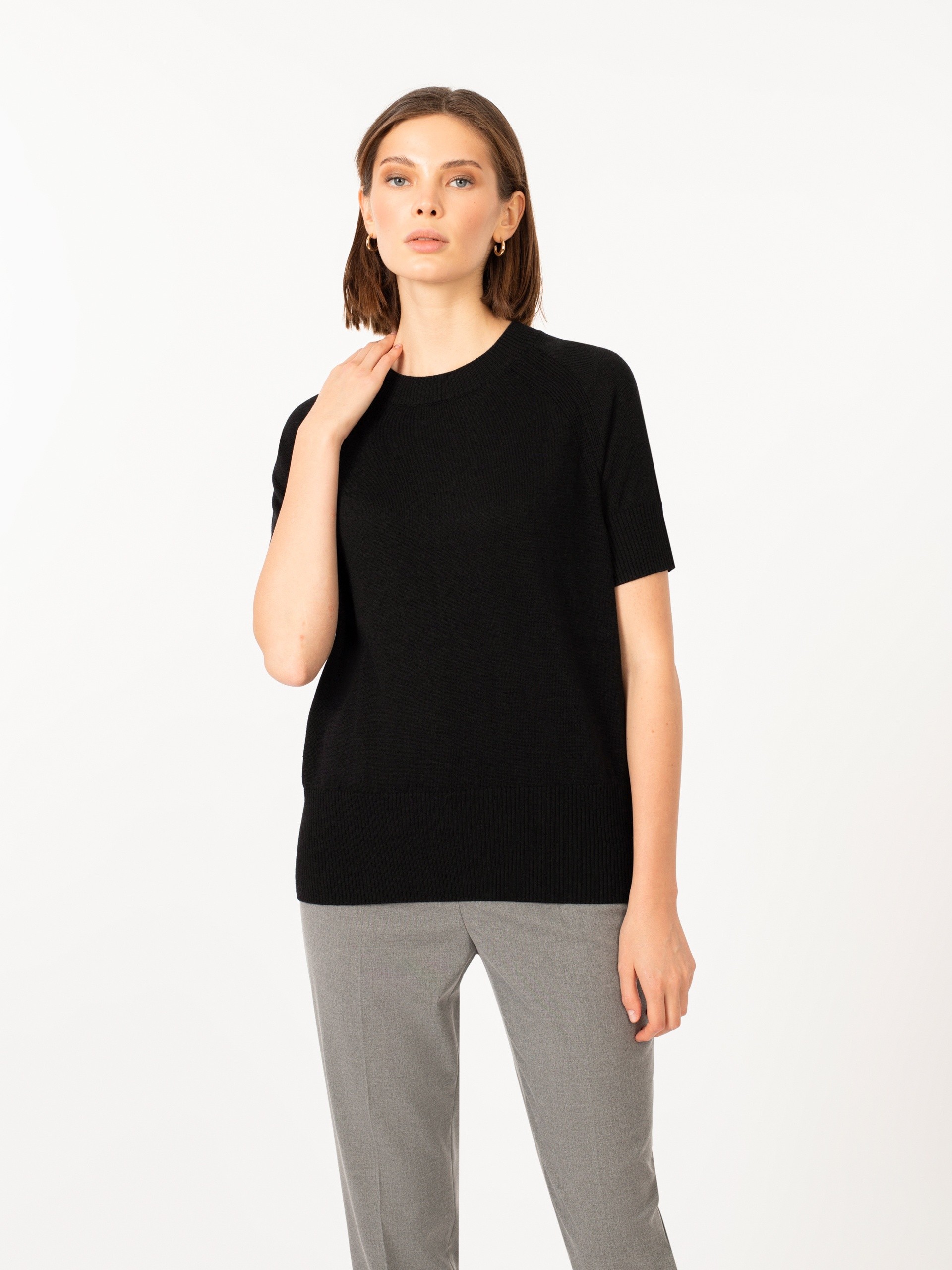 Джемпер в стиле кэжуал, свободного силуэта. Круглый вырез горловины, воротник связан в резинку. Рукав реглан до линии локтя. По низу изделия пояс-резинка, по низу рукавов - резинка .