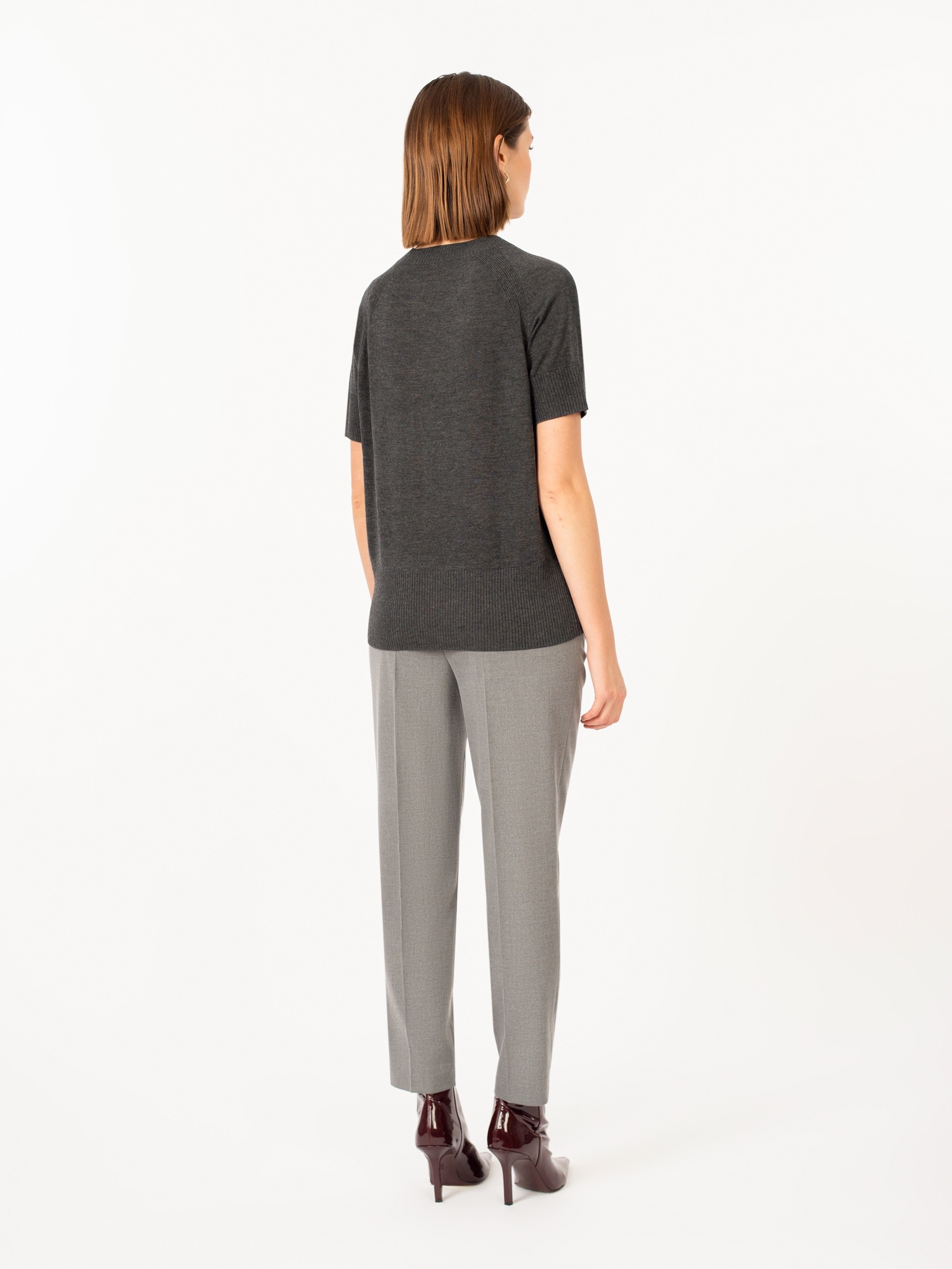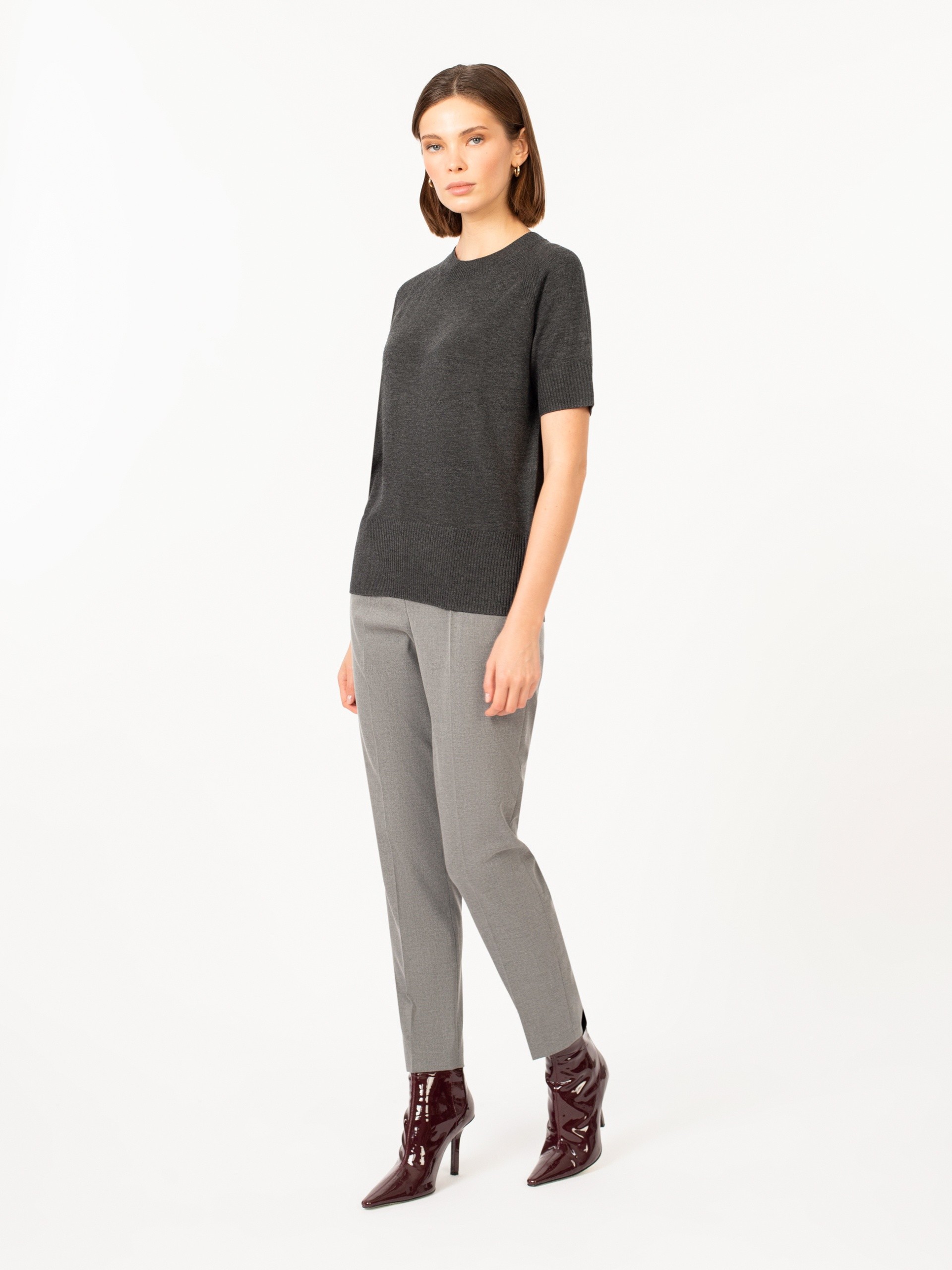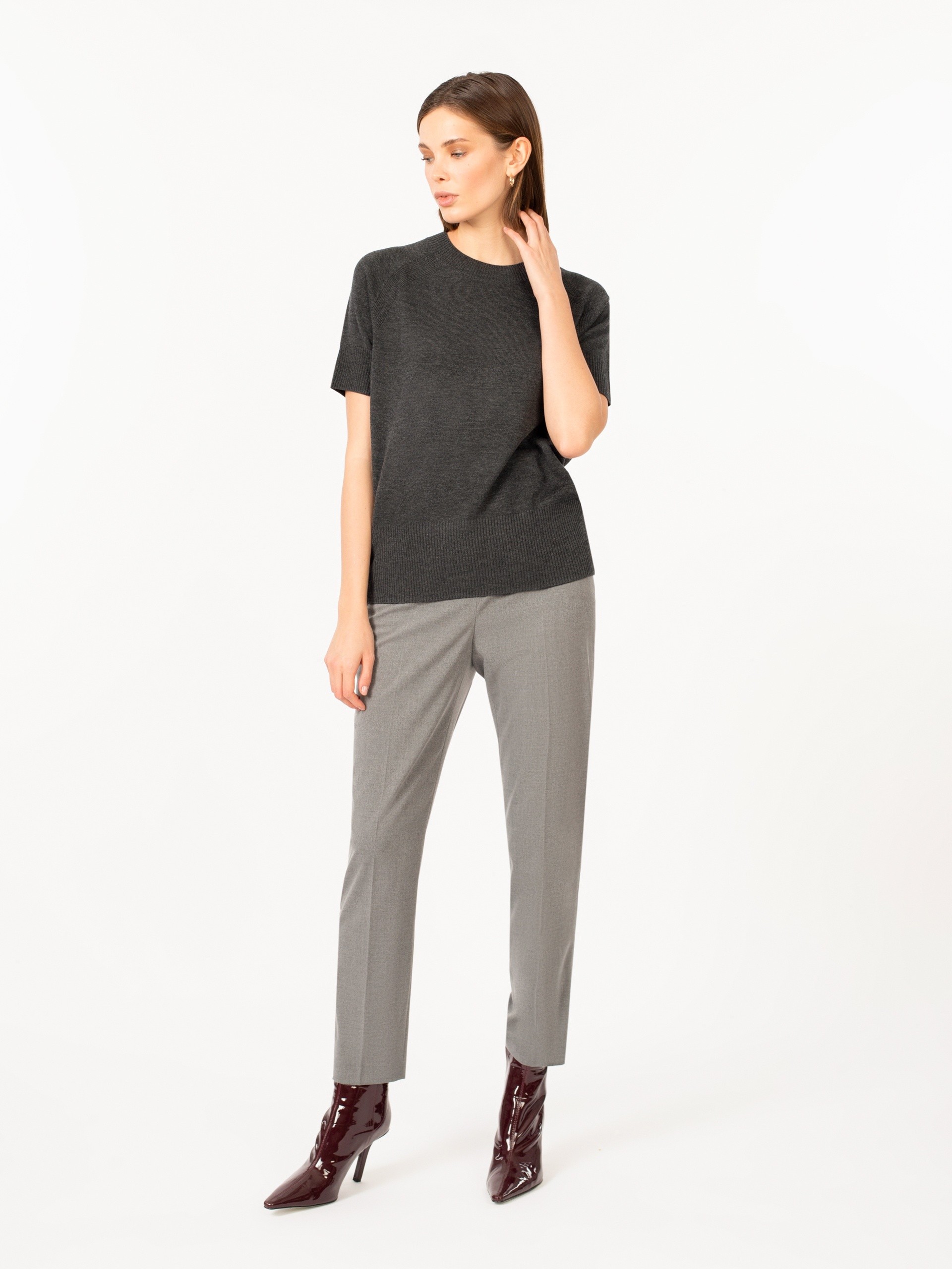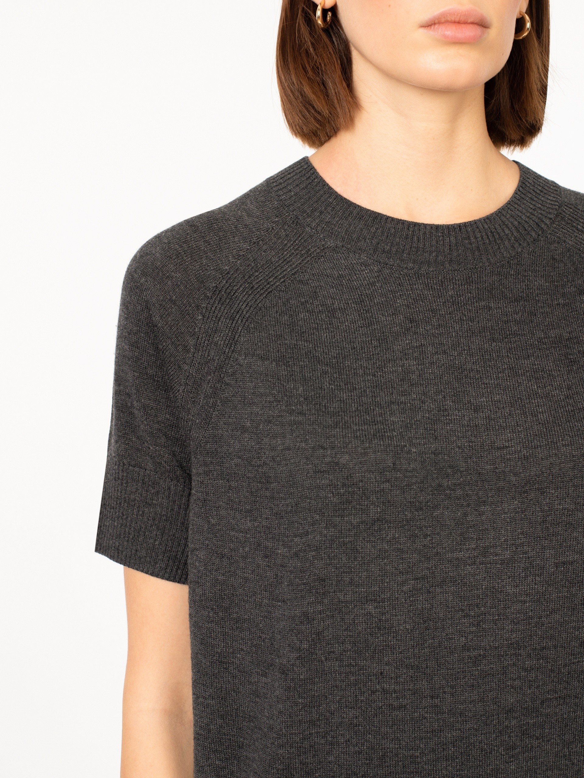 Джемпер в стиле кэжуал, свободного силуэта. Круглый вырез горловины, воротник связан в резинку. Рукав реглан до линии локтя. По низу изделия пояс-резинка, по низу рукавов - резинка .