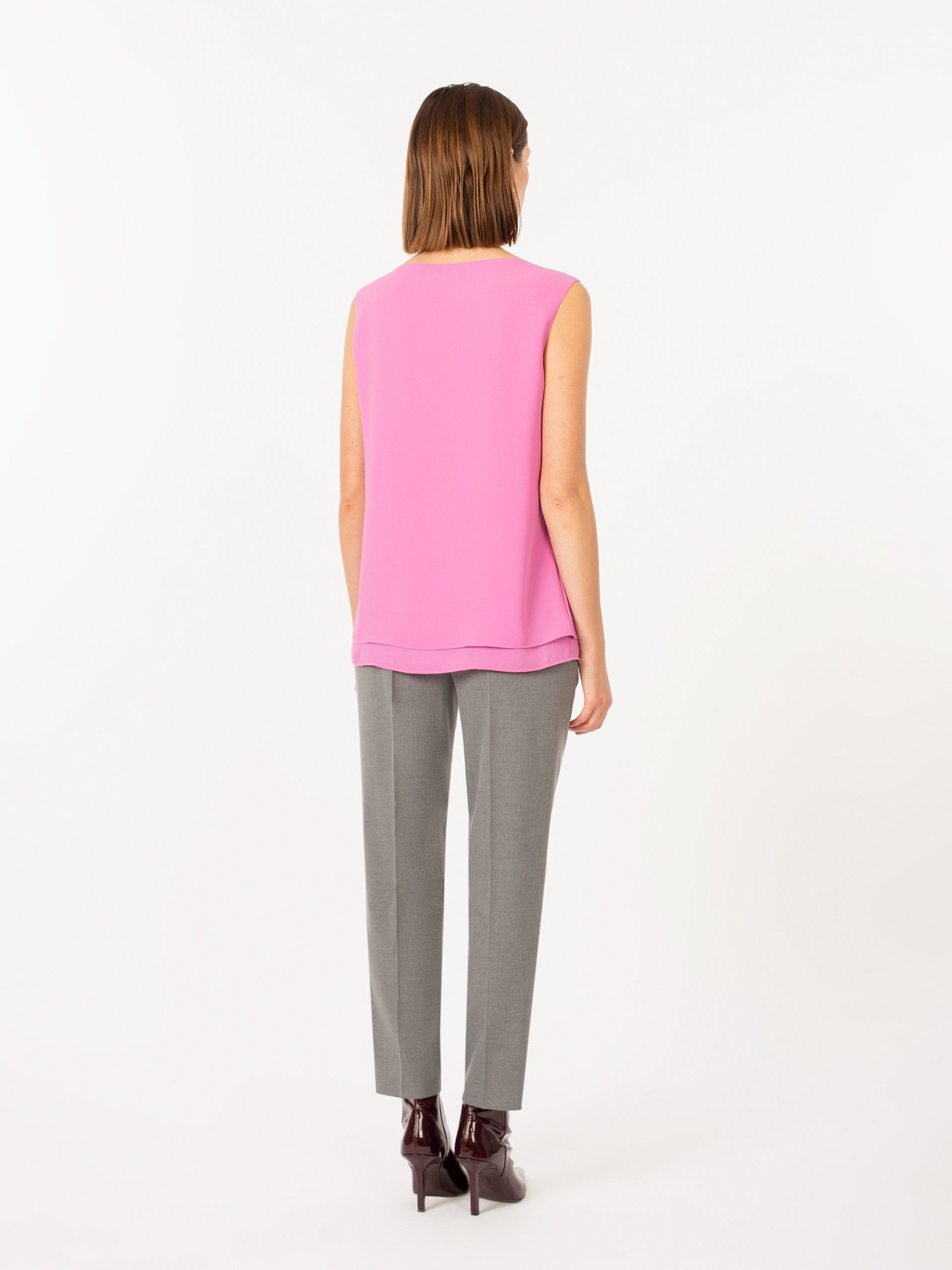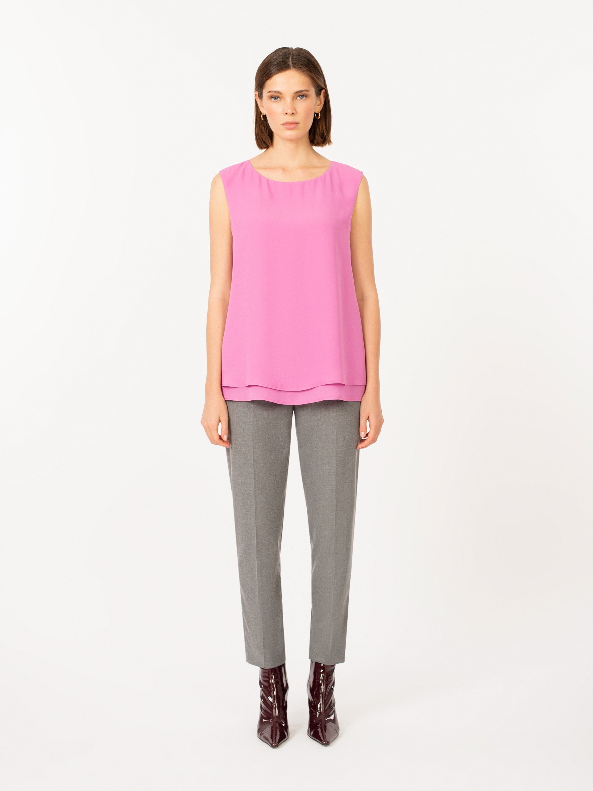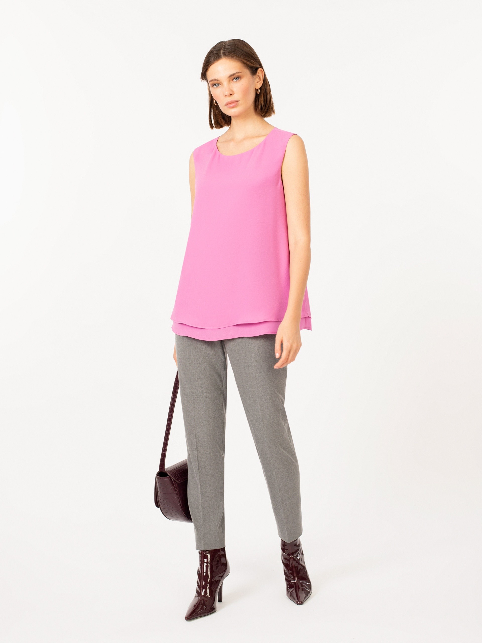 Блуза прямого силуэта из полупрозрачной ткани без рукавов с круглым вырезом горловины.