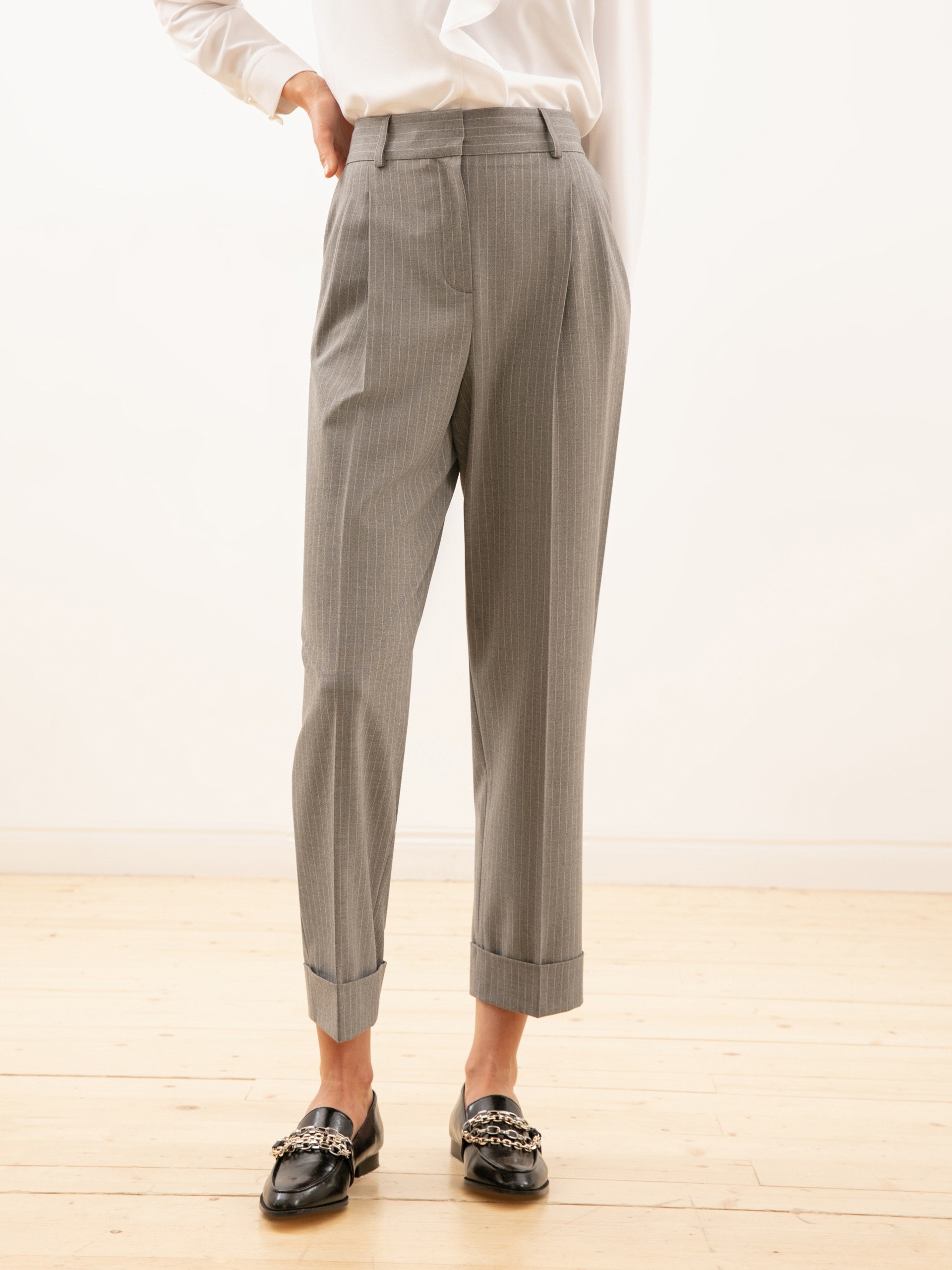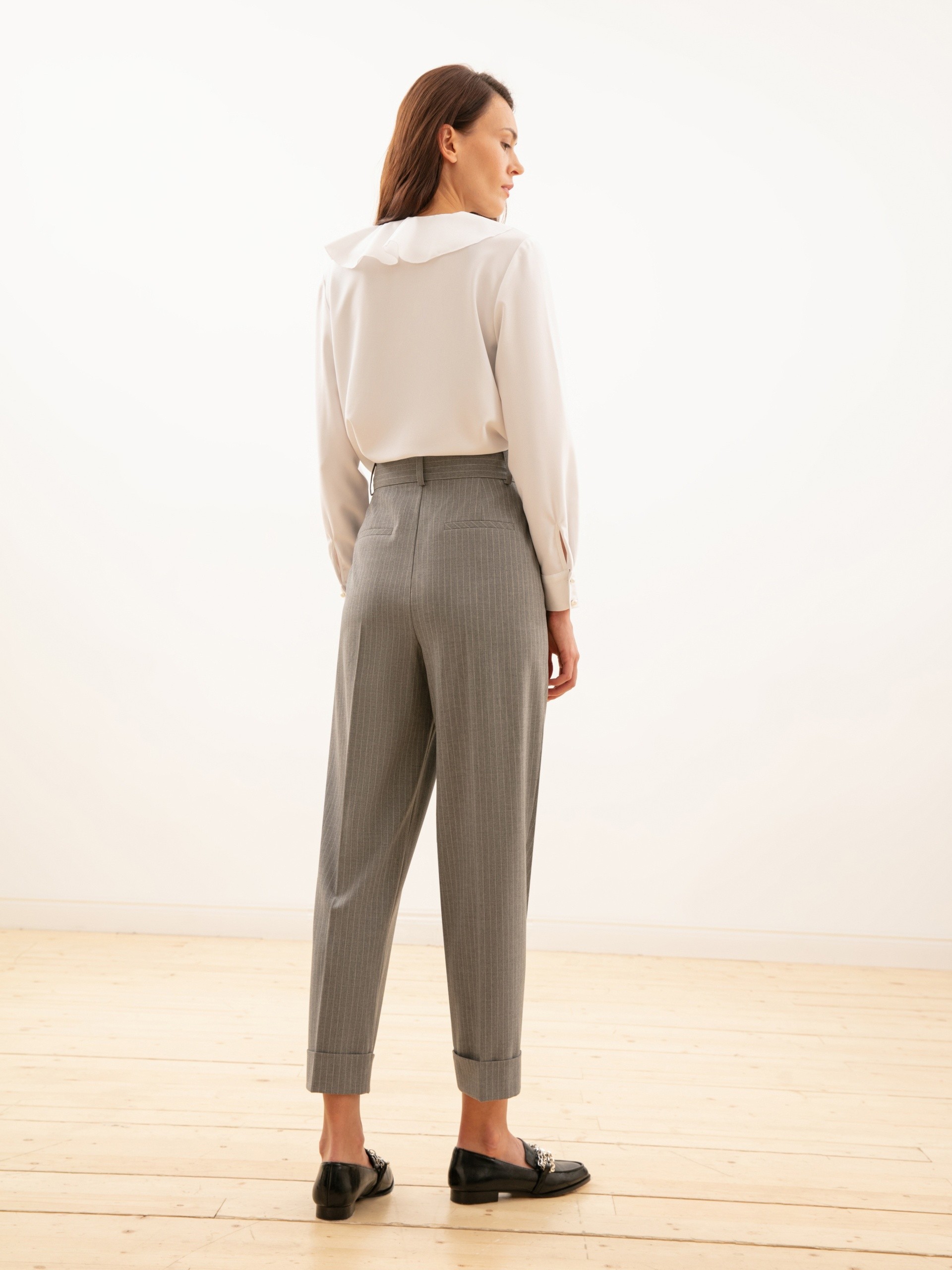 Трендовые брюки прямого силуэта. Высокая посадка. Спереди складки. Застежка на молнию и брючный крючок. Боковые карманы рабочие.