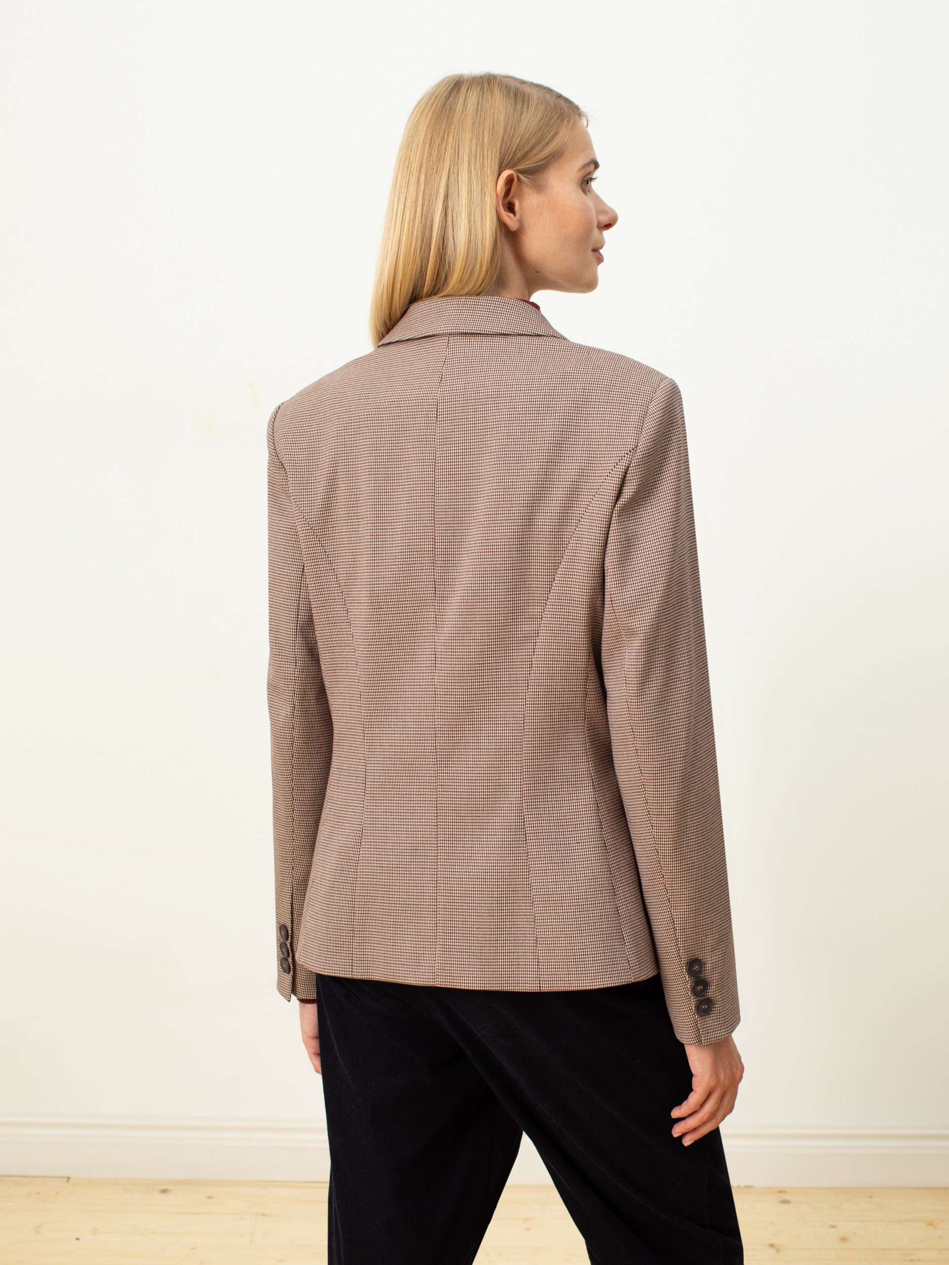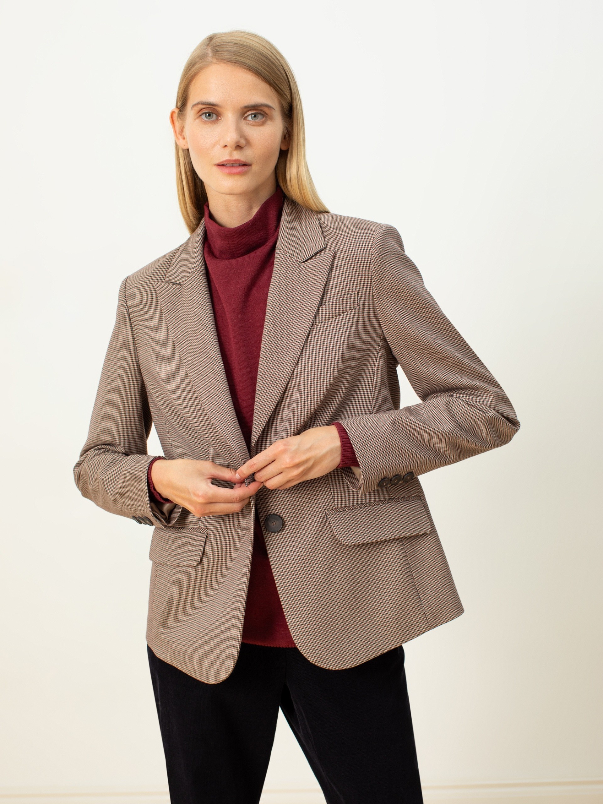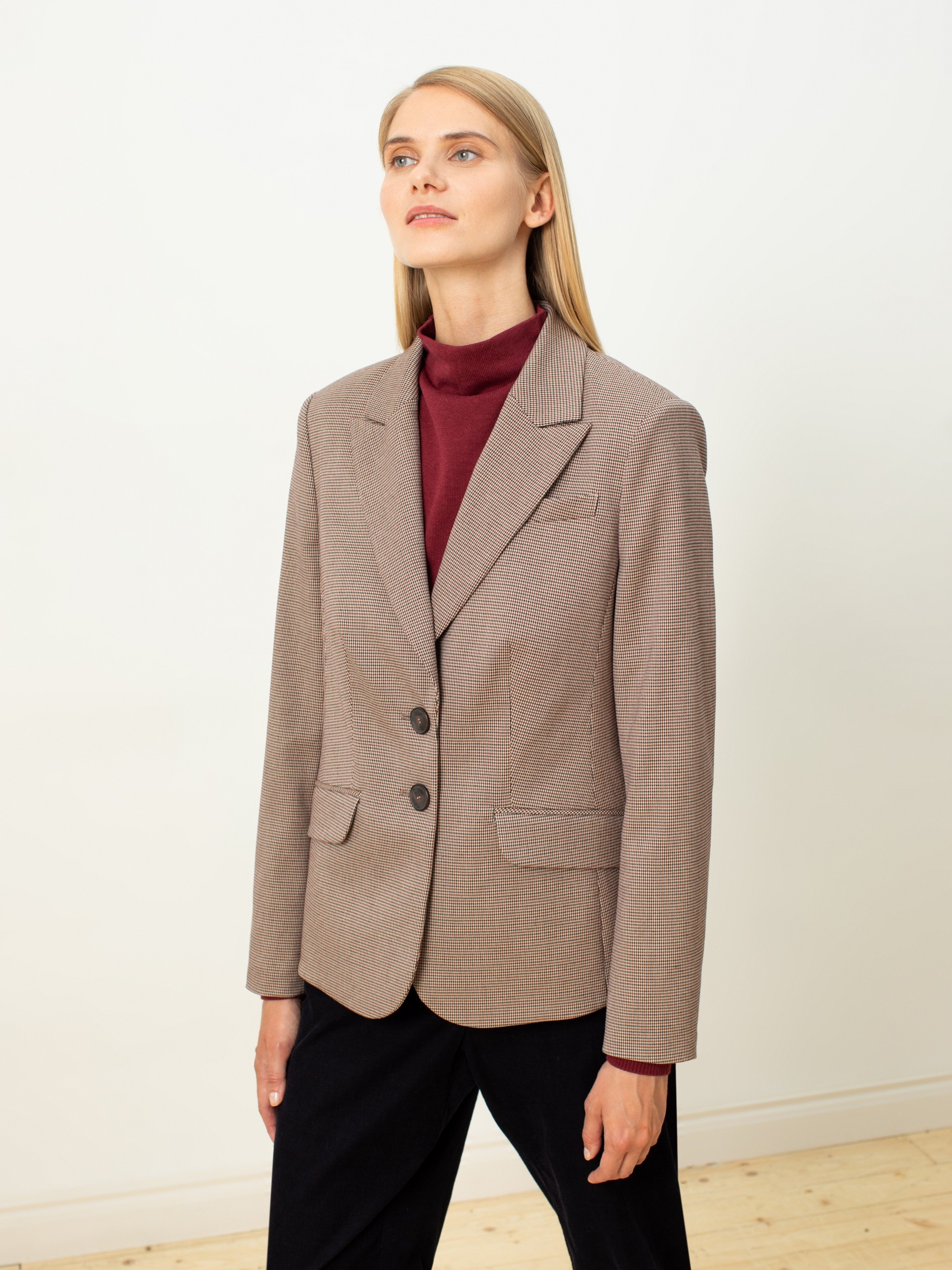 Жакет в классическом стиле, полуприлегающего силуэта, на подкладке. Застежка на пуговицы. Воротник английский. Рукав втачной. Карманы с клапаном.