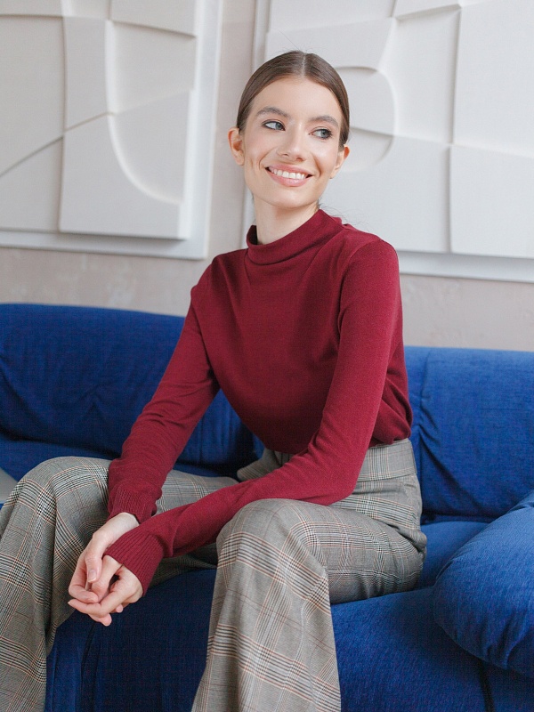 Свитер вязаный в стиле кэжуал, прямого силуэта. Воротник - стойка цельно-вывязанная. Рукав втачной полной длины.