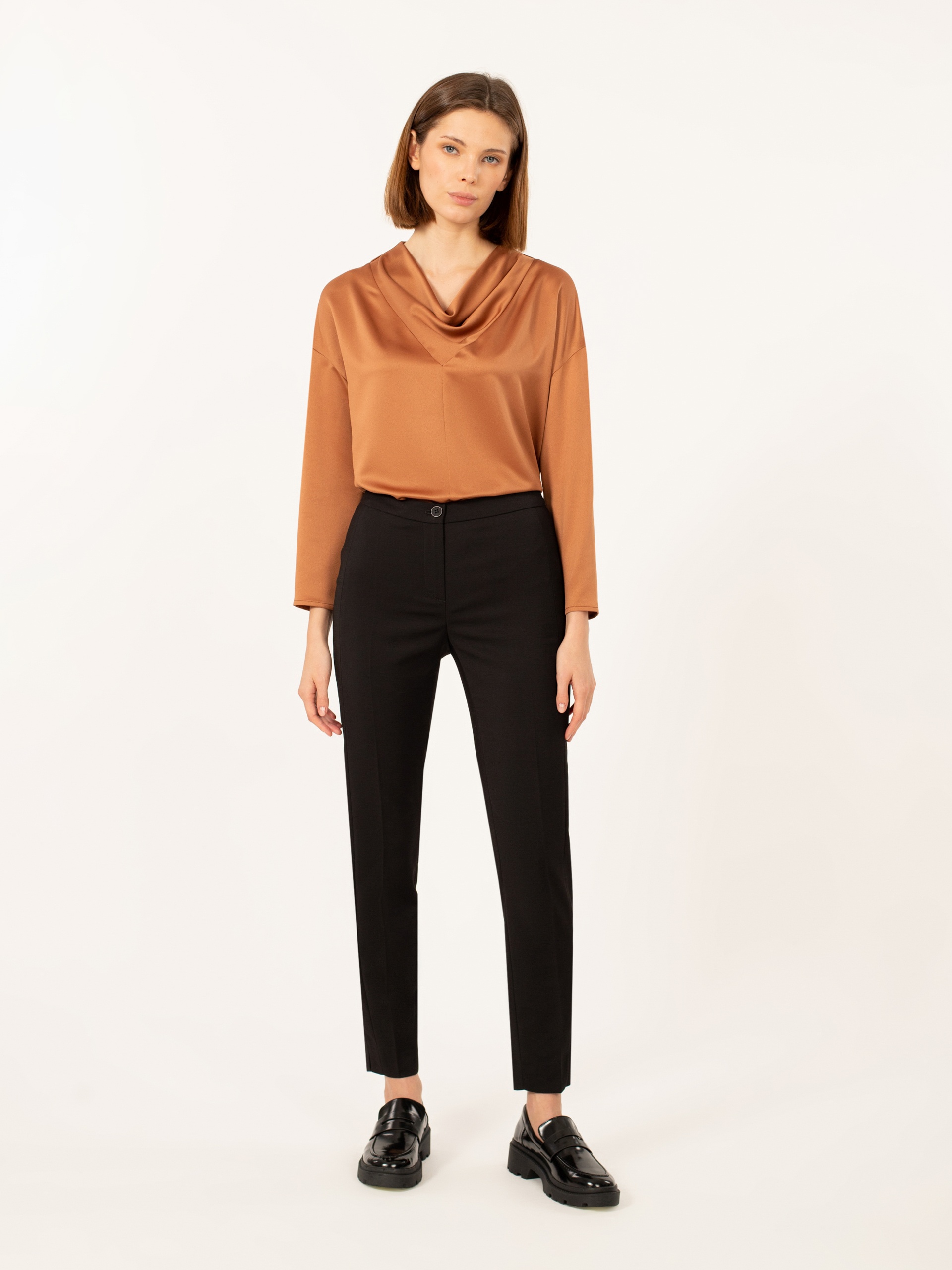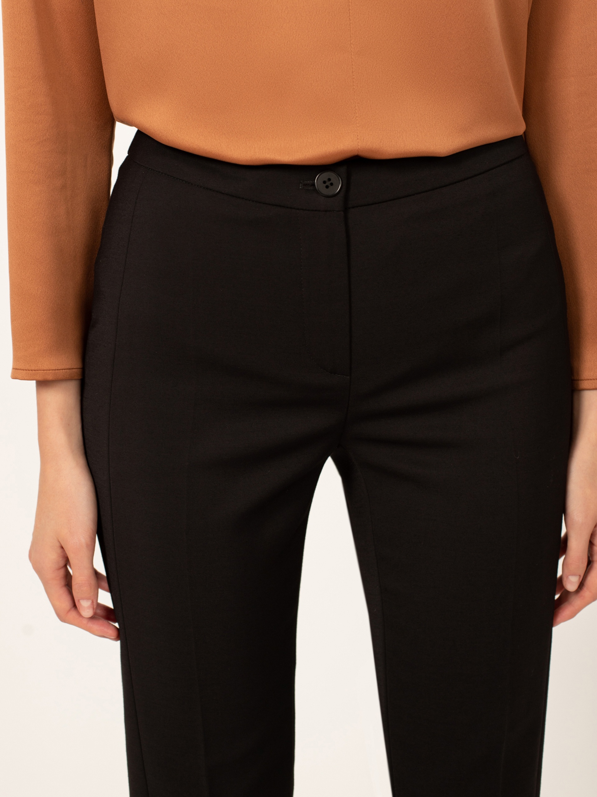 Классические брюки зауженного силуэта, длина 7/8. Средняя посадка. На притачном поясе . Застежка на молнию и пуговицу. Спереди горизонтальные карманы.