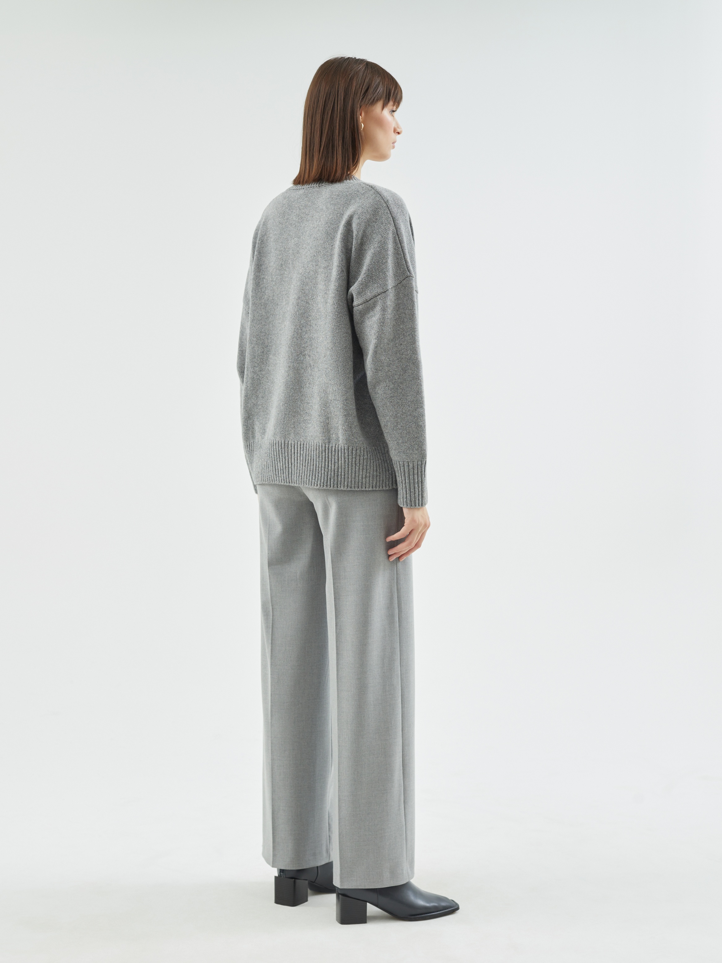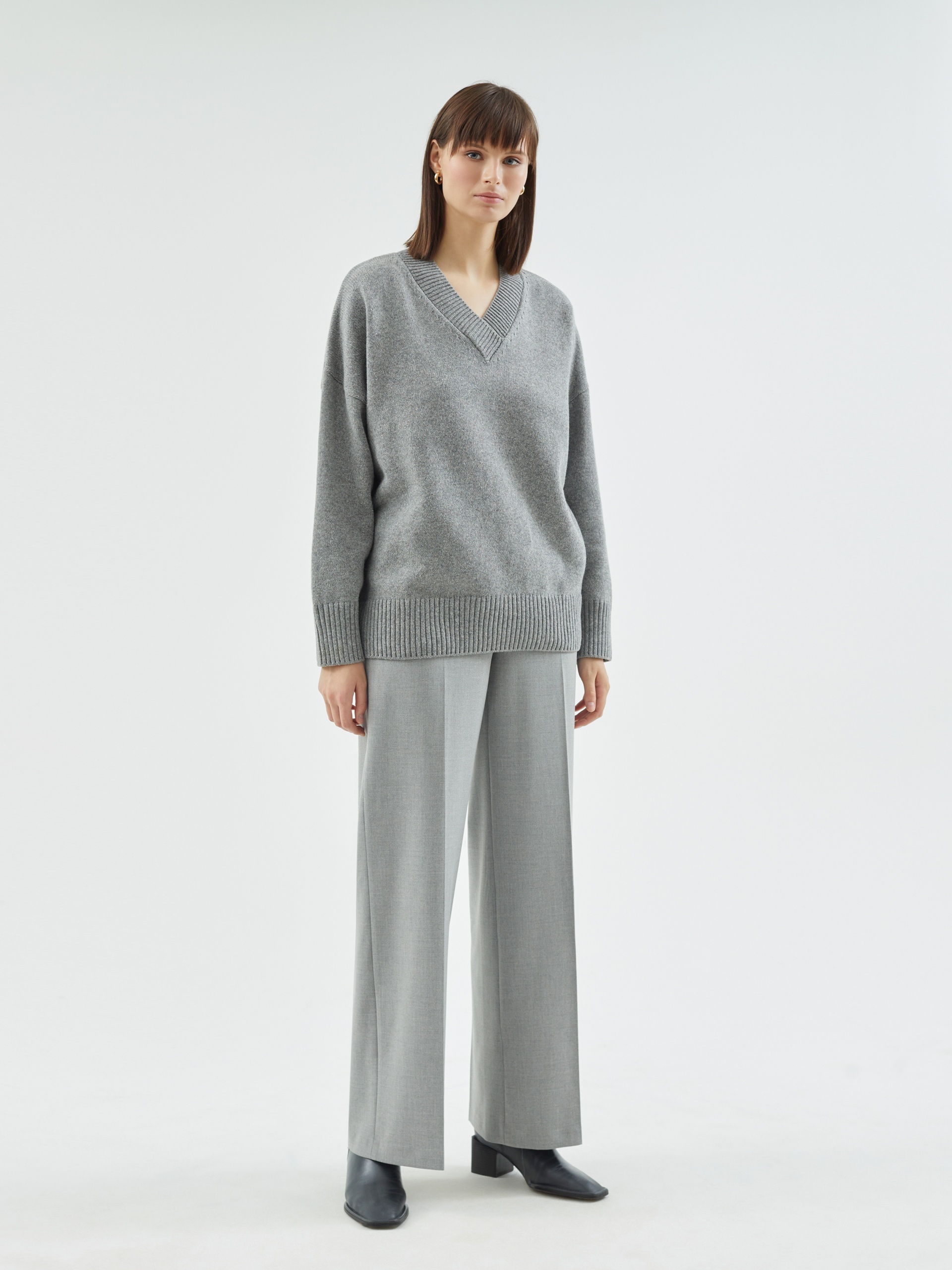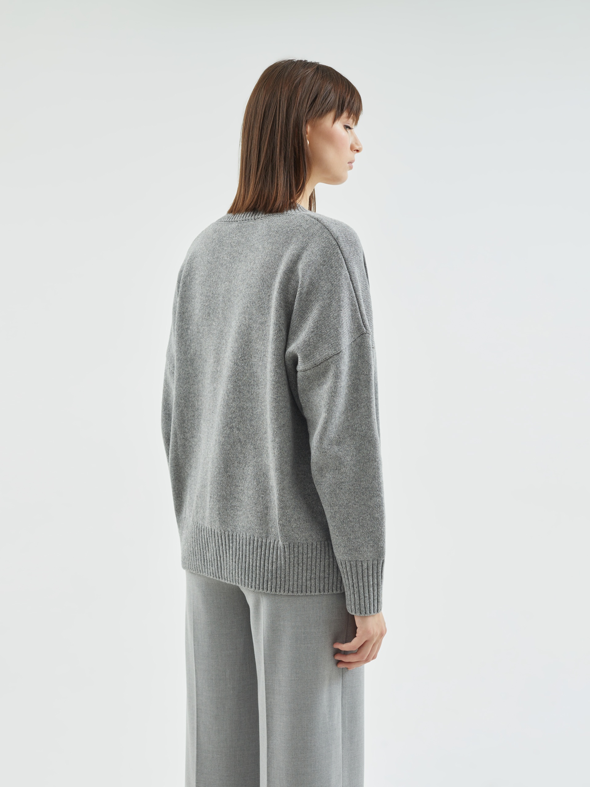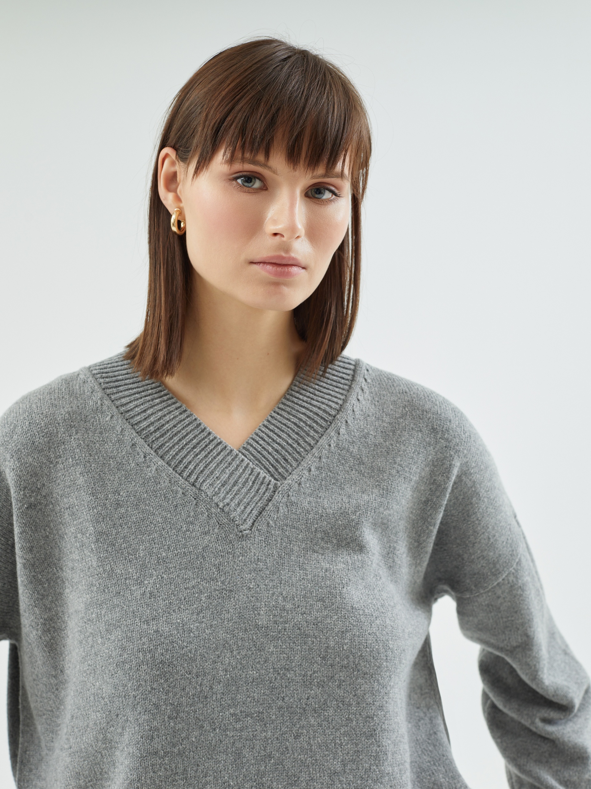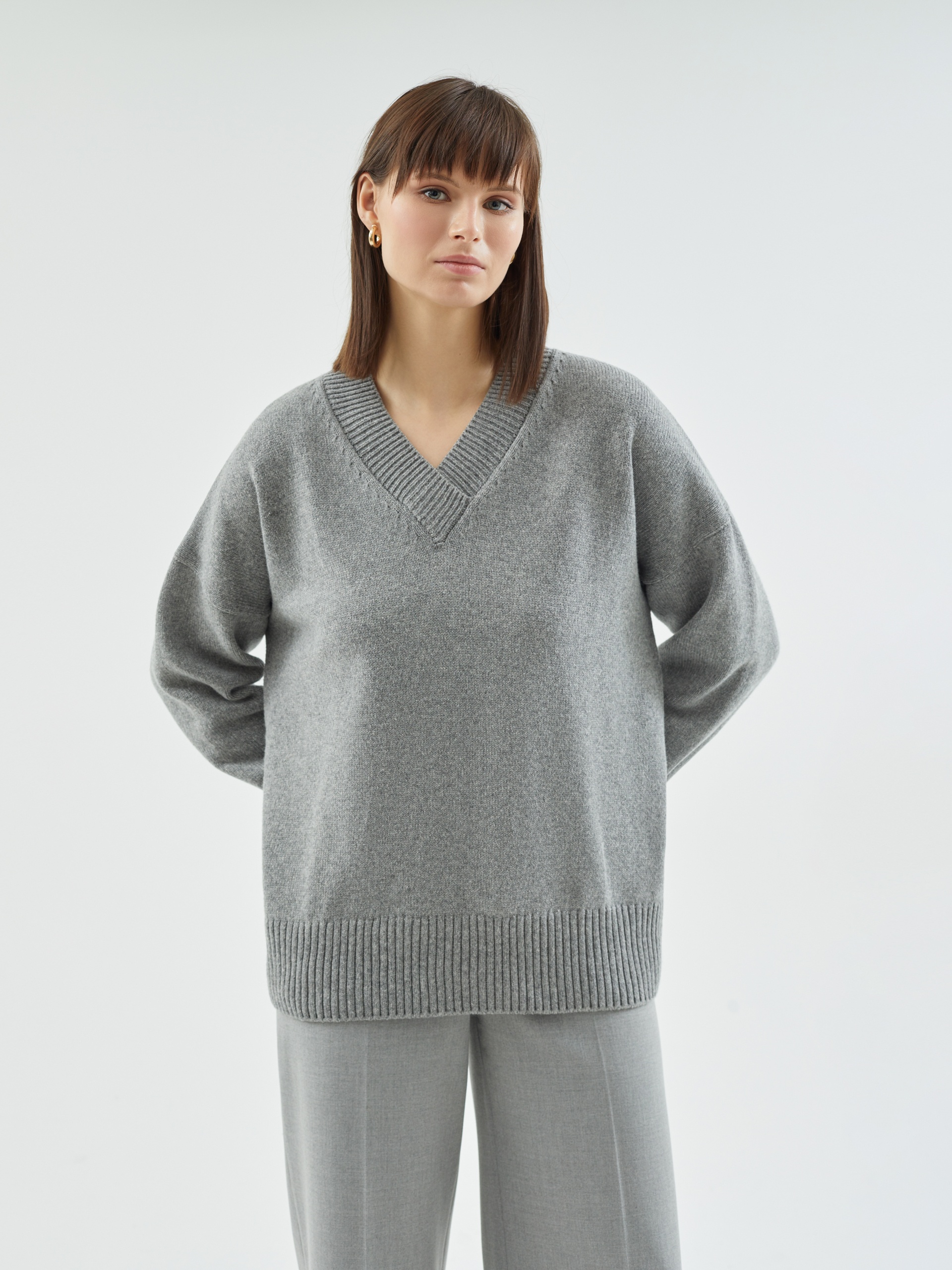 Джемпер женский в стиле кэжуал, прямого силуэта. V-образный вырез горловины, воротник связан в резинку. Рукав кимоно отрезной. По низу изделия пояс-резинка, по низу рукавов резинка.