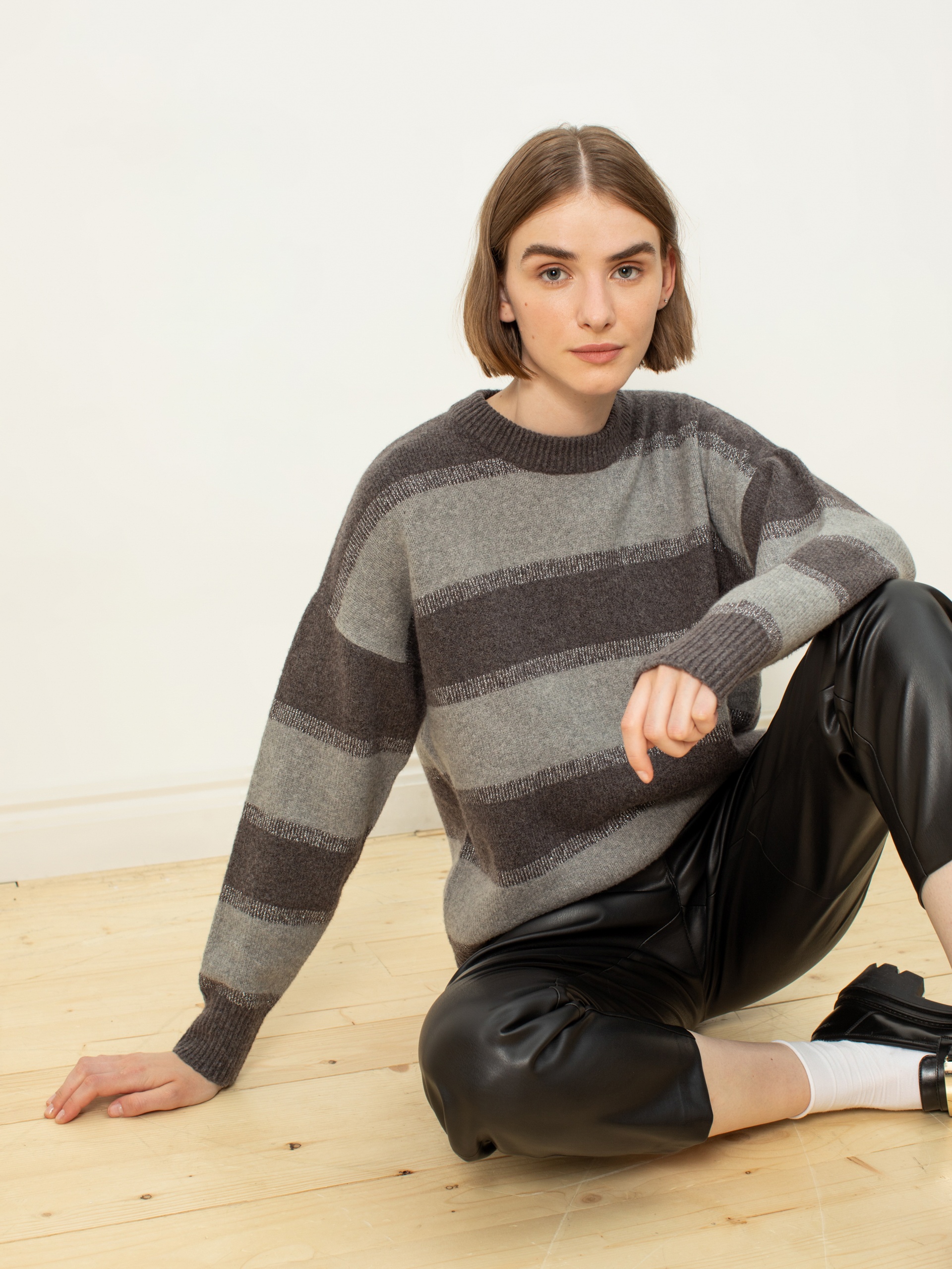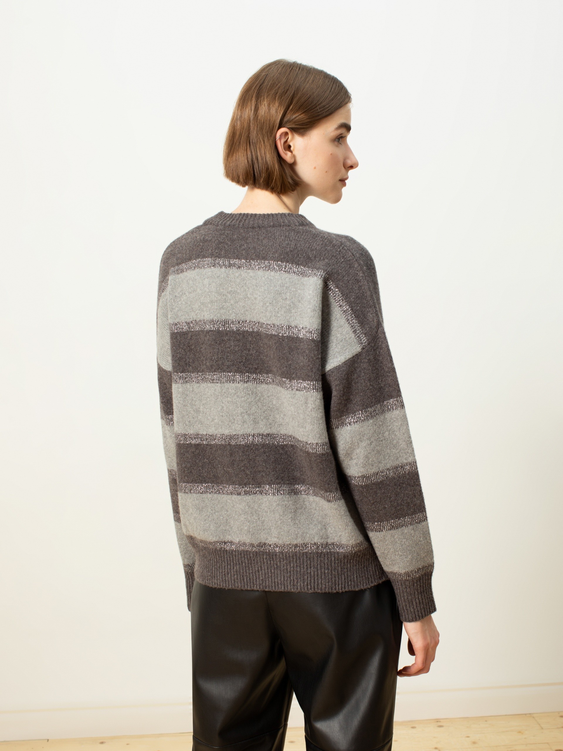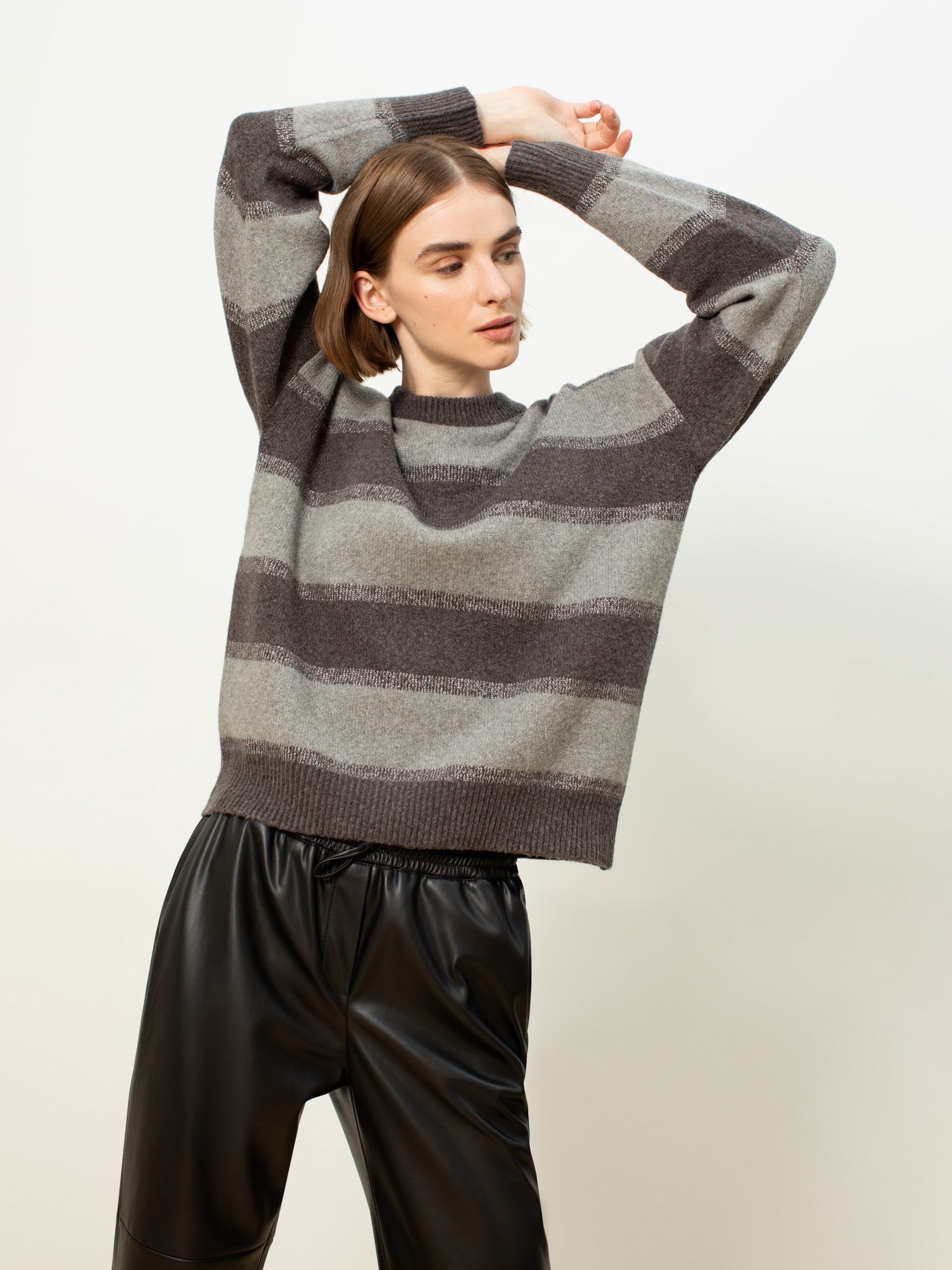 Джемпер в стиле кэжуал, прямого силуэта, с использованием нити люрекса. О-образный вырез горловины, воротник связан в резинку. Рукав реглан. По низу изделия пояс-резинка, по низу рукавов резинка. Рисунчатый вид переплетения.