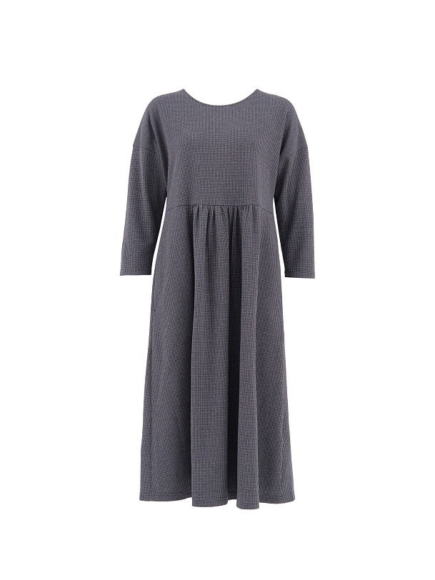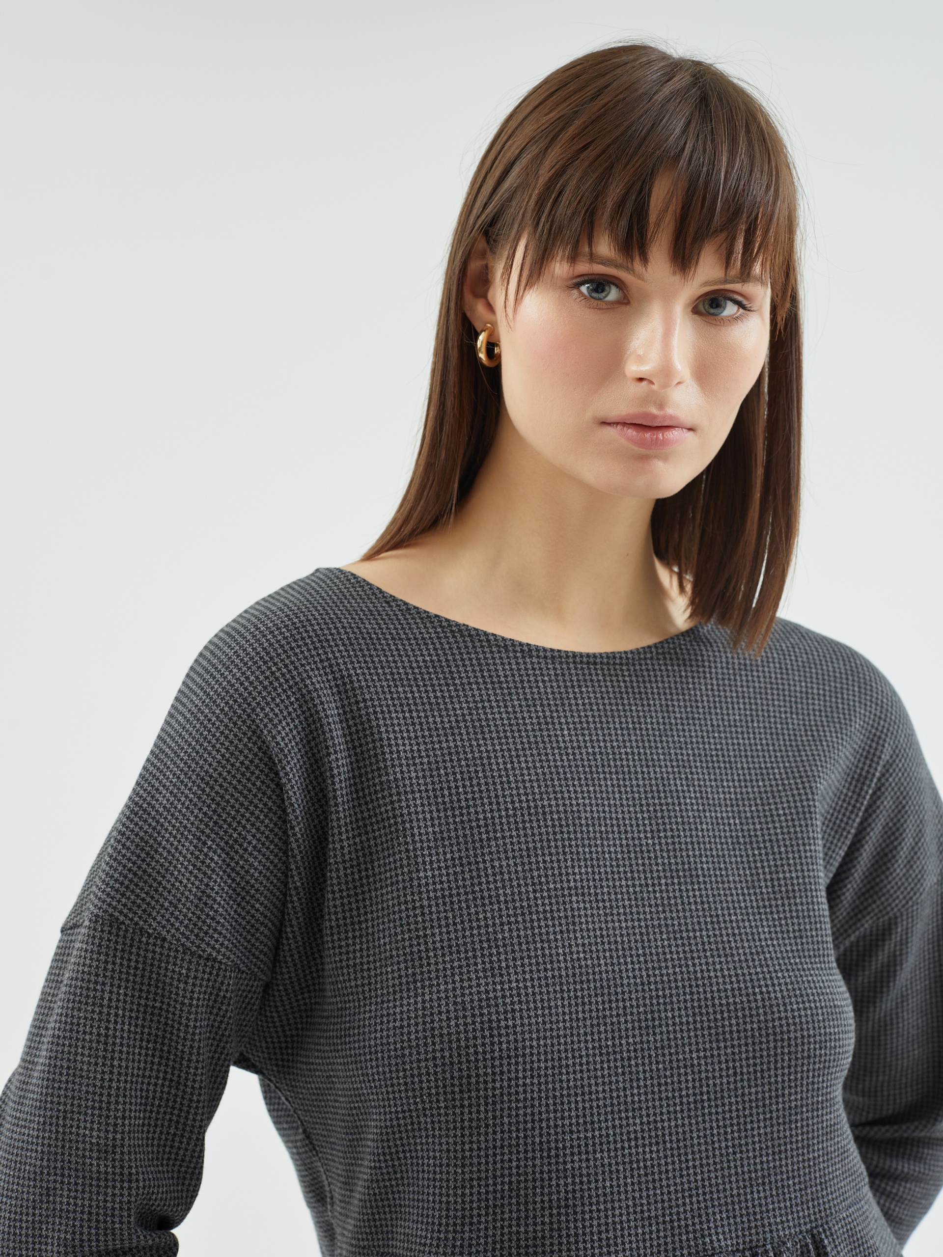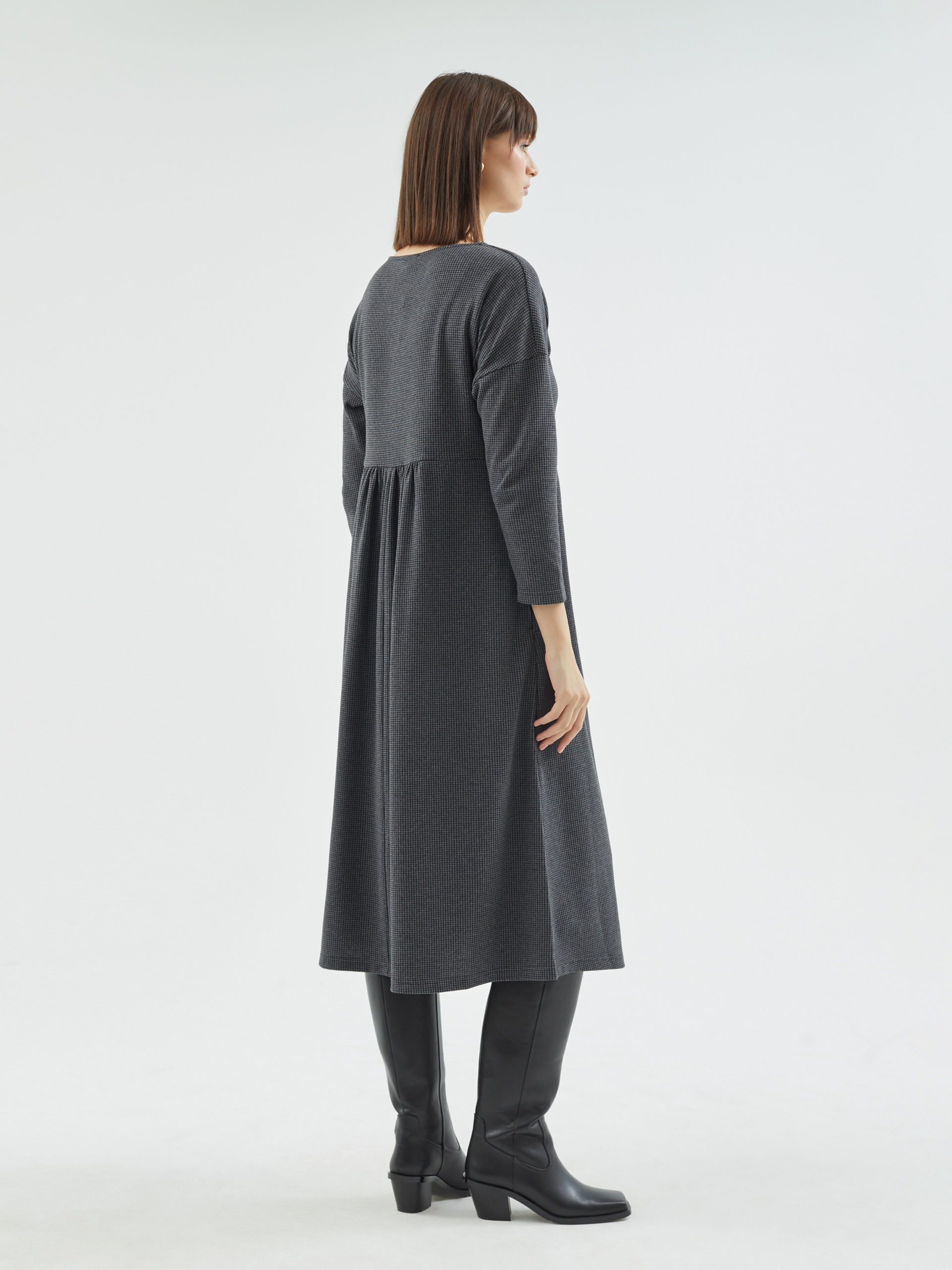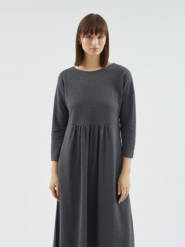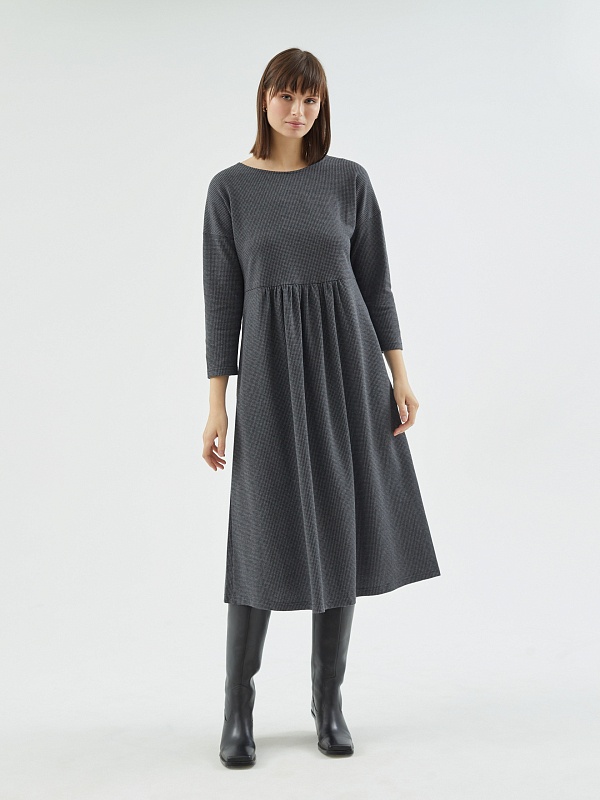 Трикотажное платье свободного силуэта, отрезное по талии, со сборкой, со спущенным рукавом полной длины.