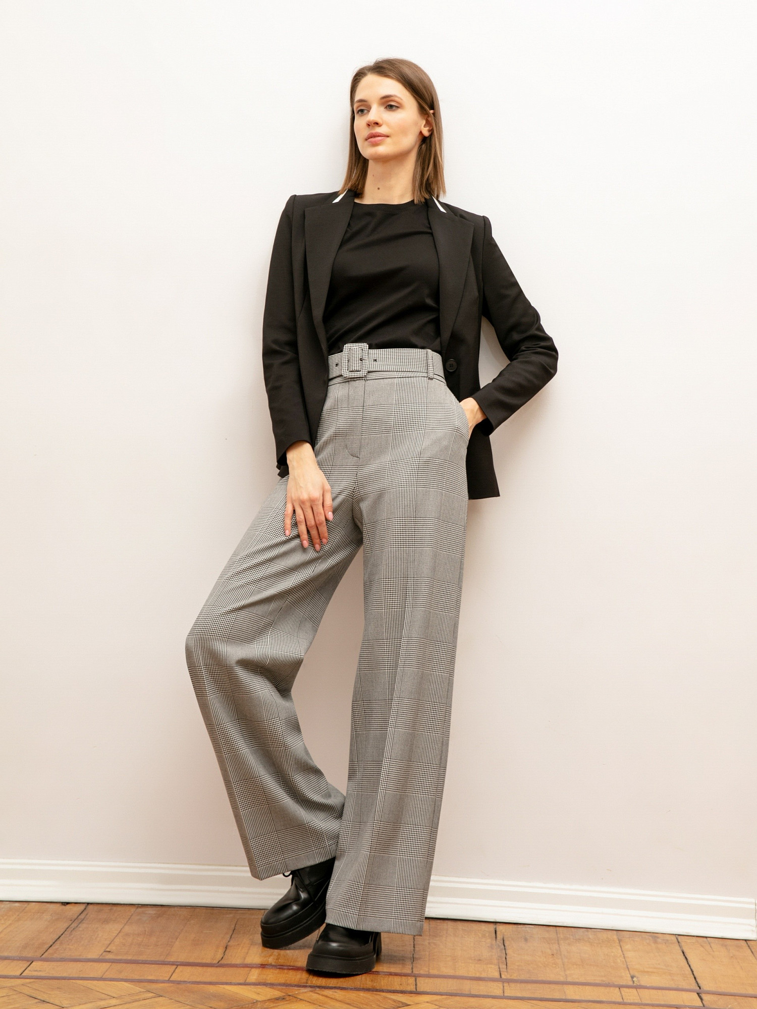 Широкие брюки на высокой талии с обтяжным ремнем из основной ткани. Шлевки, боковые карманы, сзади прорезной карман.