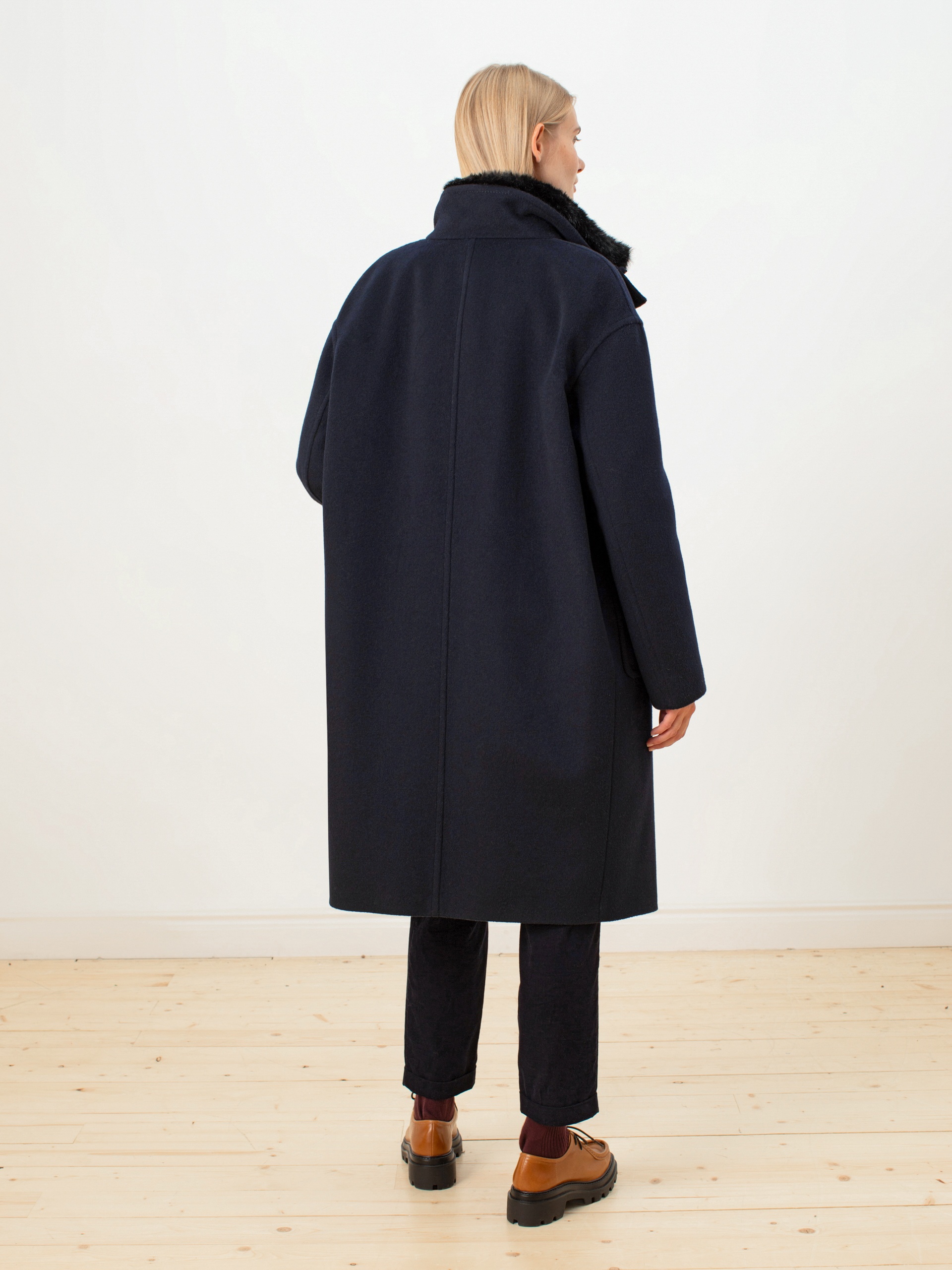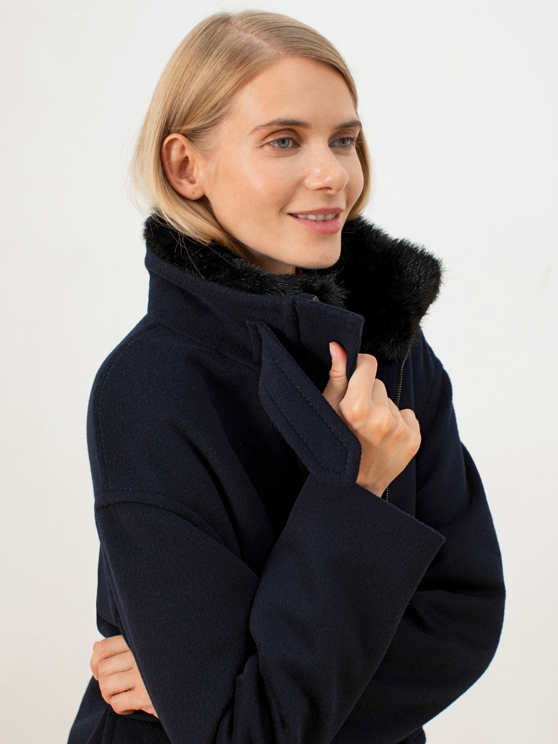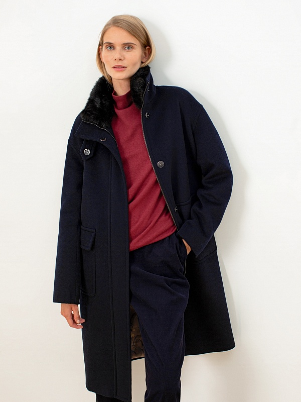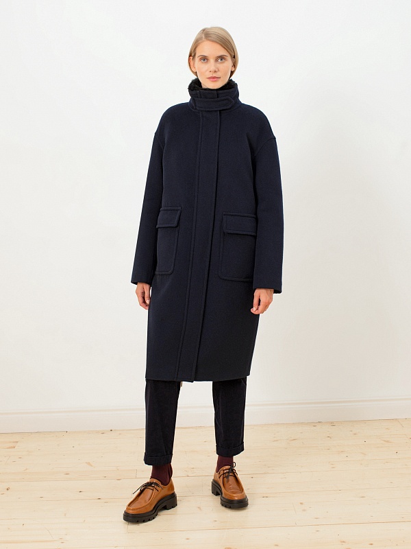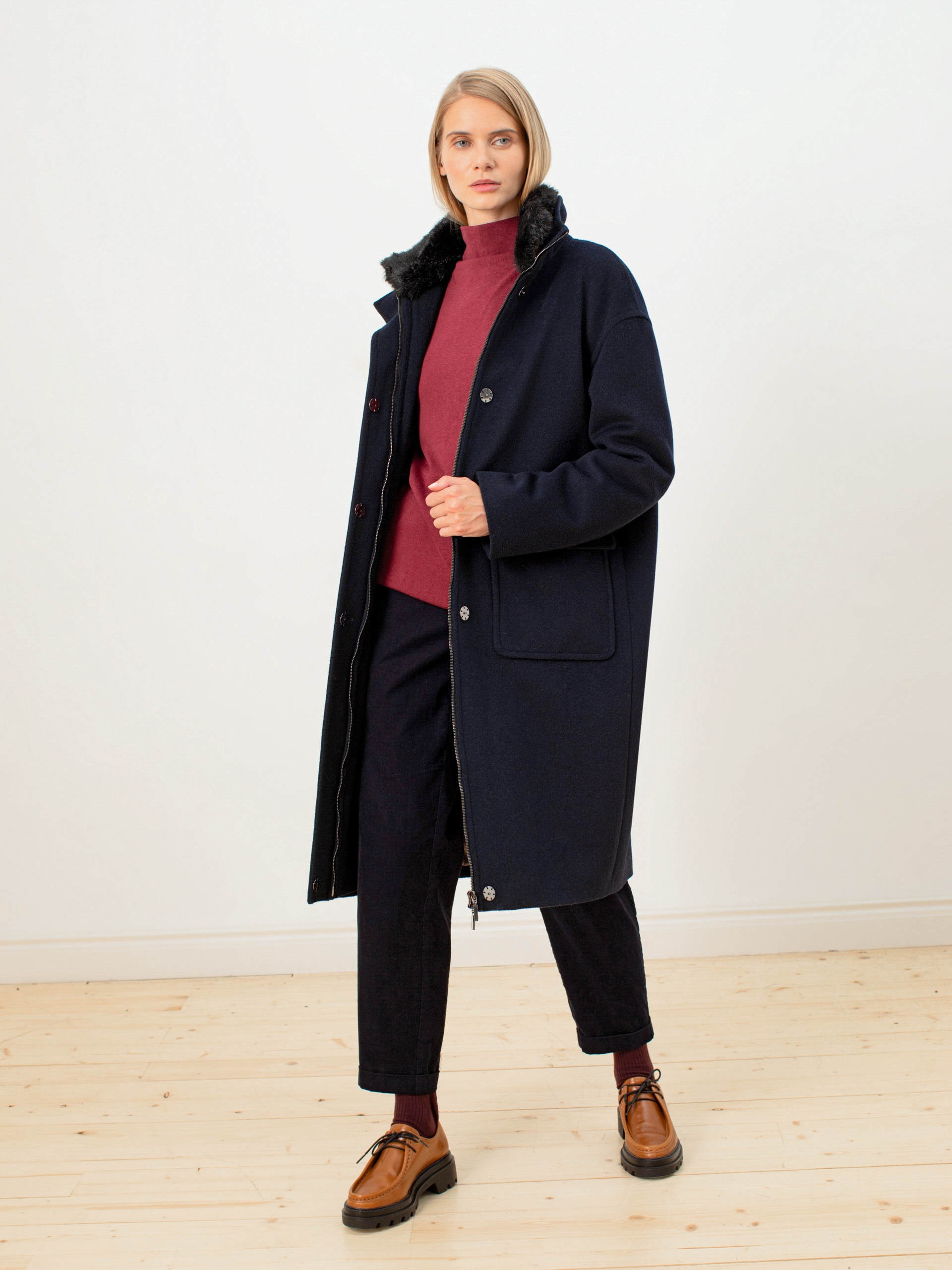 Пальто прямого силуэта из шерстяной ворсовой ткани цвета "нэви". Втачной рукав со спущенным плечом, воротник-стойка с отстёгивающимся воротником из искусственной норки, центральная застёжка на молнию. Длина до колена. Декорировано широкой отделочной строчкой. Произведено с мембраной Raft Pro. Утеплитель DuPont Sorona.