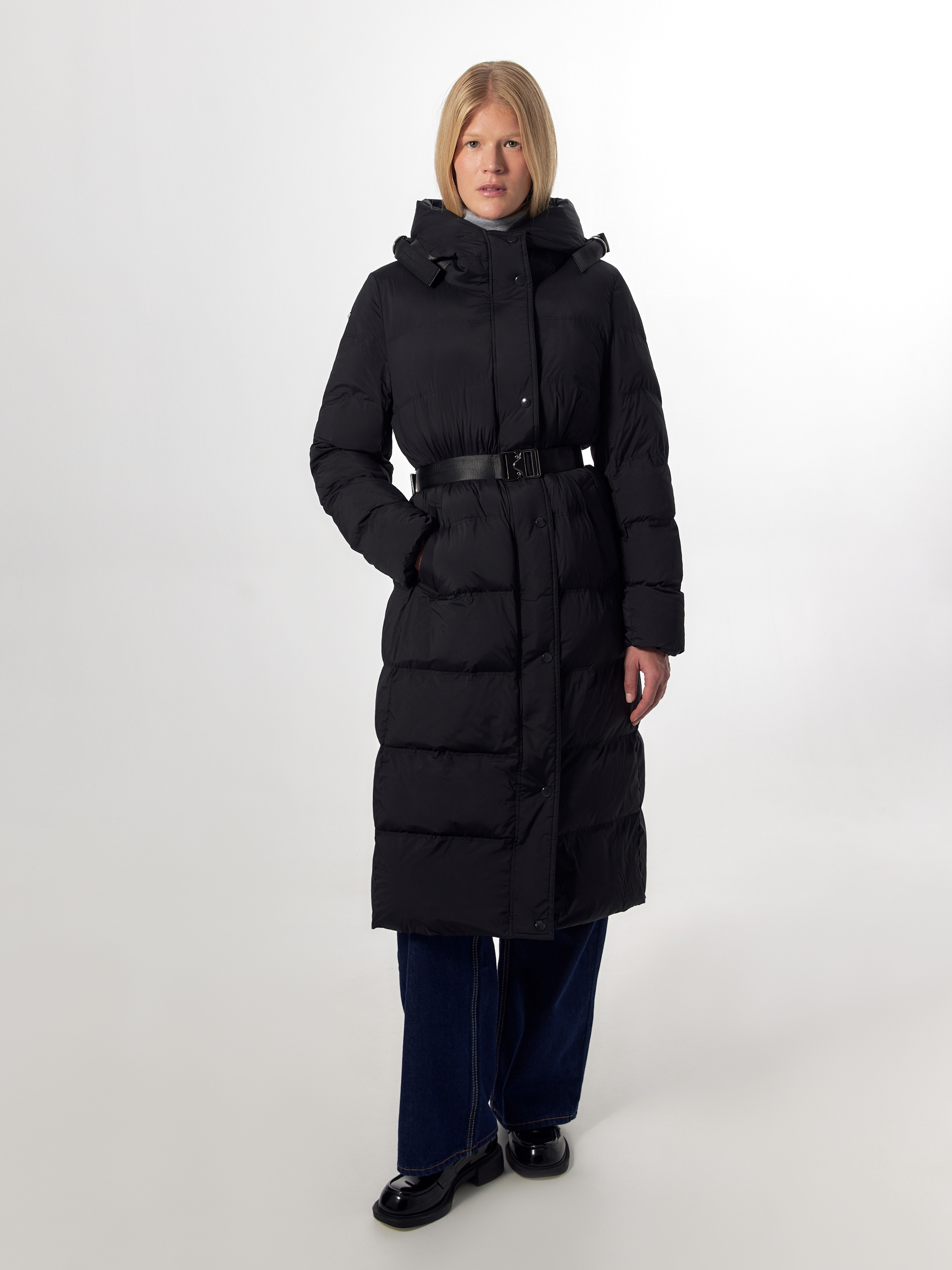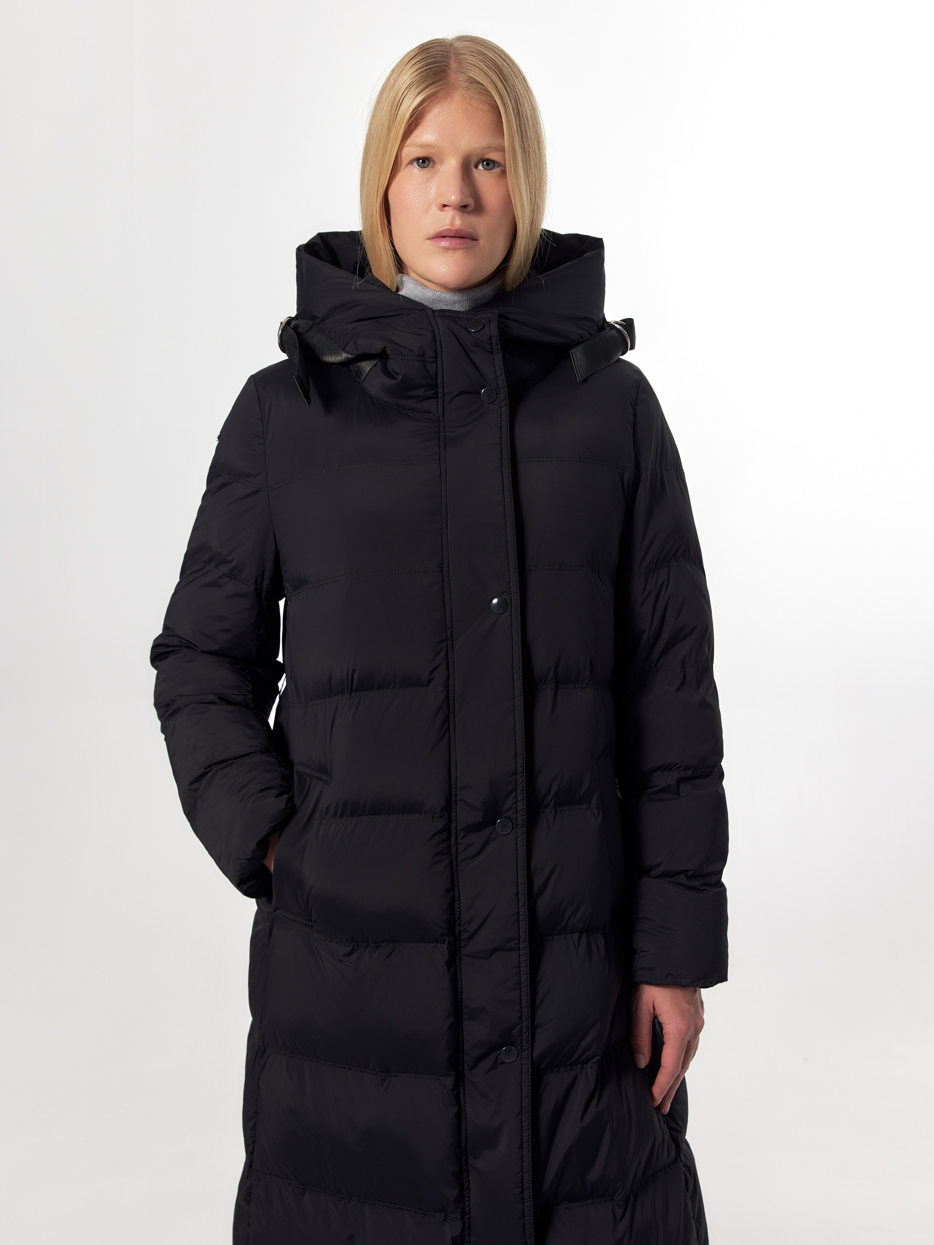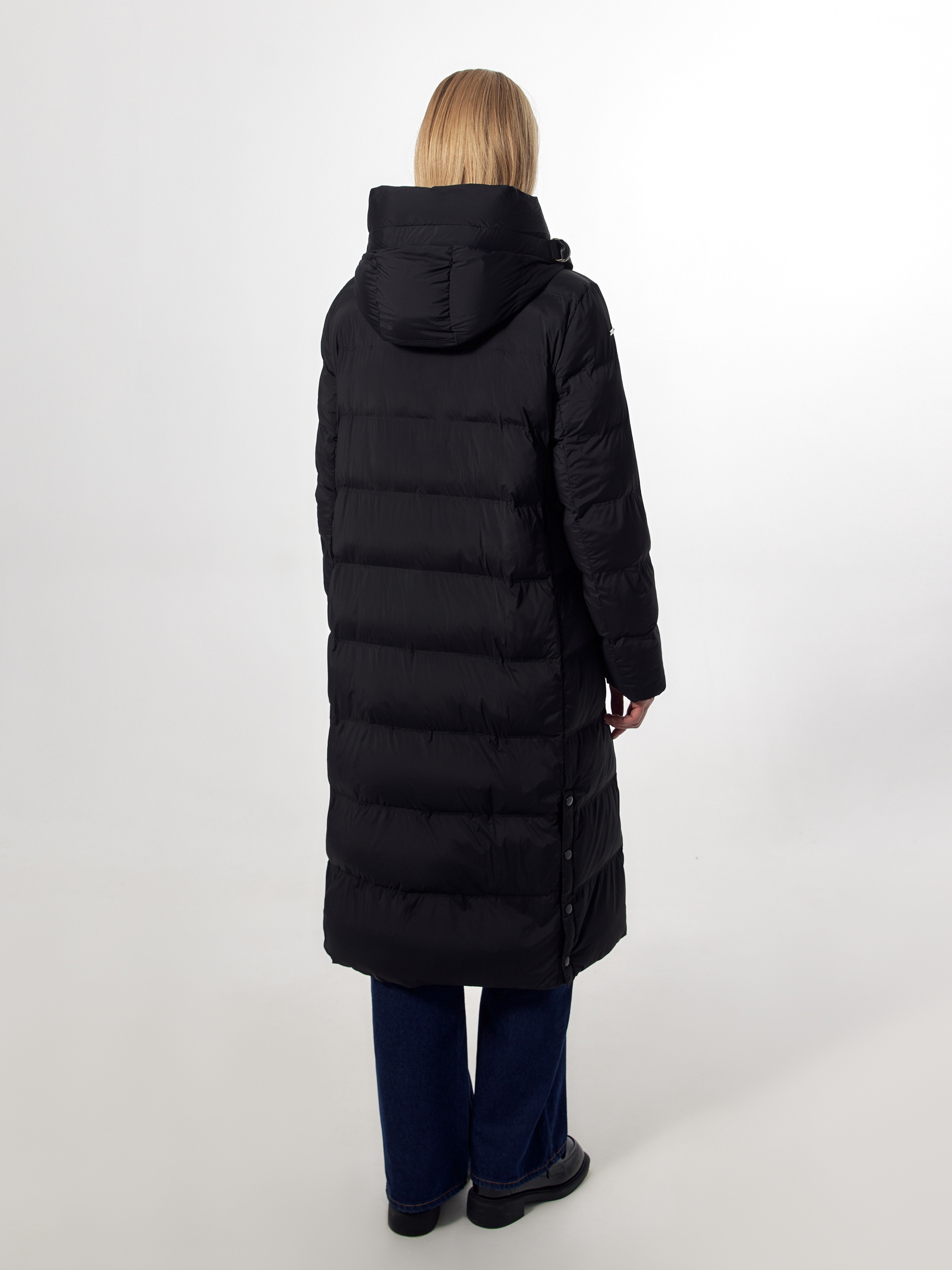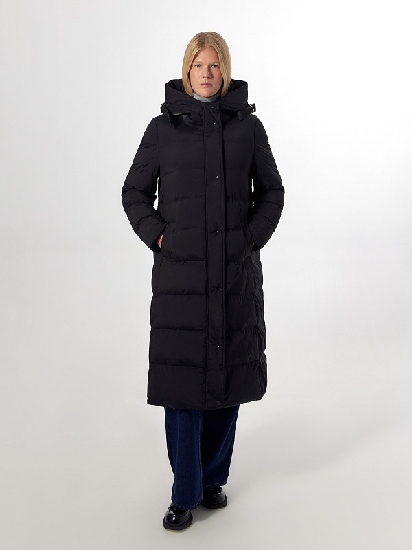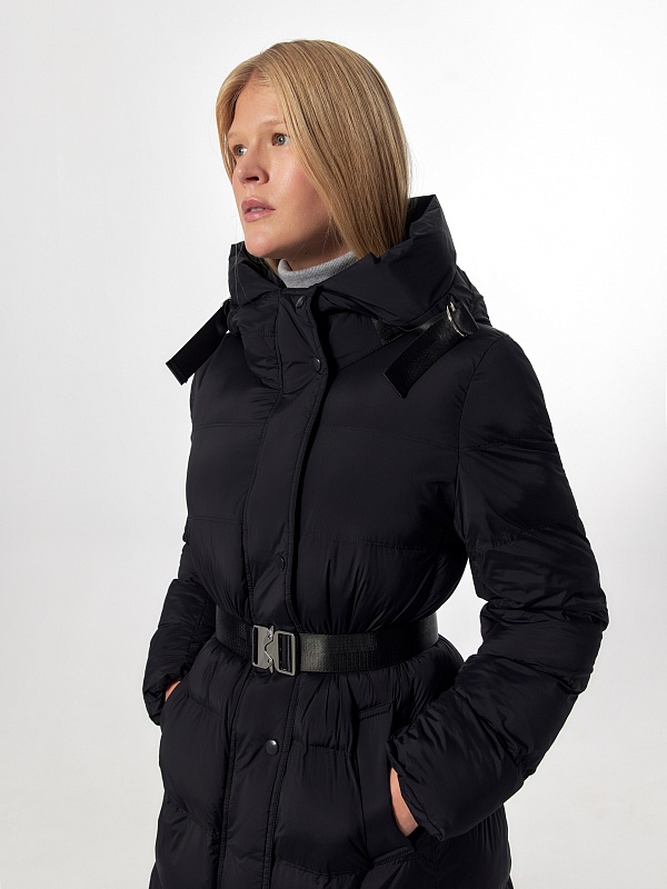 Пальто-пуховик силуэта "умеренная трапеция" из плащевой ткани черного цвета. Крупные горизонтальные отстрочки. Втачной рукав, воротник-стойка и капюшон, карманы-листочки, центральная застёжка на молнию и пришивные кнопки. Пояс с металлической пряжкой. Боковые разрезы с металлическими кнопками. Утеплитель DuPont Sorona. Длина ниже колена.