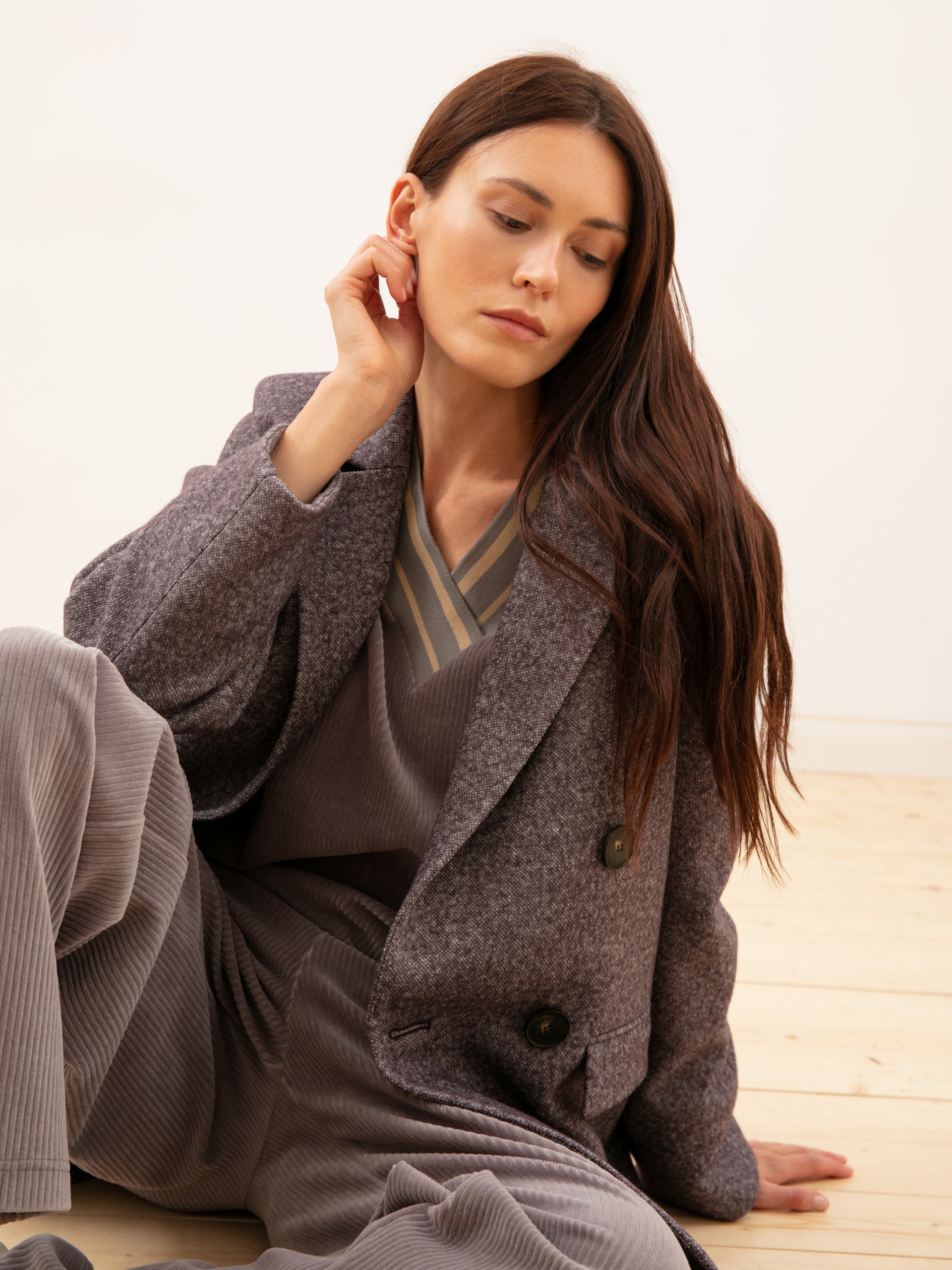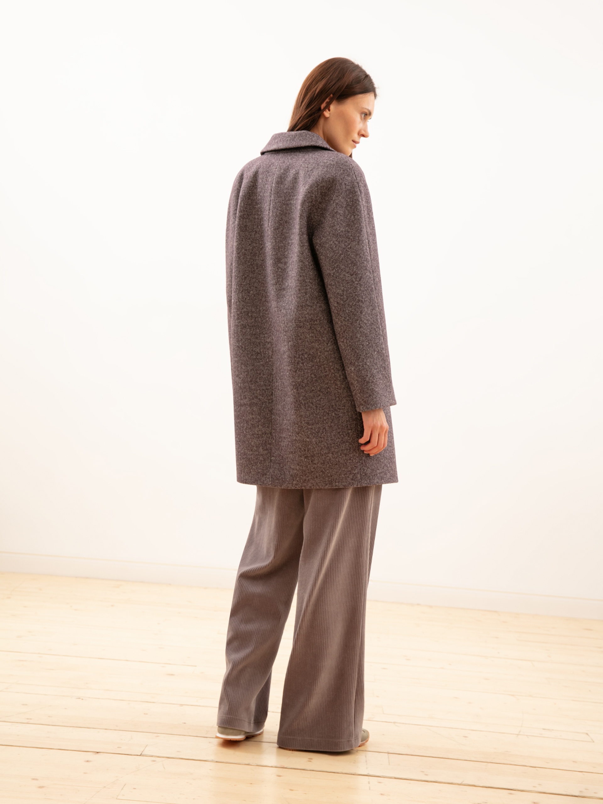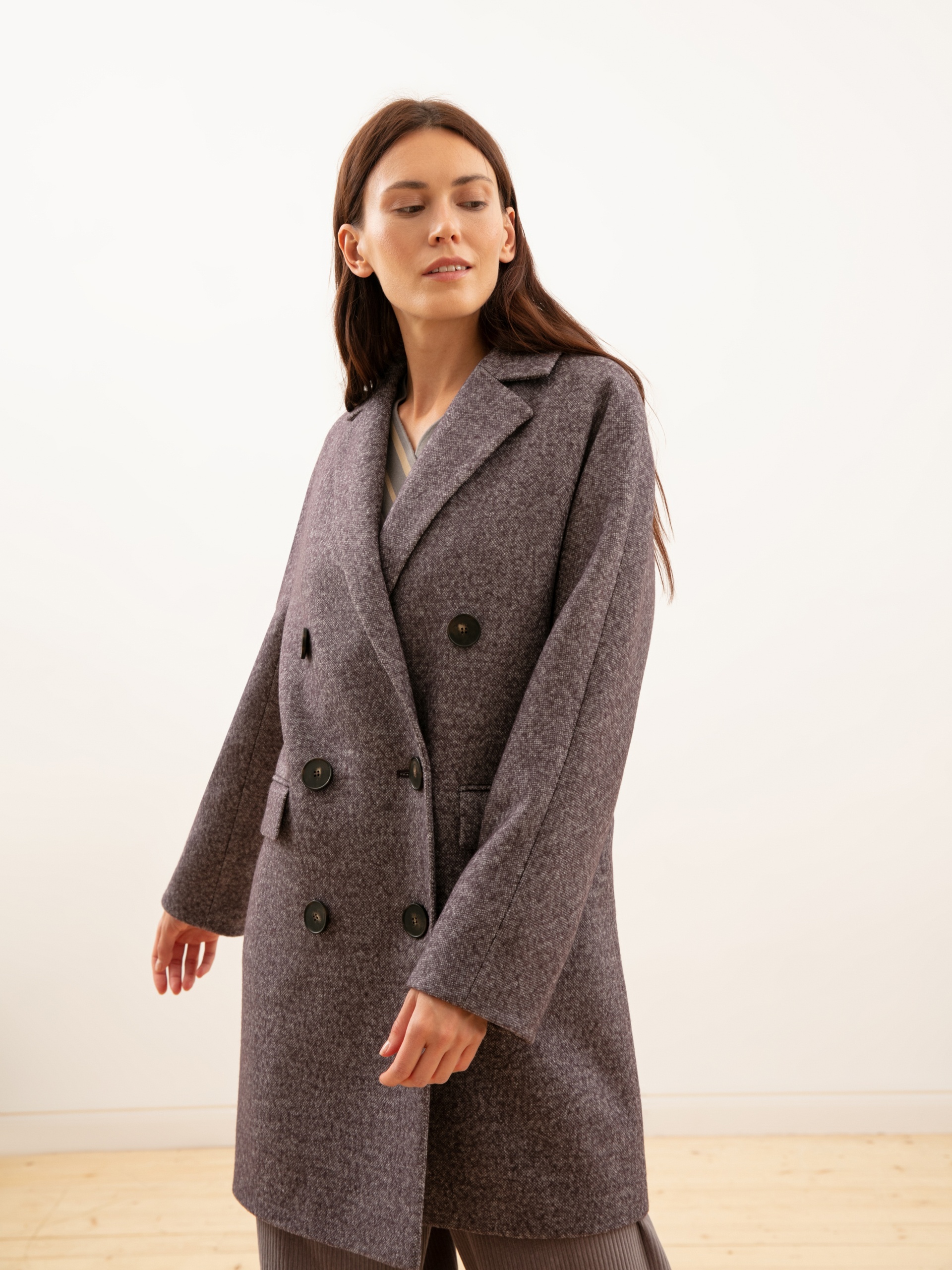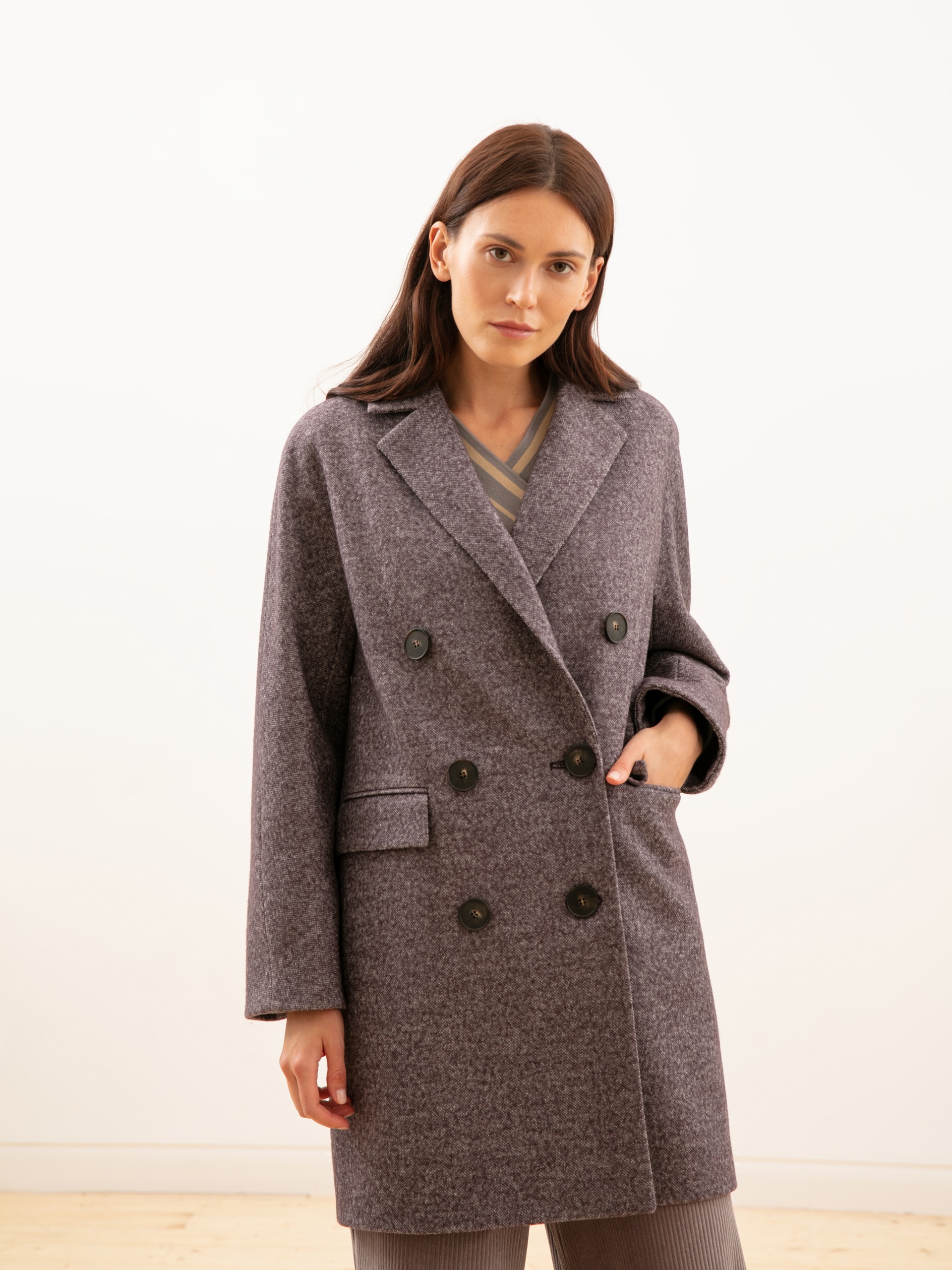 Укороченное двубортное пальто из шерстяного твида серо-коричневого оттенка. Выполнено с технологией Raft Pro. Отличный выбор на каждый день.