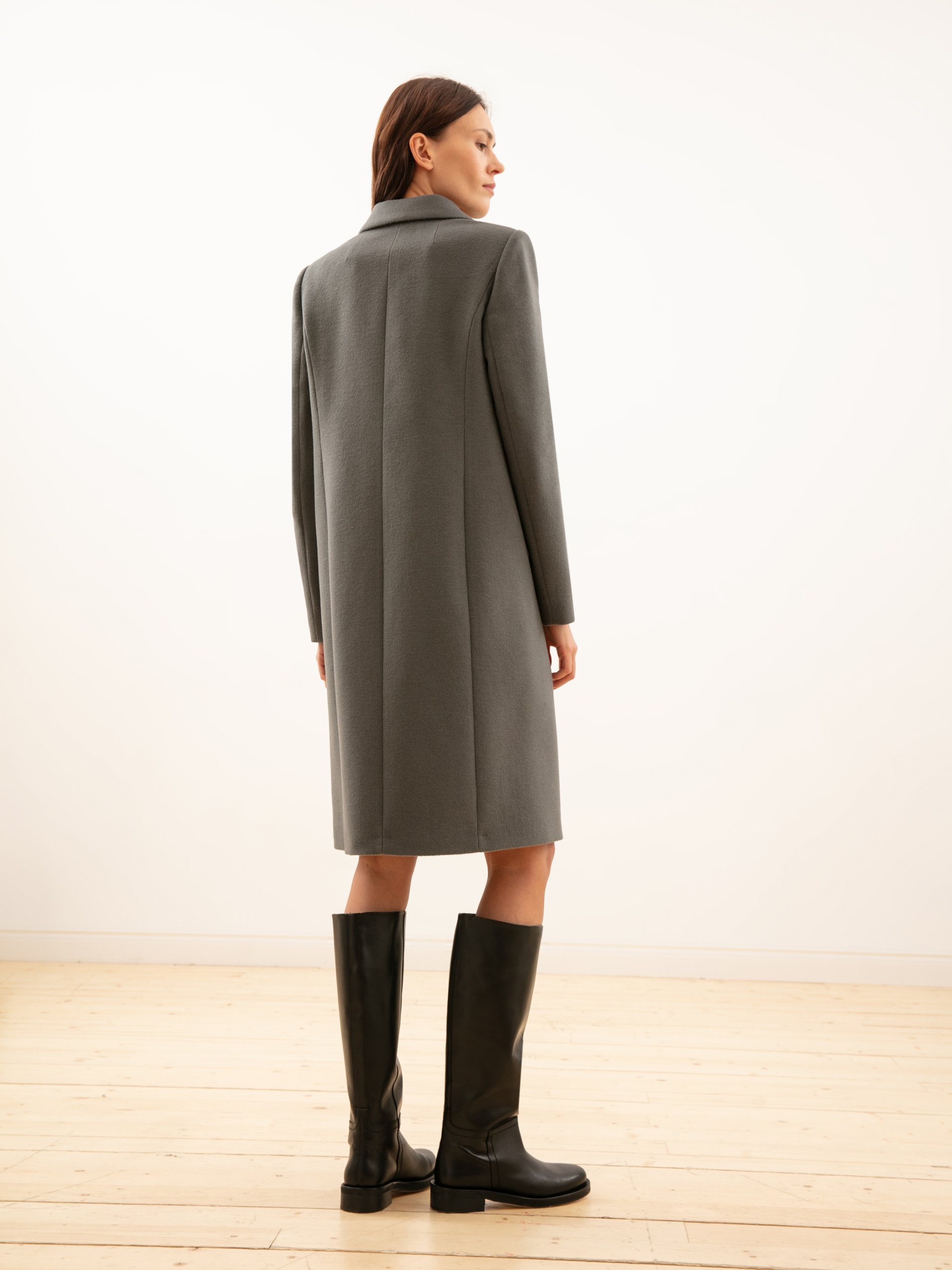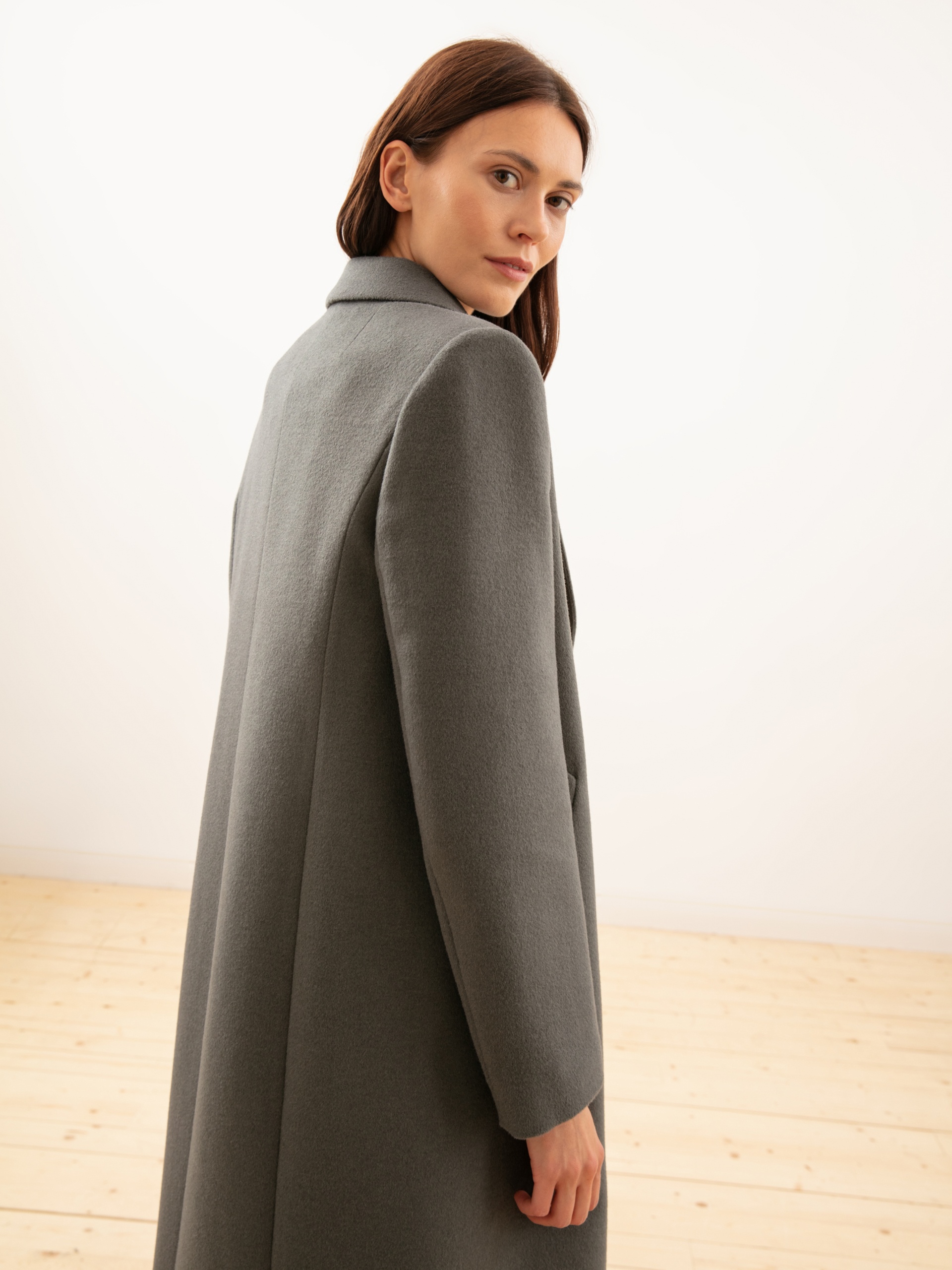 Двубортное пальто из ворсовой шерстяной ткани оливкового оттенка. Выполнено с технологией Raft Pro.