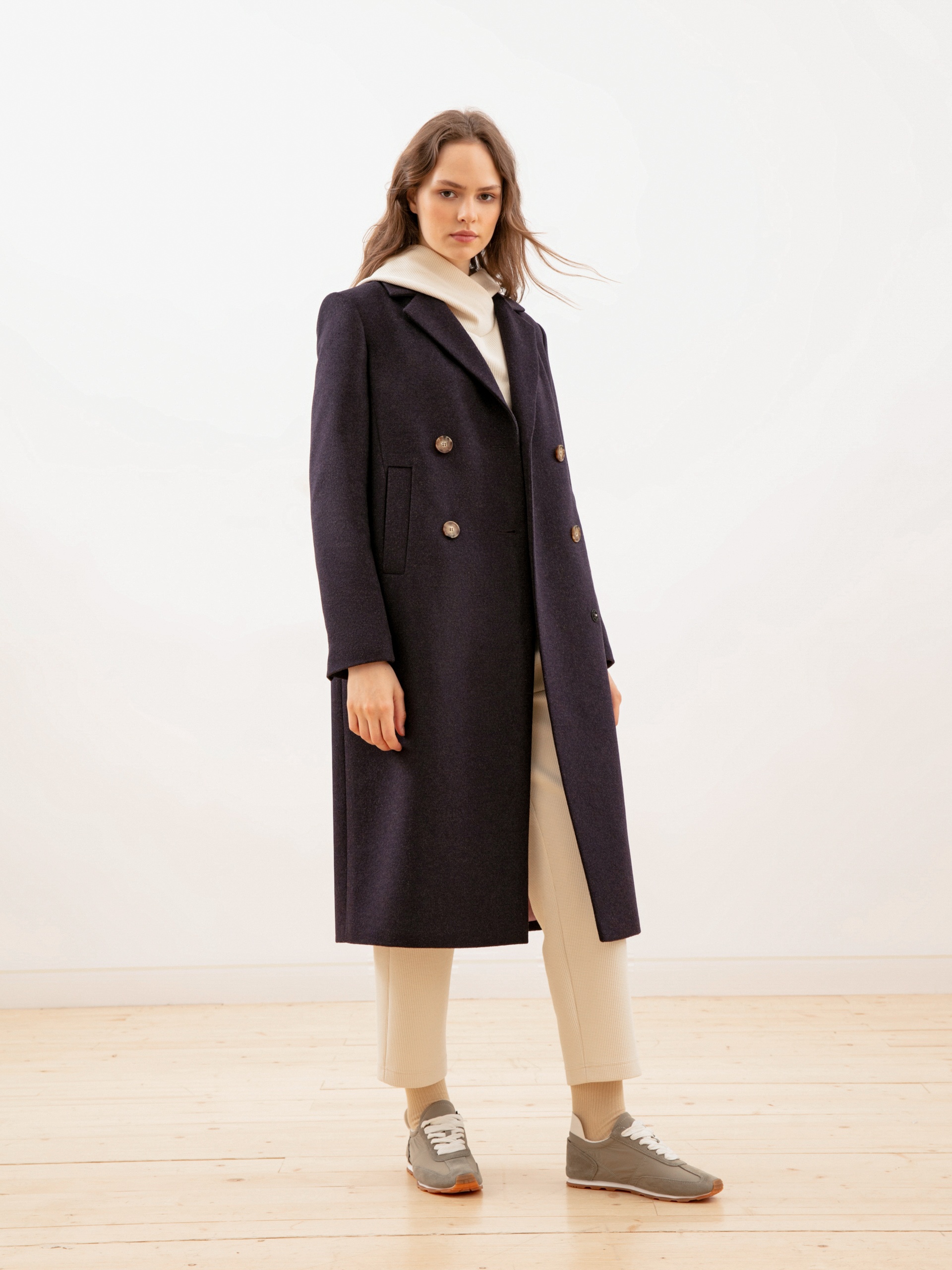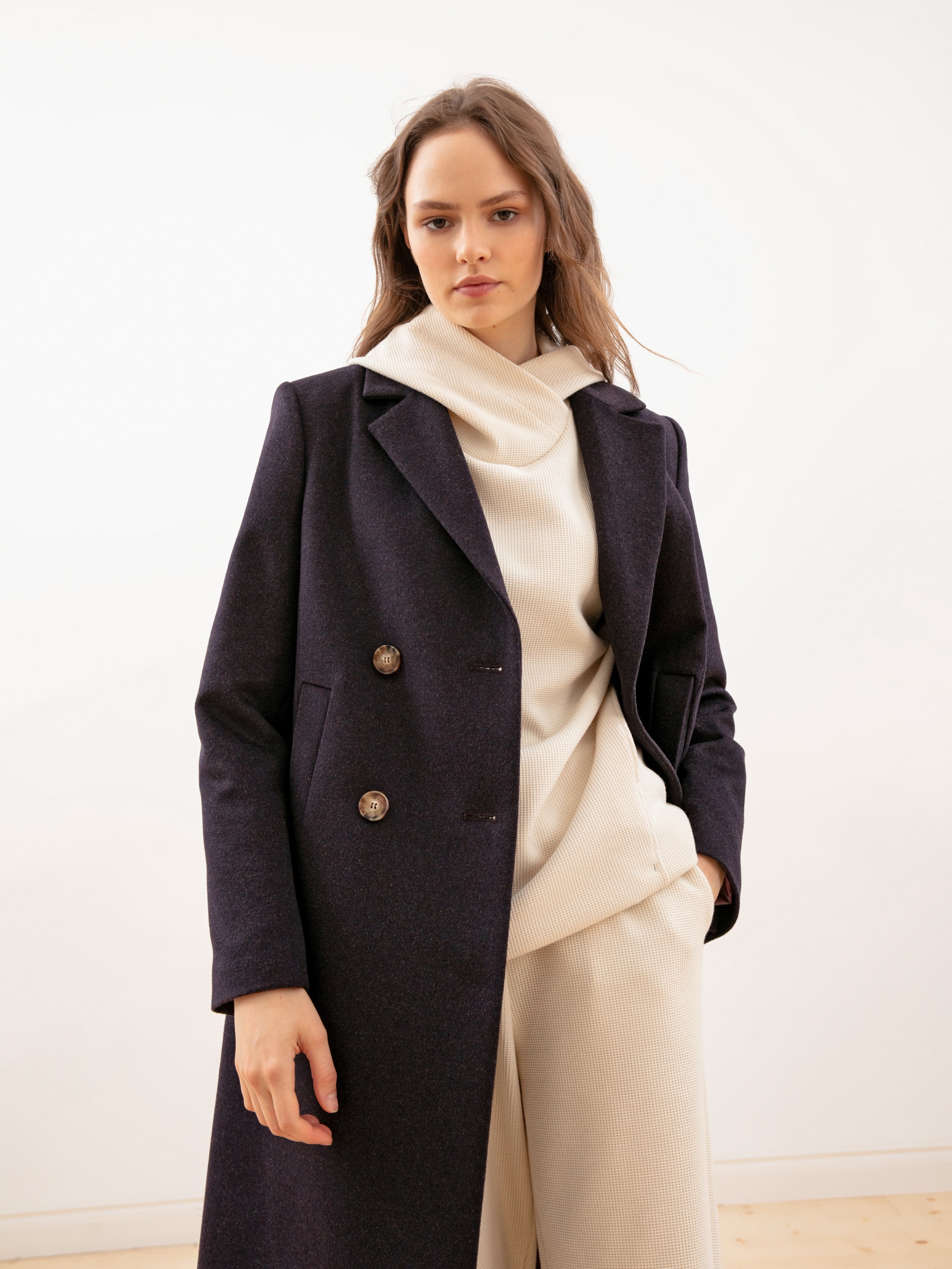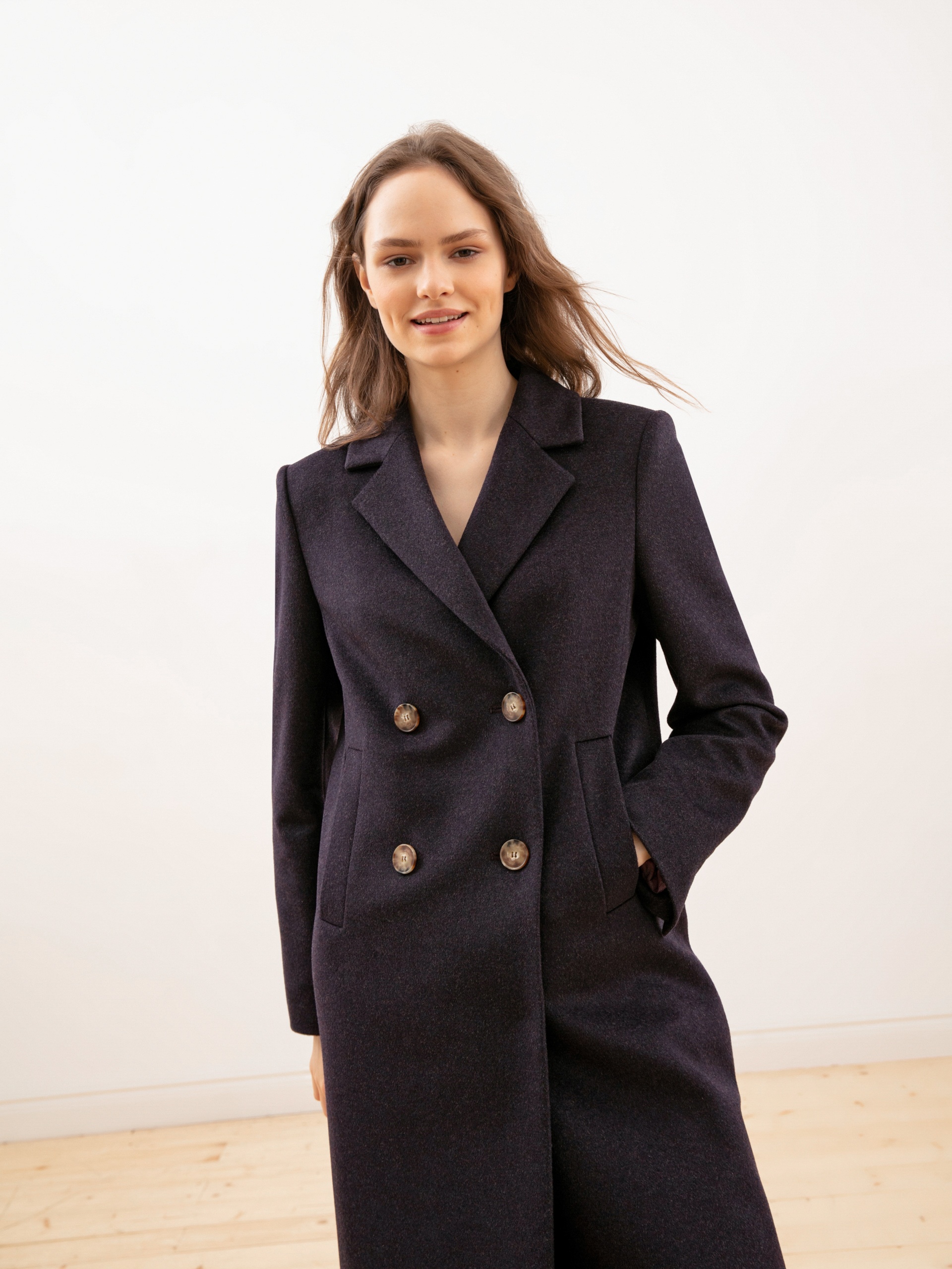 Двубортное пальто из ворсовой шерстяной ткани в оттенке «ежевика». Выполнено с технологией Raft Pro.