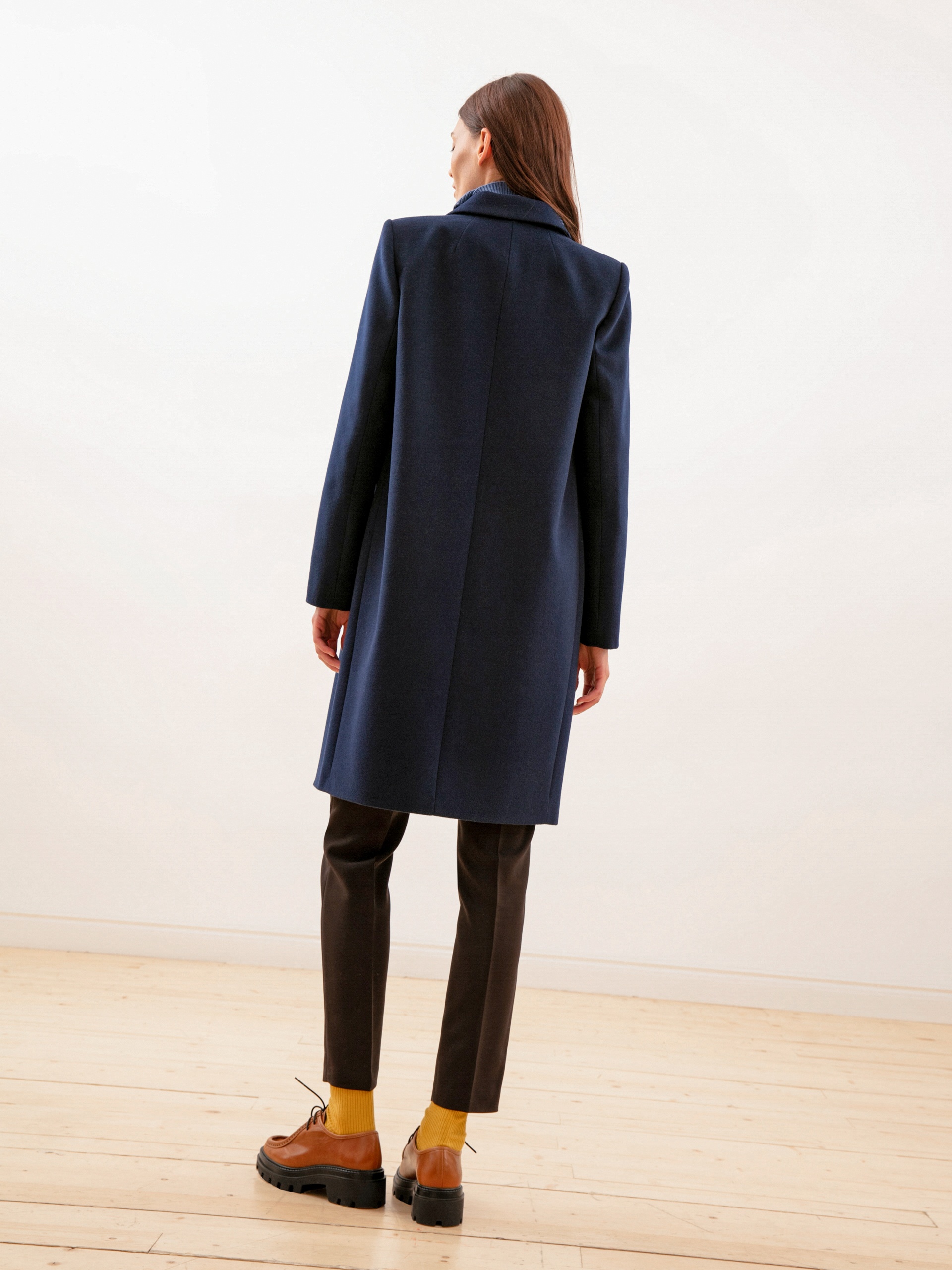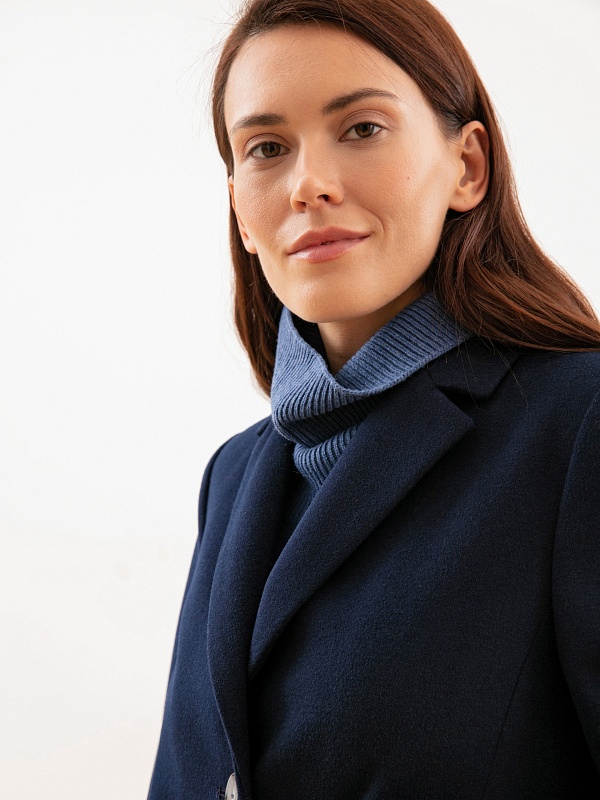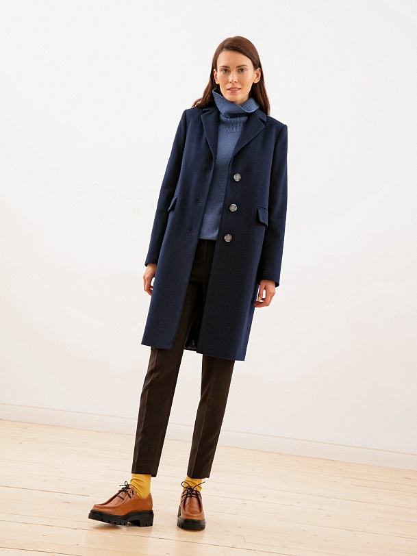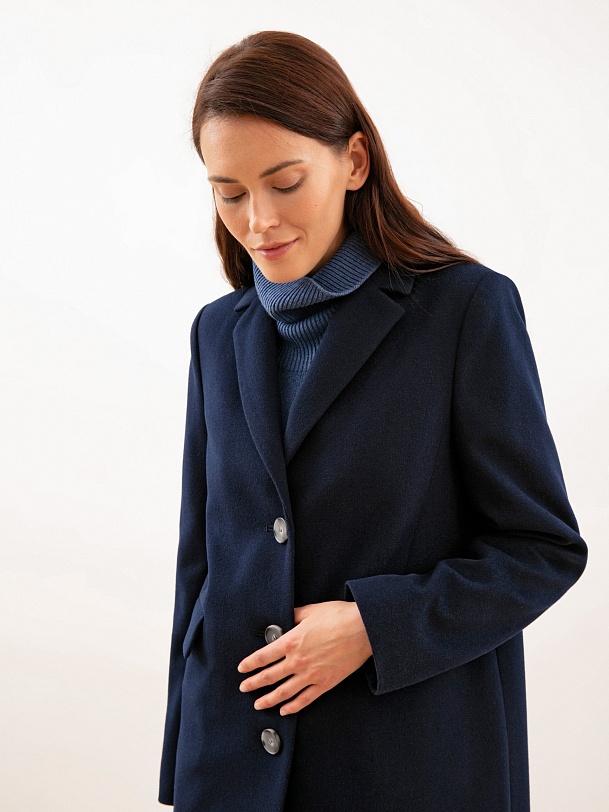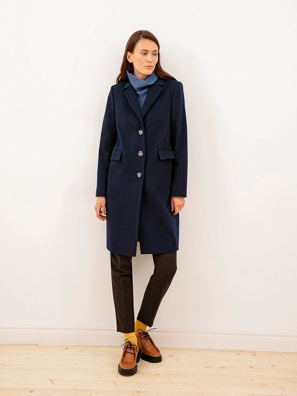 Однобортное пальто из ворсовой шерстяной ткани темно-синего оттенка. Выполнено с технологией Raft Pro. Любимая классика на каждый день.