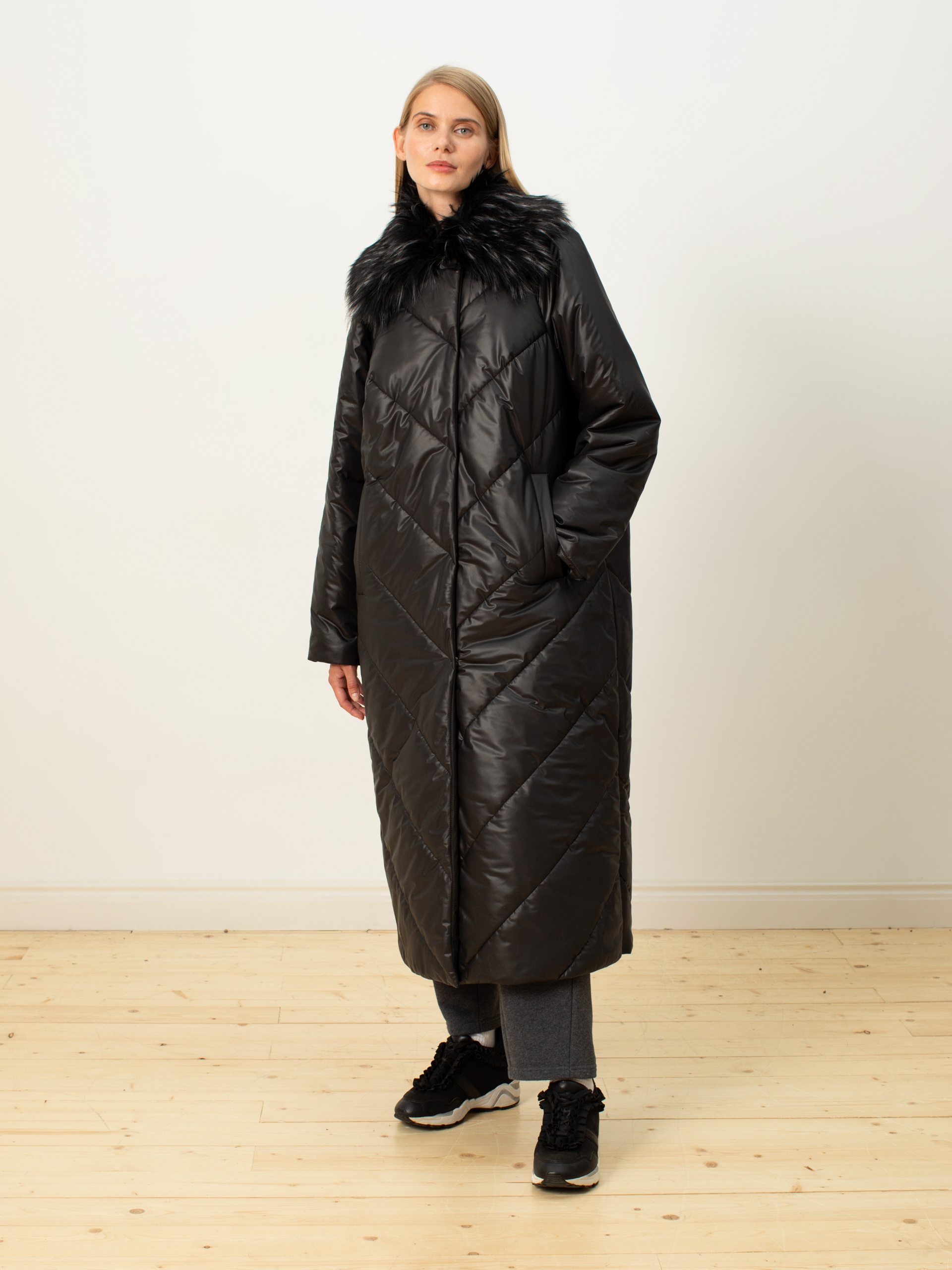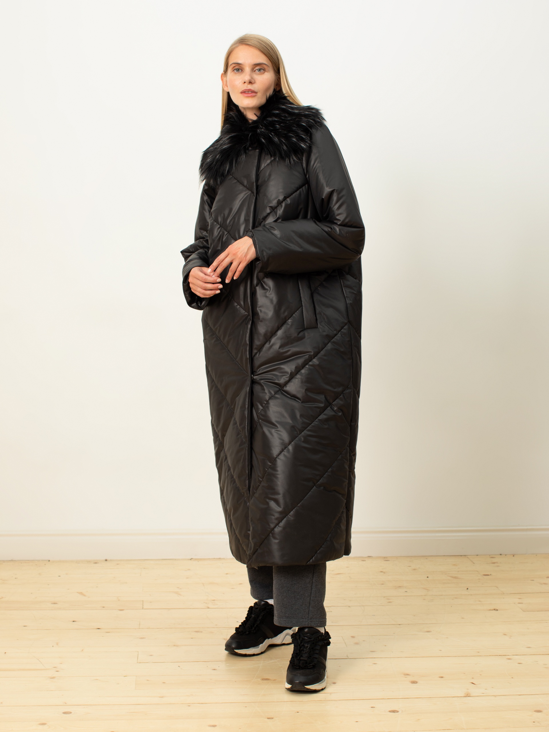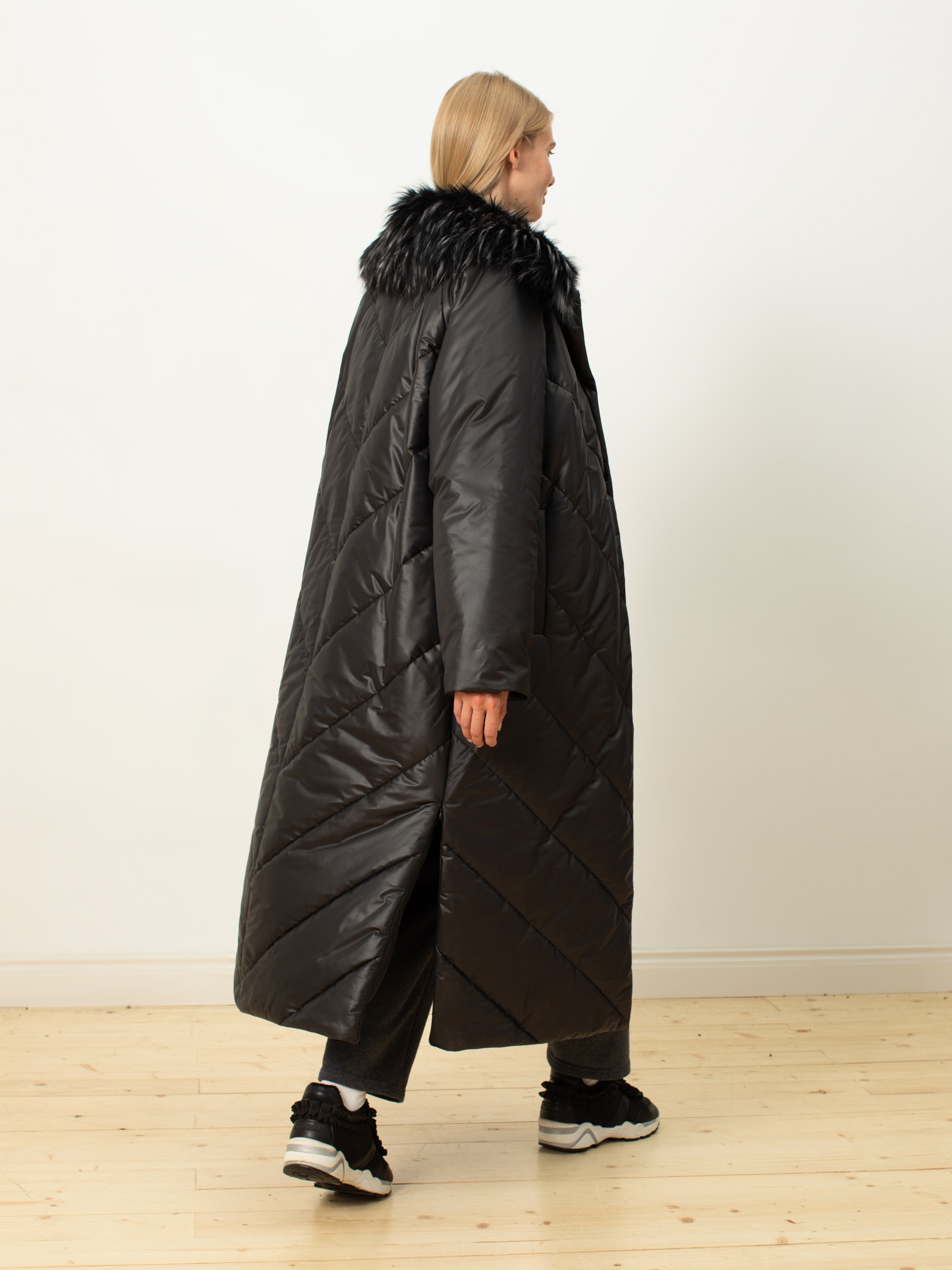 Пальто-пуховик силуэта "удлиненный кокон" из плащевой ткани чёрного цвета с отстёгивающимся воротником из искусственного меха (имитация меха енота). Крупные отстрочки. Рукав-реглан, отложной воротник, карманы-листочки, центральная застёжка на кнопки. Потайные молнии внизу по боковым швам. Произведено с мембраной Raft Pro. Утеплитель DuPont Sorona. Длина ниже колена.