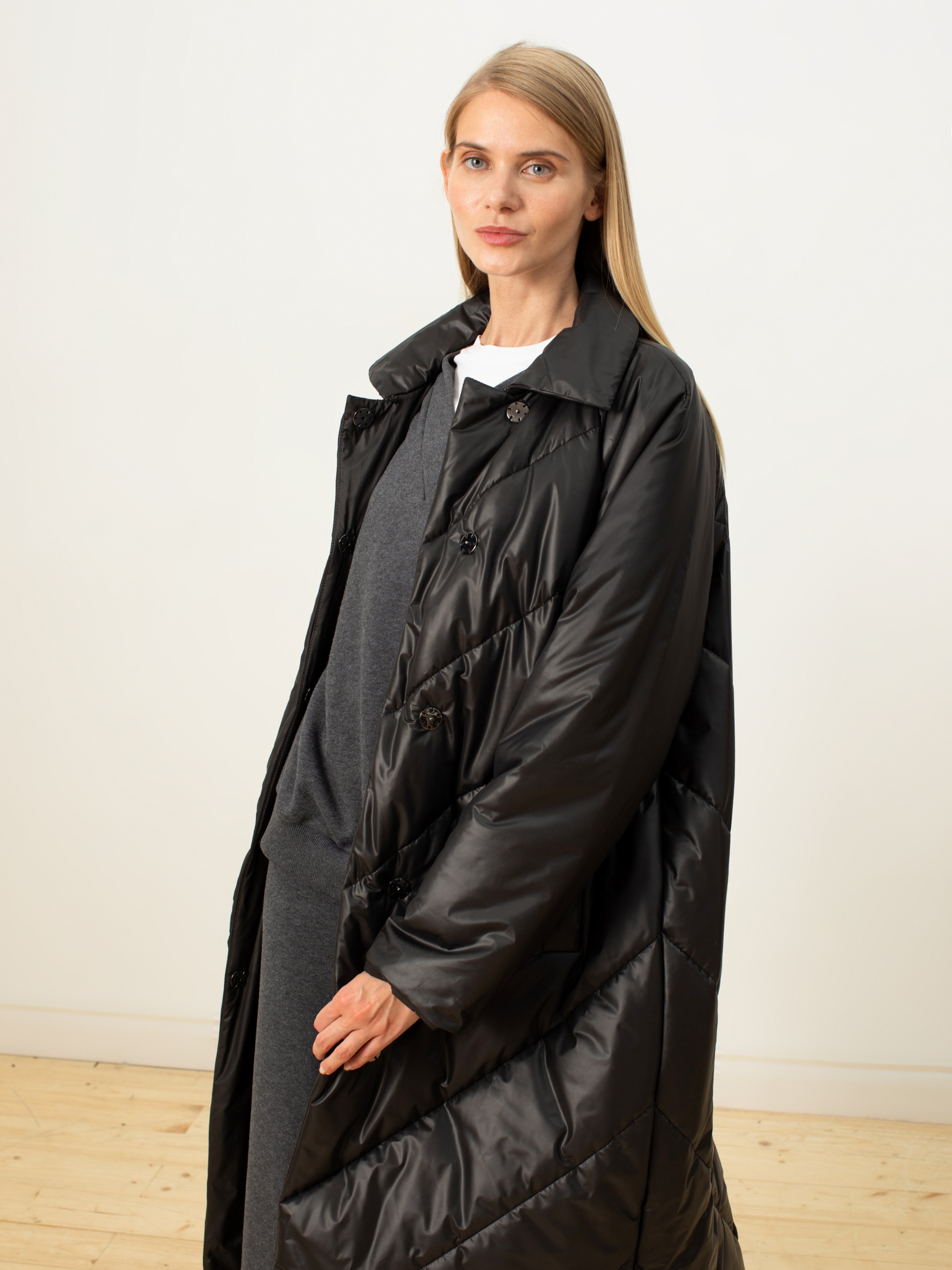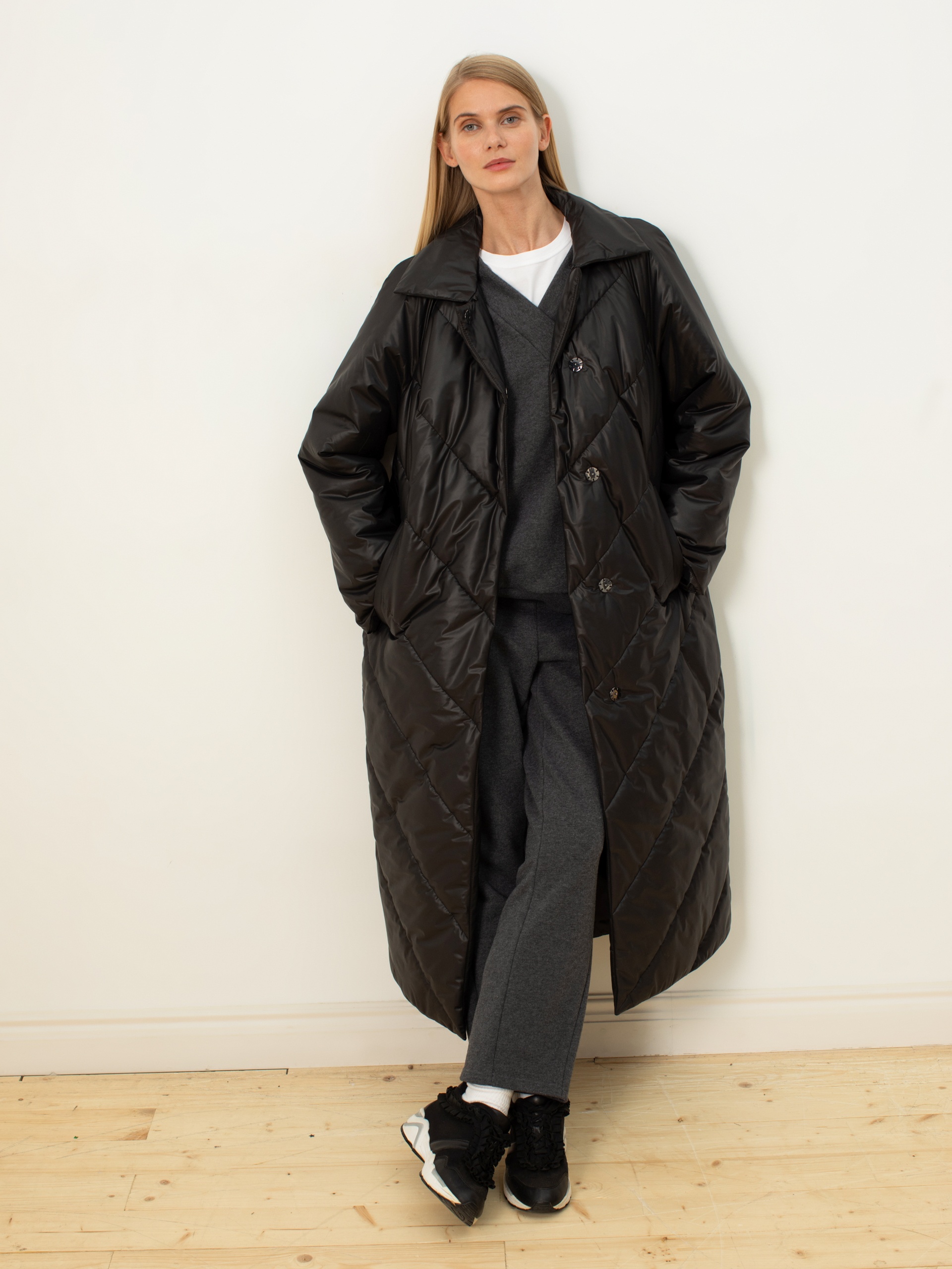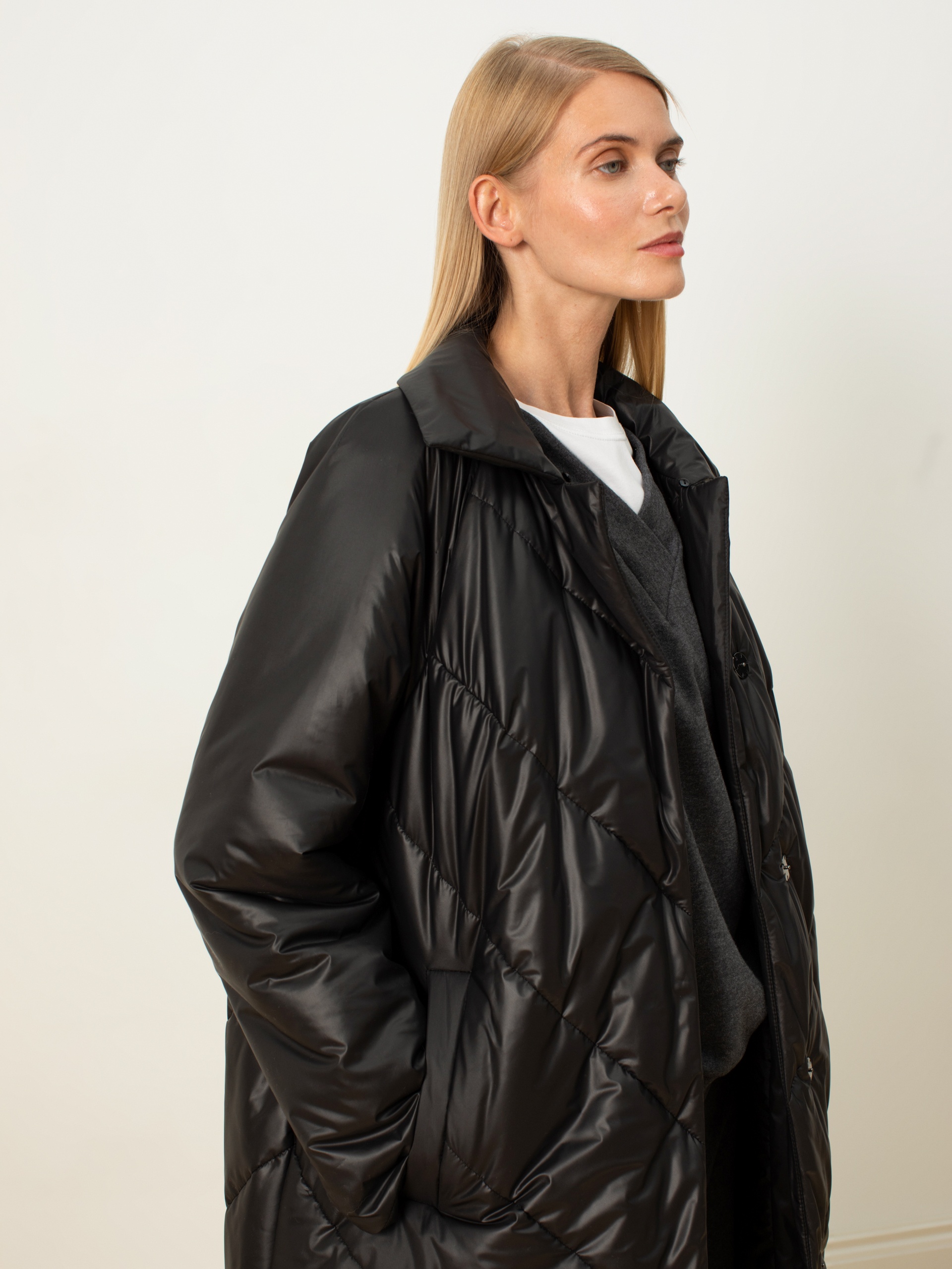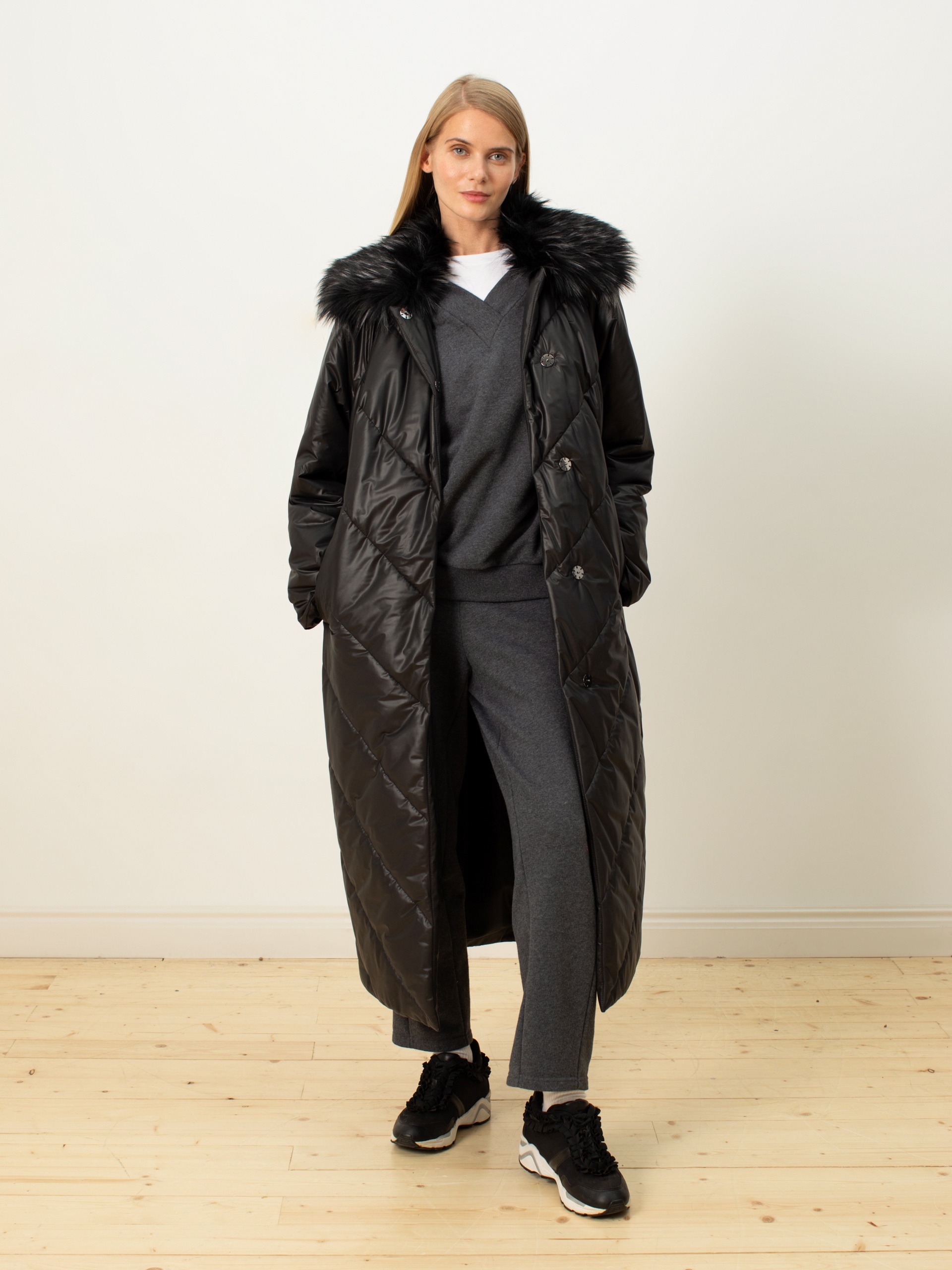 Пальто-пуховик силуэта "удлиненный кокон" из плащевой ткани чёрного цвета с отстёгивающимся воротником из искусственного меха (имитация меха енота). Крупные отстрочки. Рукав-реглан, отложной воротник, карманы-листочки, центральная застёжка на кнопки. Потайные молнии внизу по боковым швам. Произведено с мембраной Raft Pro. Утеплитель DuPont Sorona. Длина ниже колена.