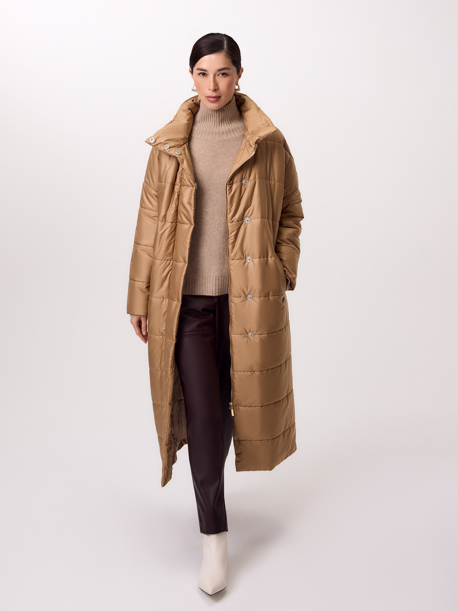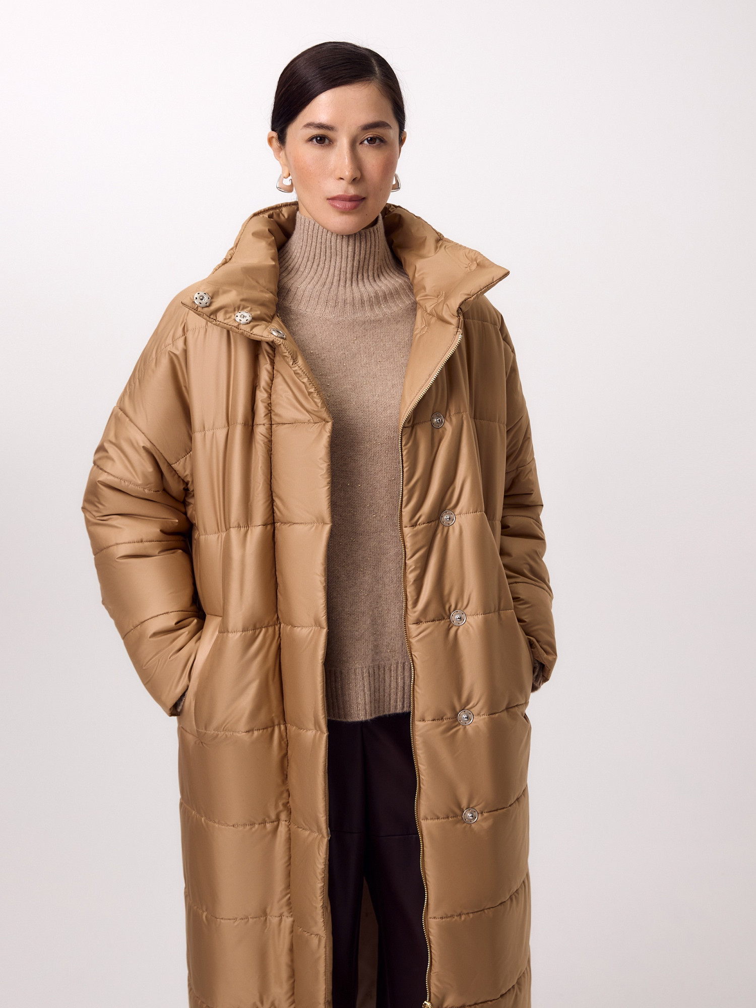 Пальто-пуховик прямого силуэта из плащевой ткани оттенка "кэмел". Крупные горизонтальные отстрочки. Рубашечный рукав, высокий воротник-стойка, карманы-листочки, центральная застёжка на молнию и пришивные кнопки. Произведено с мембраной Raft Pro. Утеплитель DuPont Sorona. Длина ниже колена.