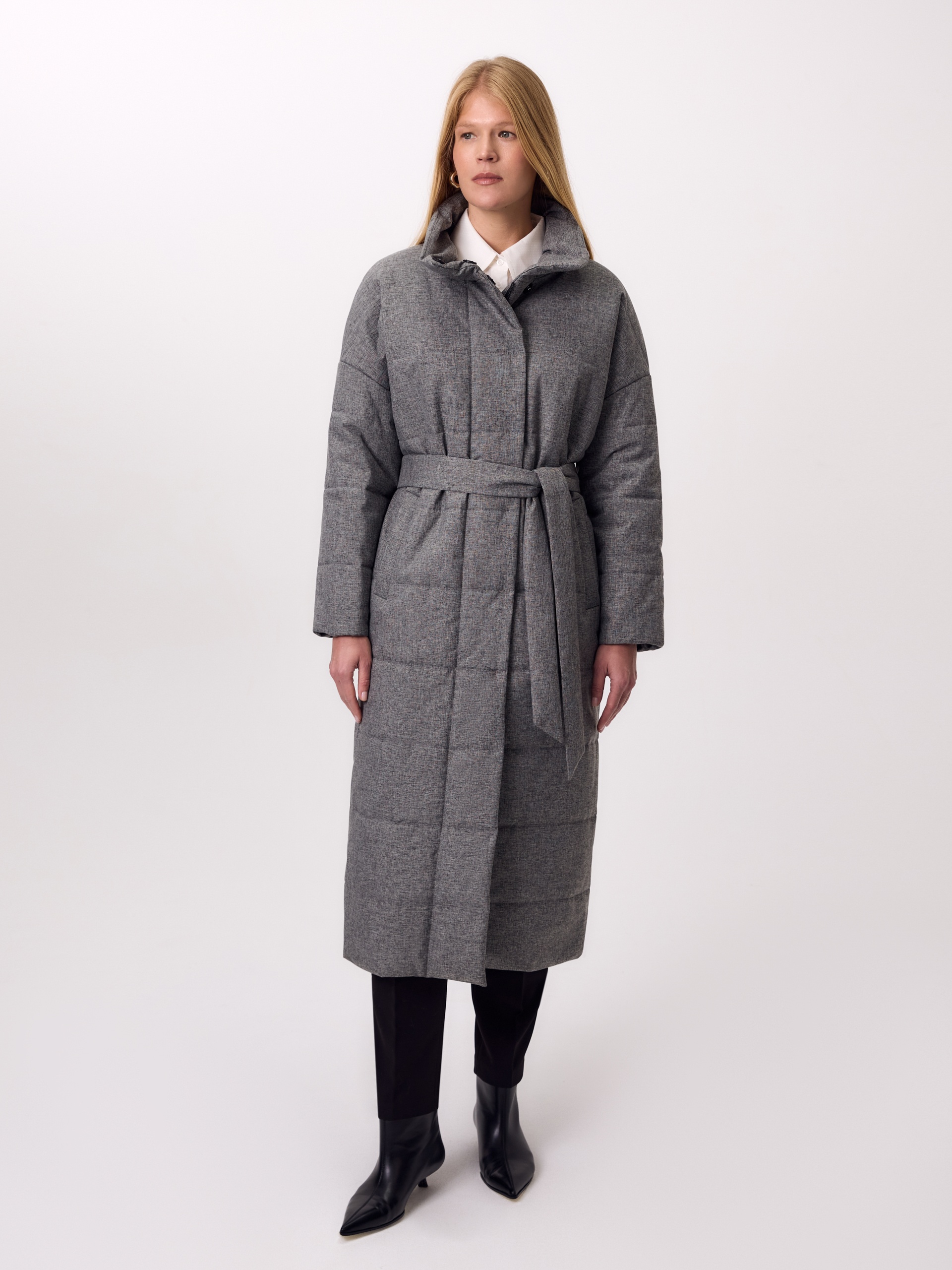 Пальто-пуховик прямого силуэта из плащевой ткани оттенка "черно-белый меланж". Крупные горизонтальные отстрочки. Рубашечный рукав, высокий воротник-стойка, карманы-листочки, центральная застёжка на молнию и пришивные кнопки. Длина ниже колена. В комплект входит пояс.Утеплитель: гипоаллергенный DuPont Sorona, аналогичный по своим теплоизоляционным свойствам гусиному пуху.