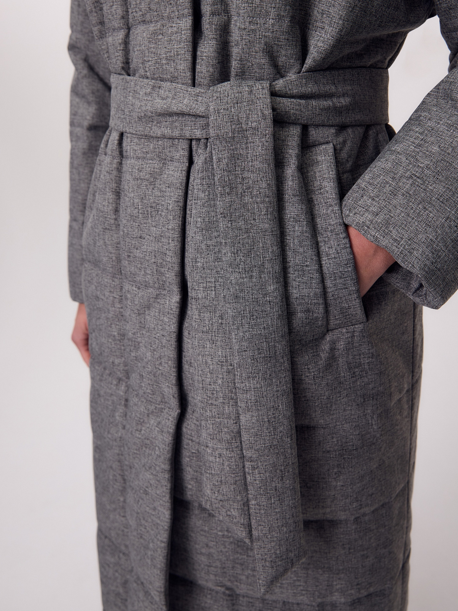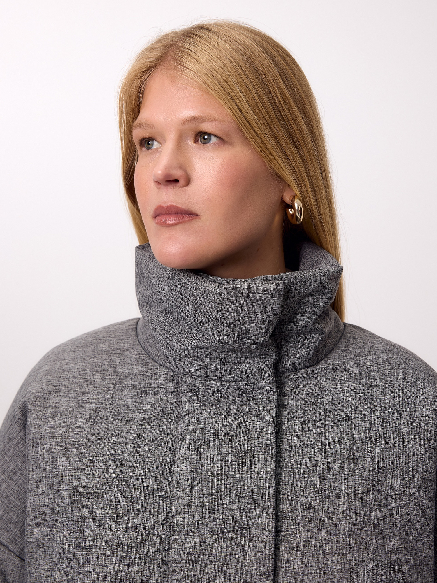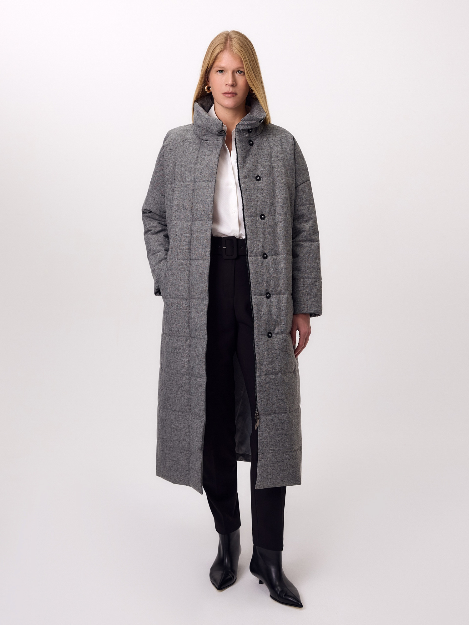 Пальто-пуховик прямого силуэта из плащевой ткани оттенка "черно-белый меланж". Крупные горизонтальные отстрочки. Рубашечный рукав, высокий воротник-стойка, карманы-листочки, центральная застёжка на молнию и пришивные кнопки. Длина ниже колена.