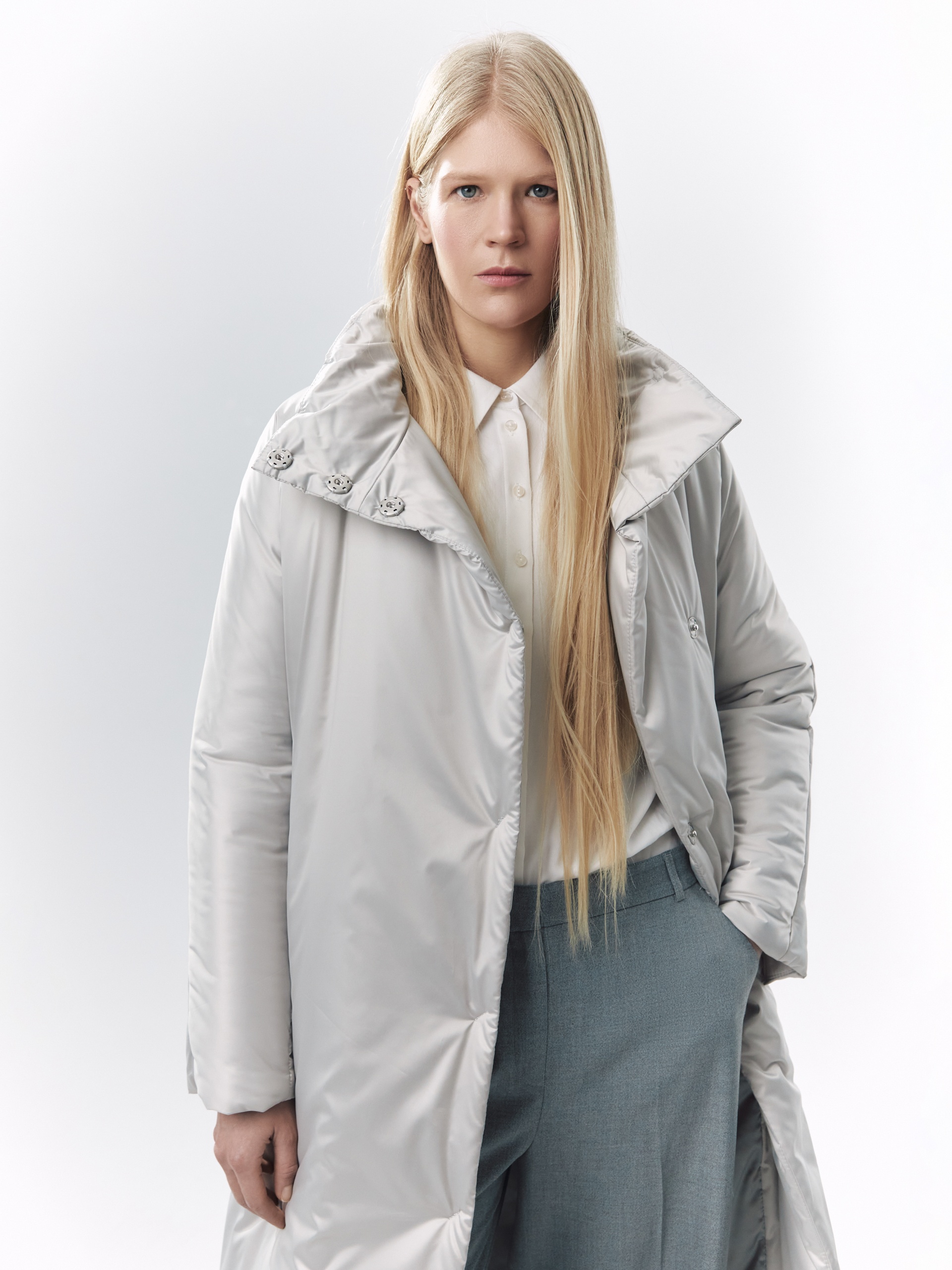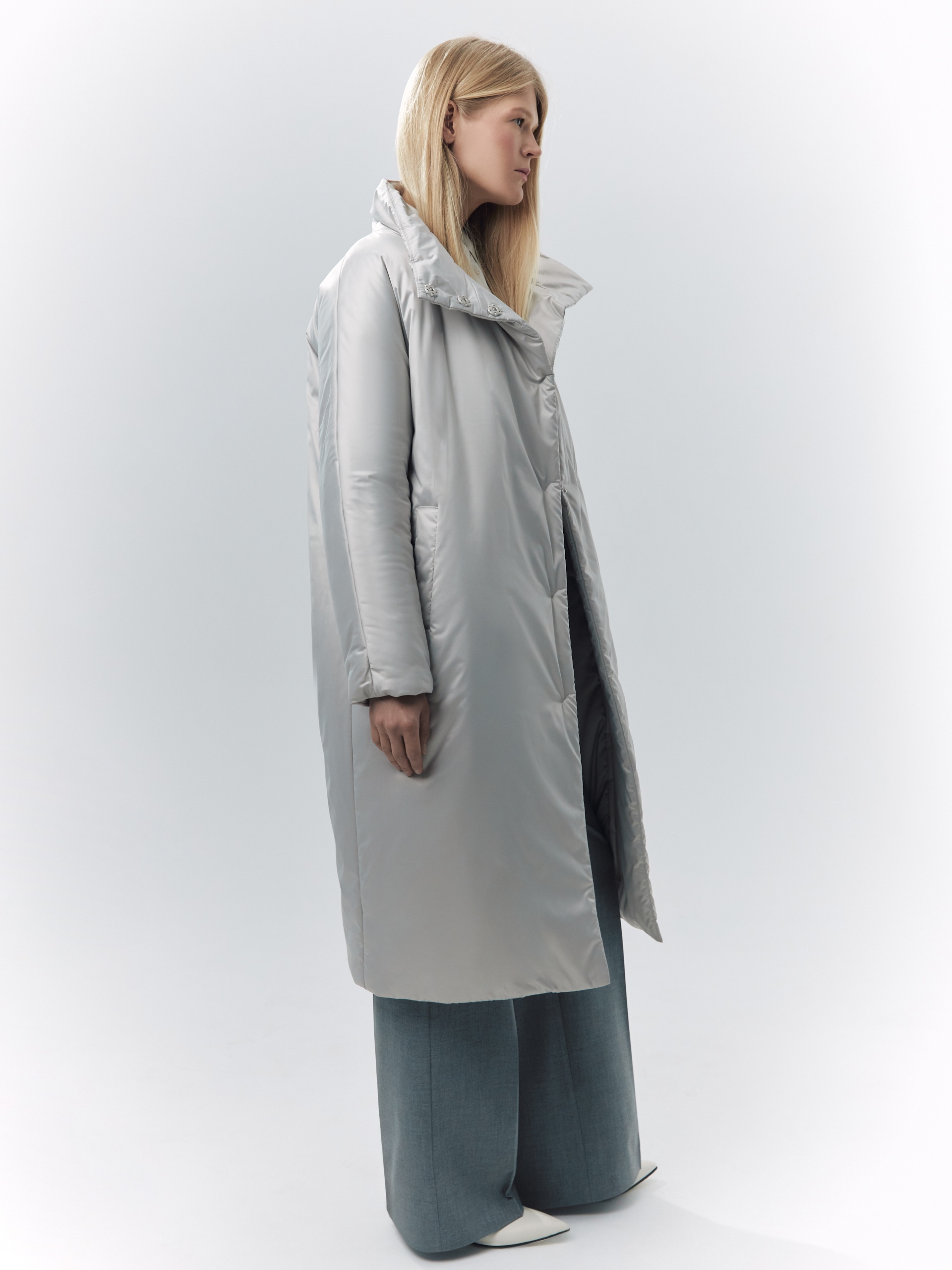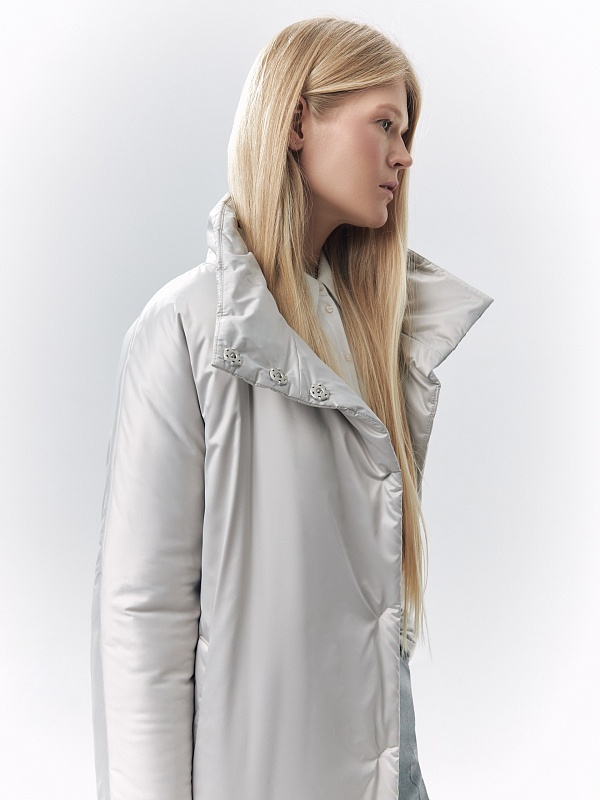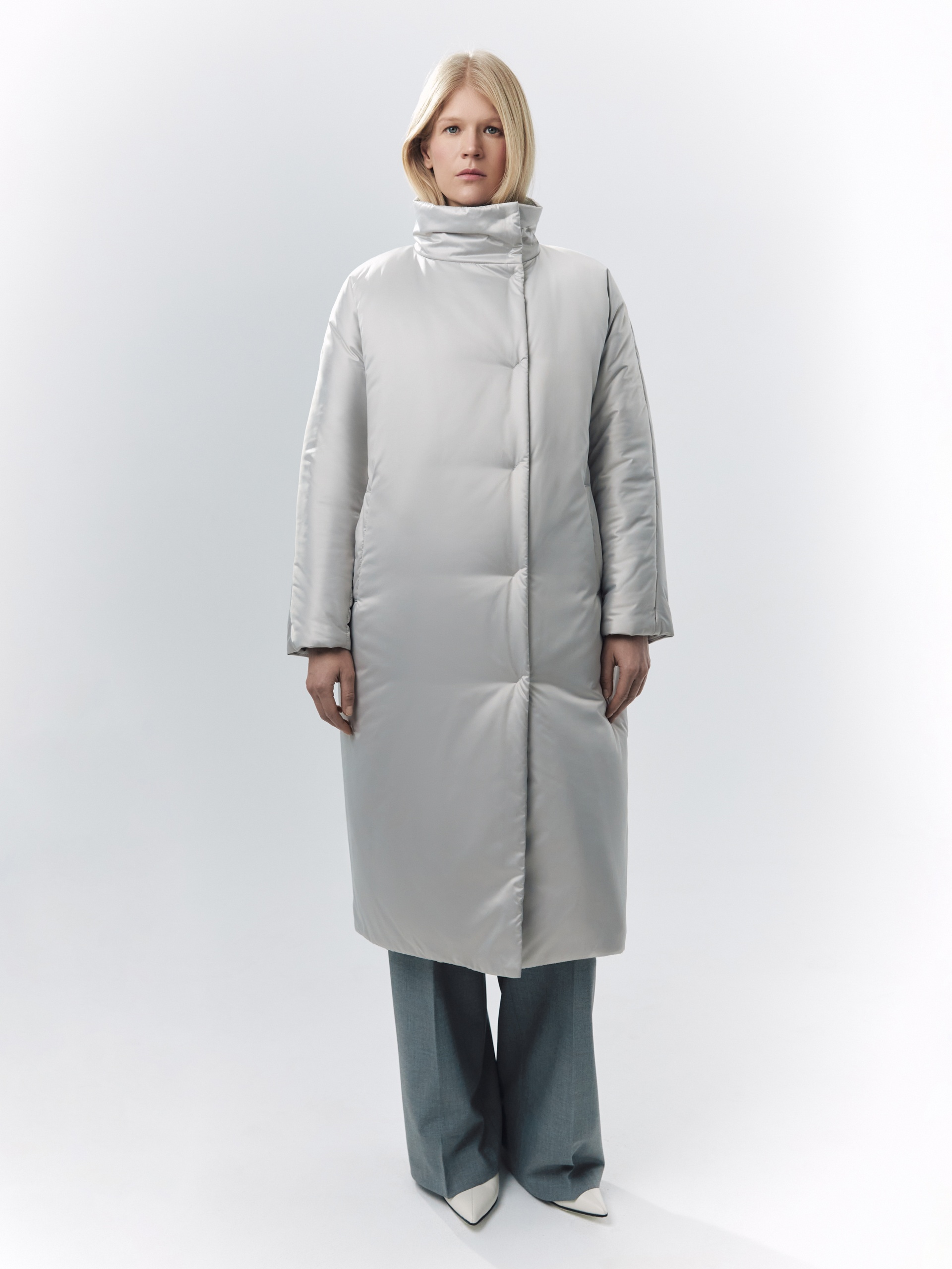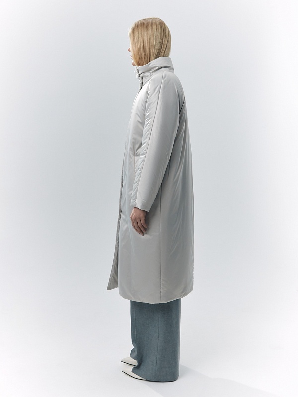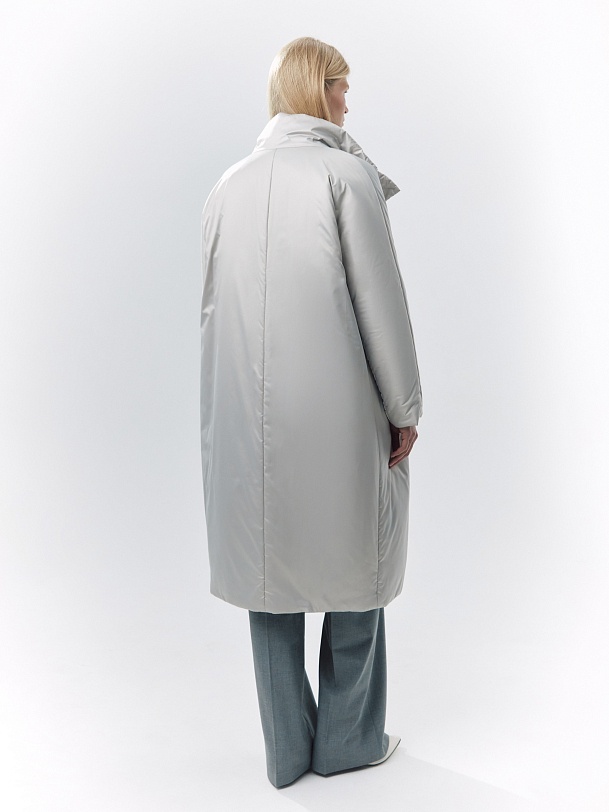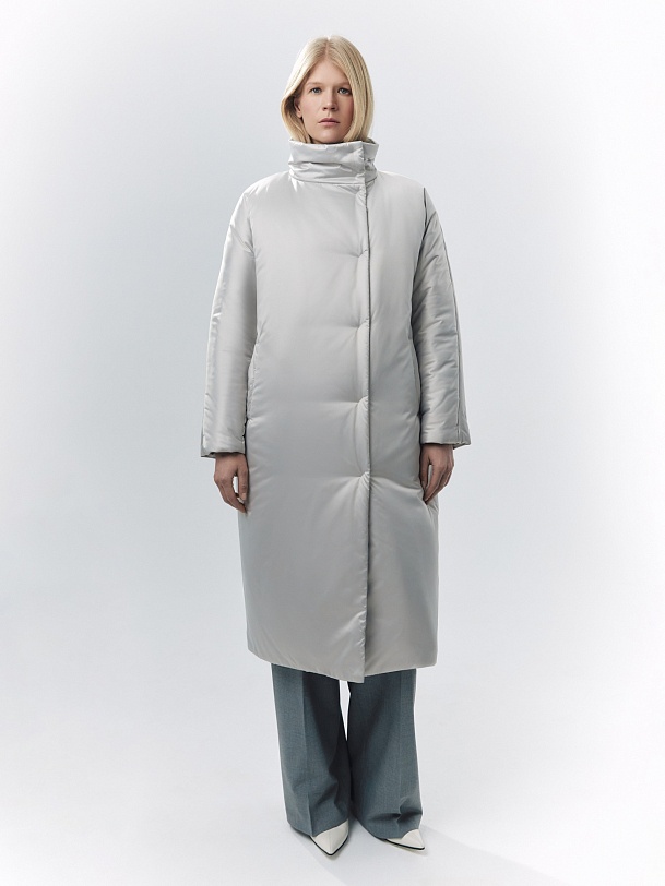 Пальто-пуховик силуэта "удлиненный кокон" из плащевой ткани холодного бежевого оттенка. Рукава-кимоно, воротник-стойка, карманы-листочки, центральная застёжка на кнопки. Произведено с мембраной Raft Pro. Утеплитель DuPont Sorona. Длина ниже колена.