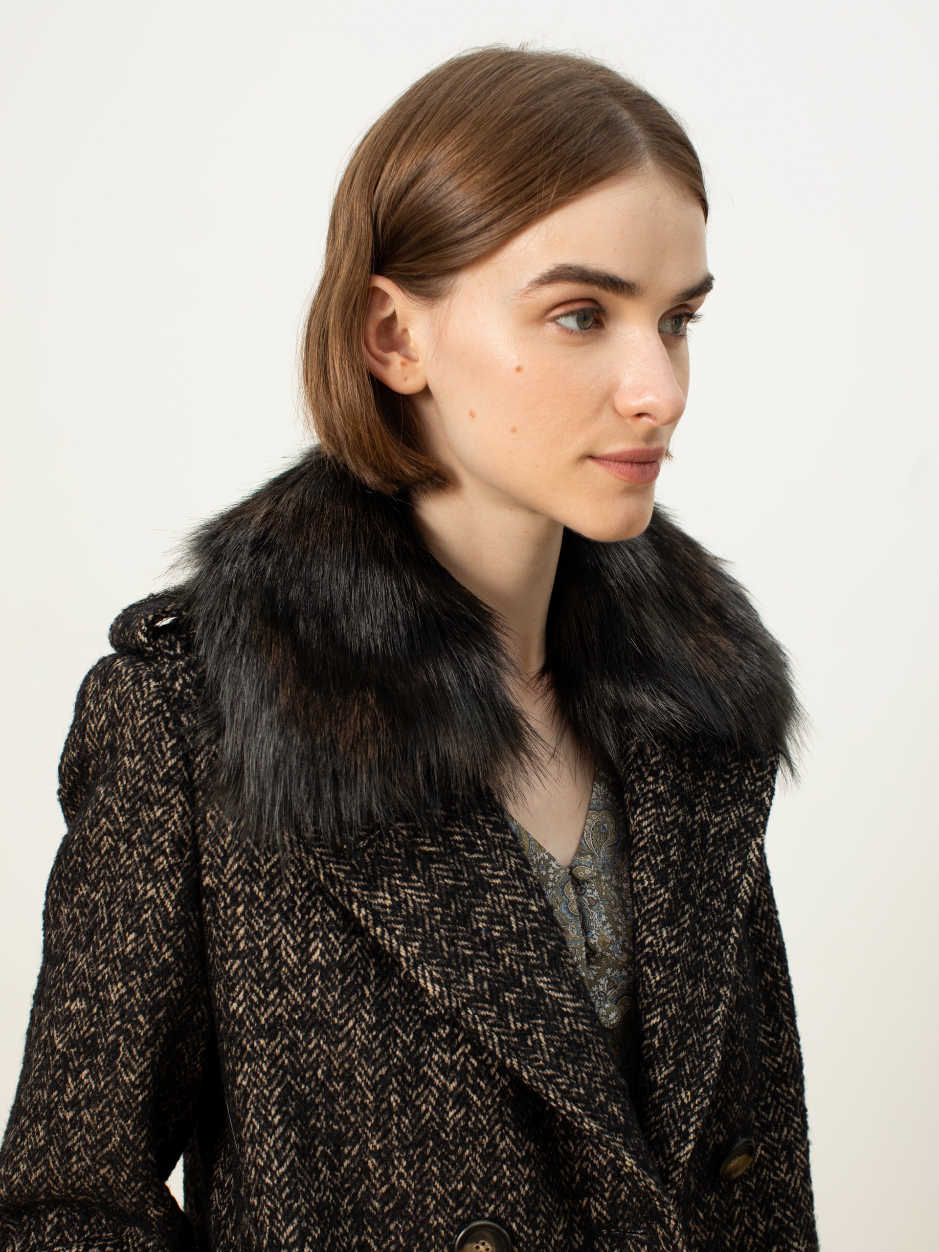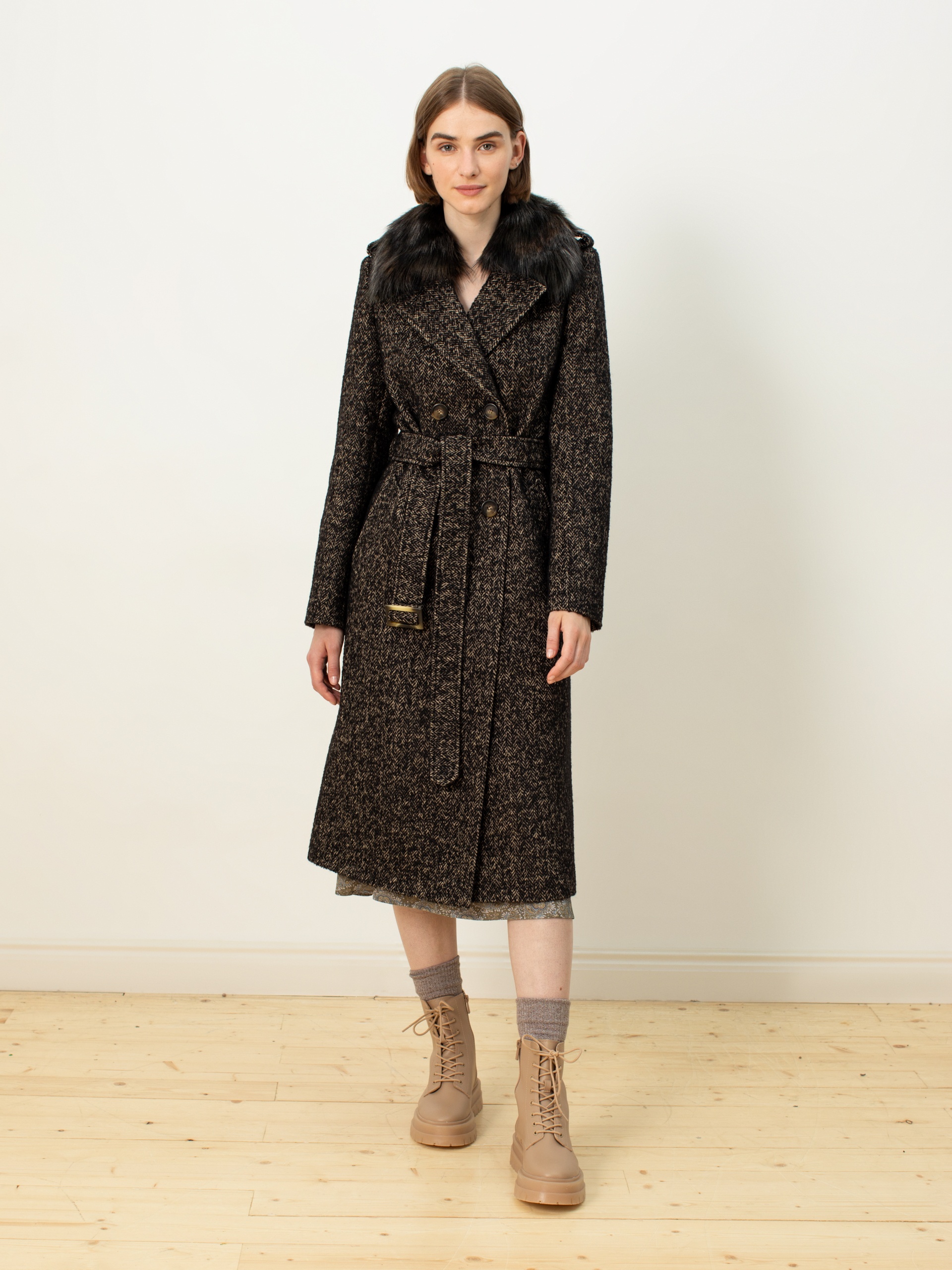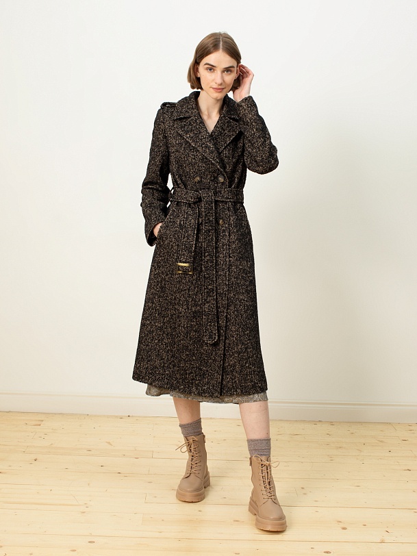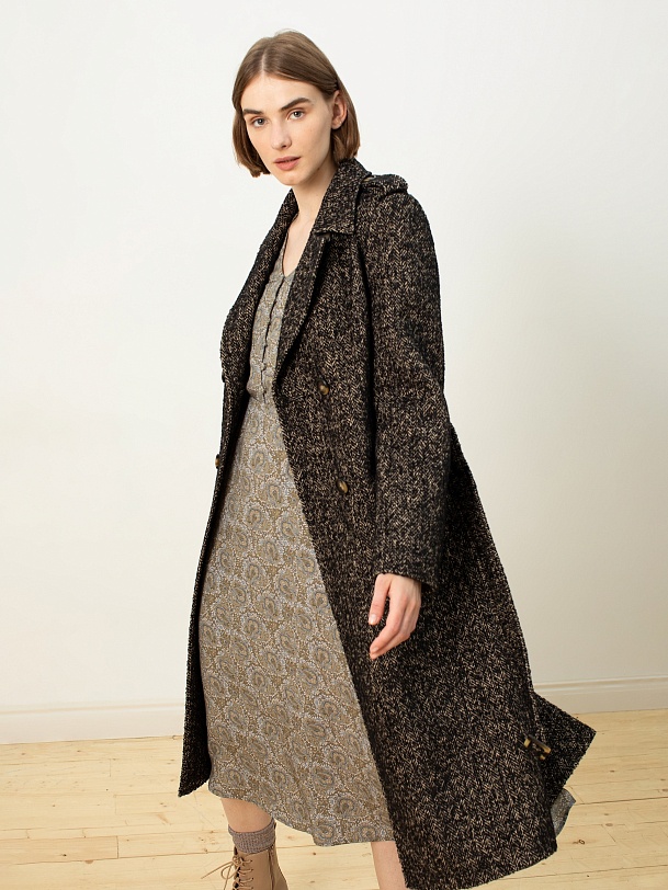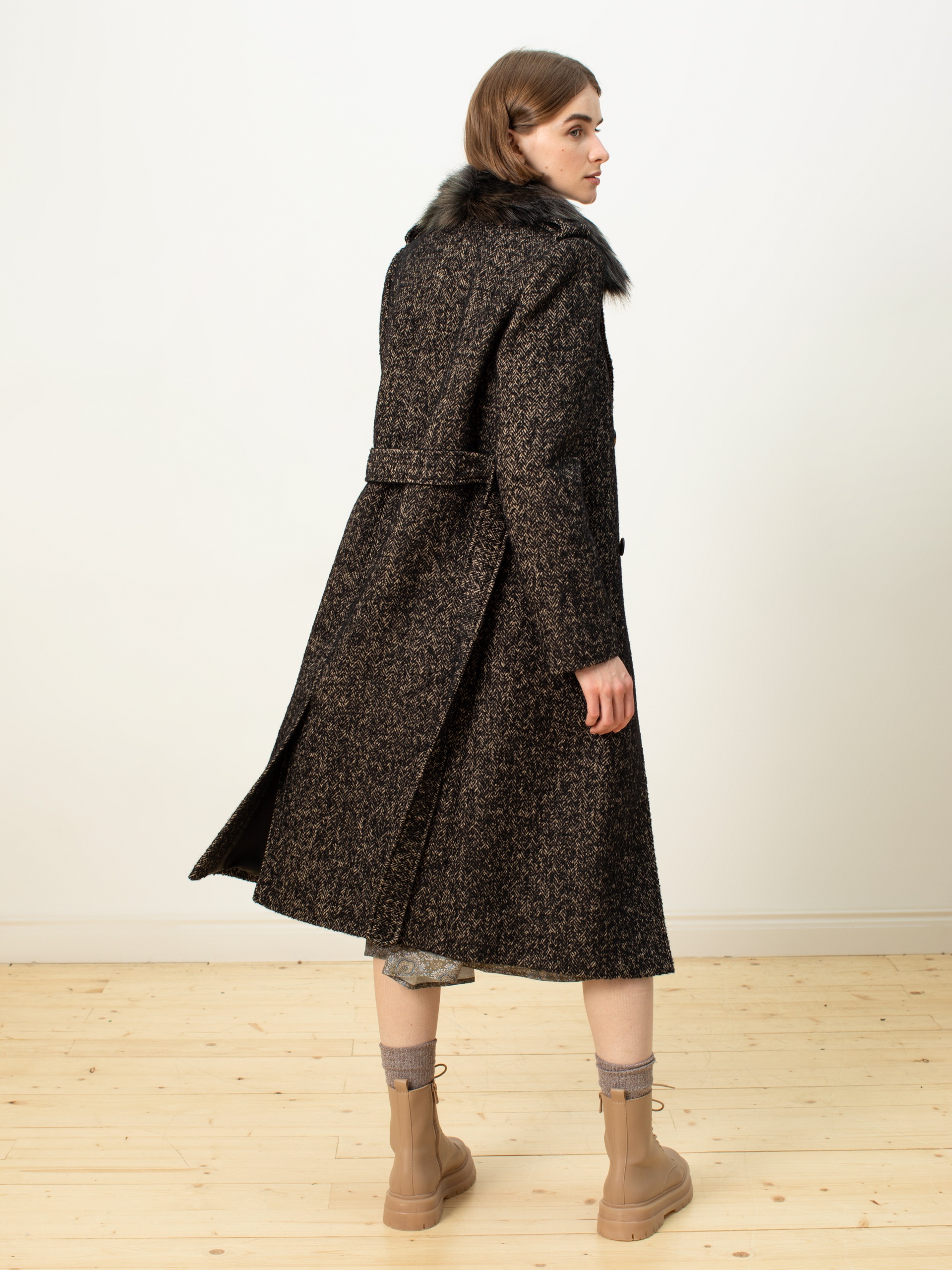 Роскошное пальто из твида с бежево-черным узором «елочка». Выполнено с технологией Raft Pro и утеплено по спинке.
