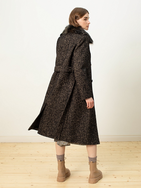 Роговые пуговицы, декоративная строчка, пояс из основной ткани, съемный воротник из искуственного меха